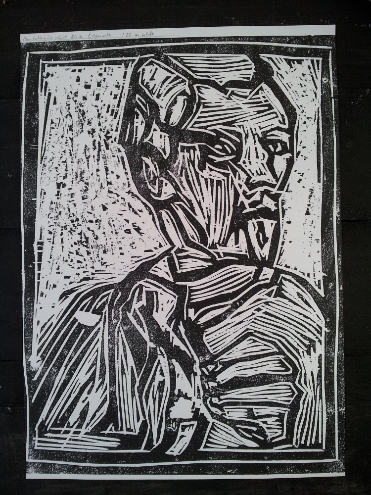 1/25 Man holding his shirt, black on white.