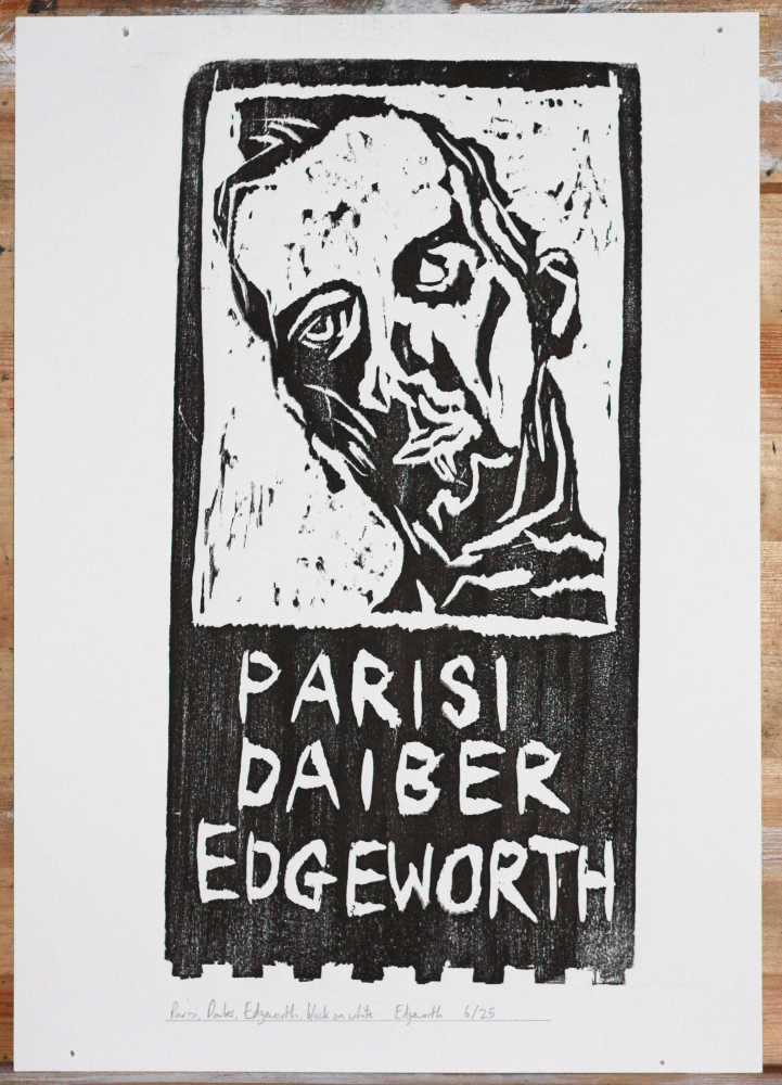 6/25 Parisi, Daiber, Edgeworth, black on white. Wood block print.