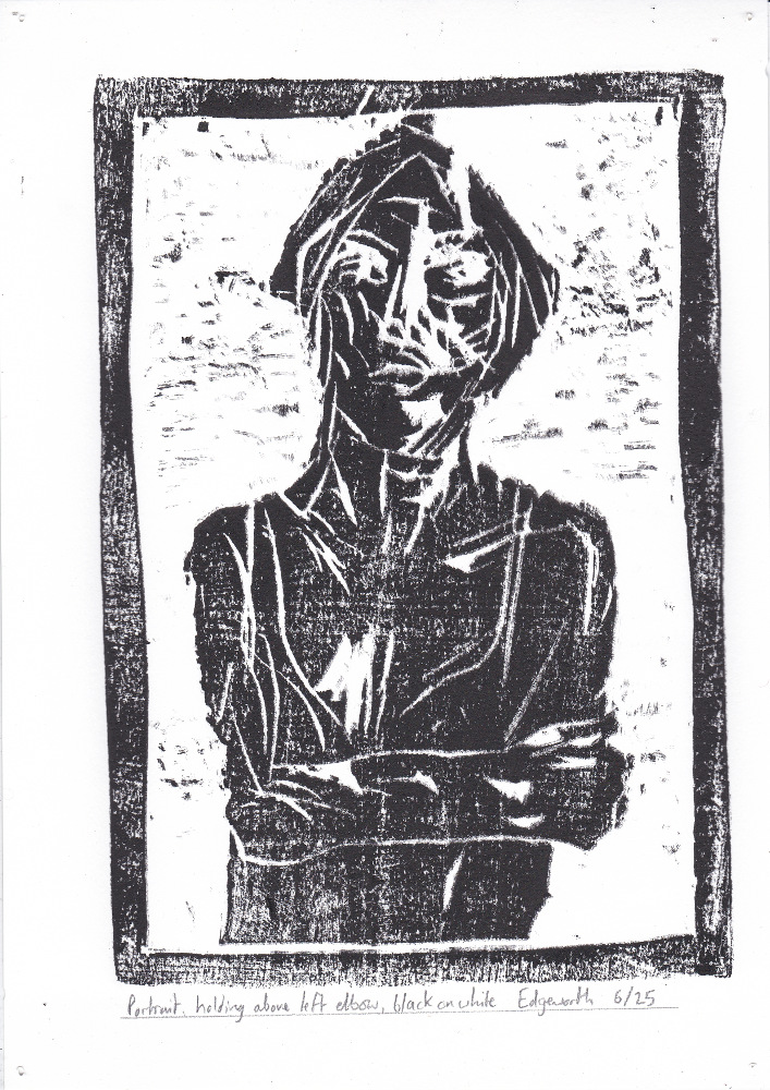 6/25 Portrait, holding above left elbow, black on white. Wood block print.