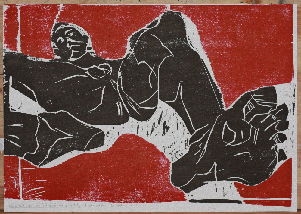 8/25 Self-portrait nude, lying back, foot forward, black body and red on white.