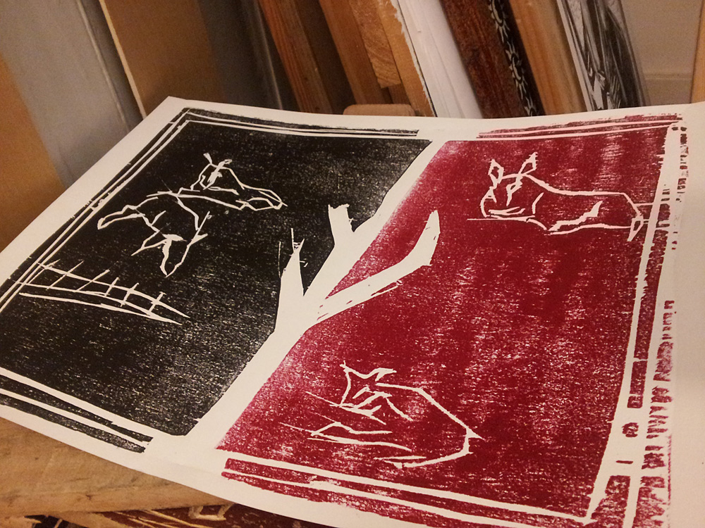 Pallets marked MB contain methyl bromide, a health hazard. I found one, but marked HT early this morning, round the back of Muswell Hill high street, so considered it safe to drag into the back garden, cut up into 10cm square squares, and start carving into DVD cover block prints. Whatever wood it is, I guess a soft pine, is ideal. Used an A4 pencil square drawing for the first image, an Elbow Sisters DVD cover. To go in my eventual online shop. May use the same print in L’ABC de la Peinture Paris cafe exhibition in March, dates for which are now confirmed: Thu 2nd March – Fri 17th March 2017.