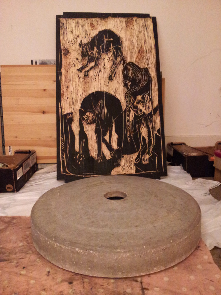 Carving up more of yesterdays toxin free pallet. Linocuts fallen by the wayside, at least those without light sketch marks. Tomorrow night is blackivory.org print club, where the only productive work I can do is edition printing, as it’s fairly mechanical and, unlike drawing, can cope with discussion, distraction and the not constant, but irregular interruption. Drawing, or anything more creative than print-factory work has to be done in preparation. Todays small wood blocks, are Album 1 Createspace inner sleeve art.