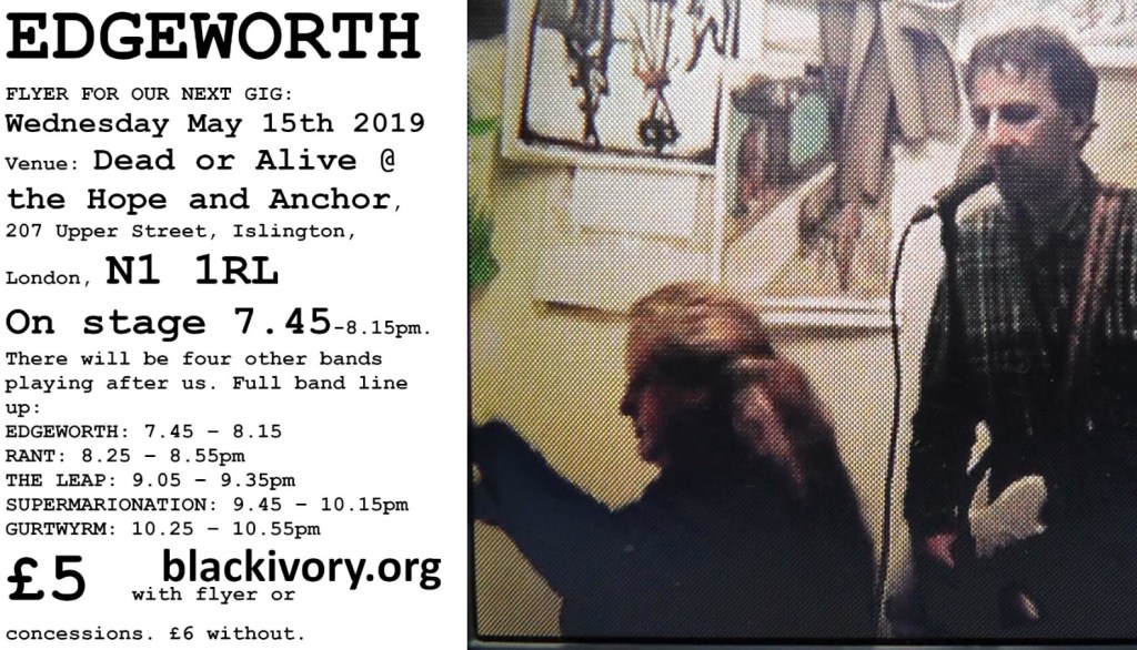 Venue: Dead or Alive @ the Hope and Anchor, 207 Upper Street, Islington, London, N1 1RL. On stage 7.45-8.15pm.