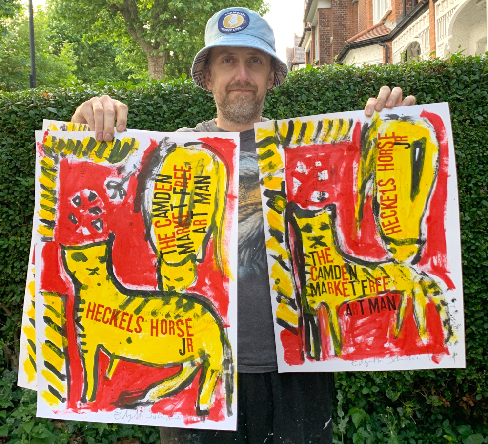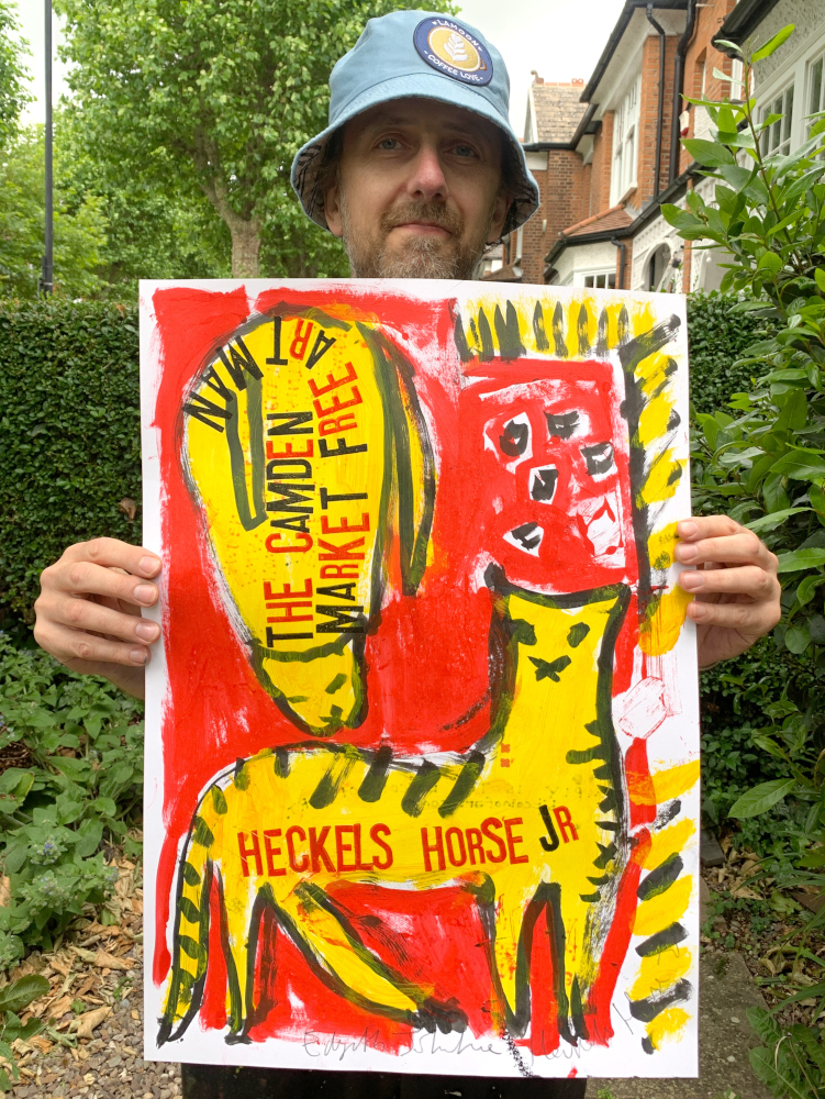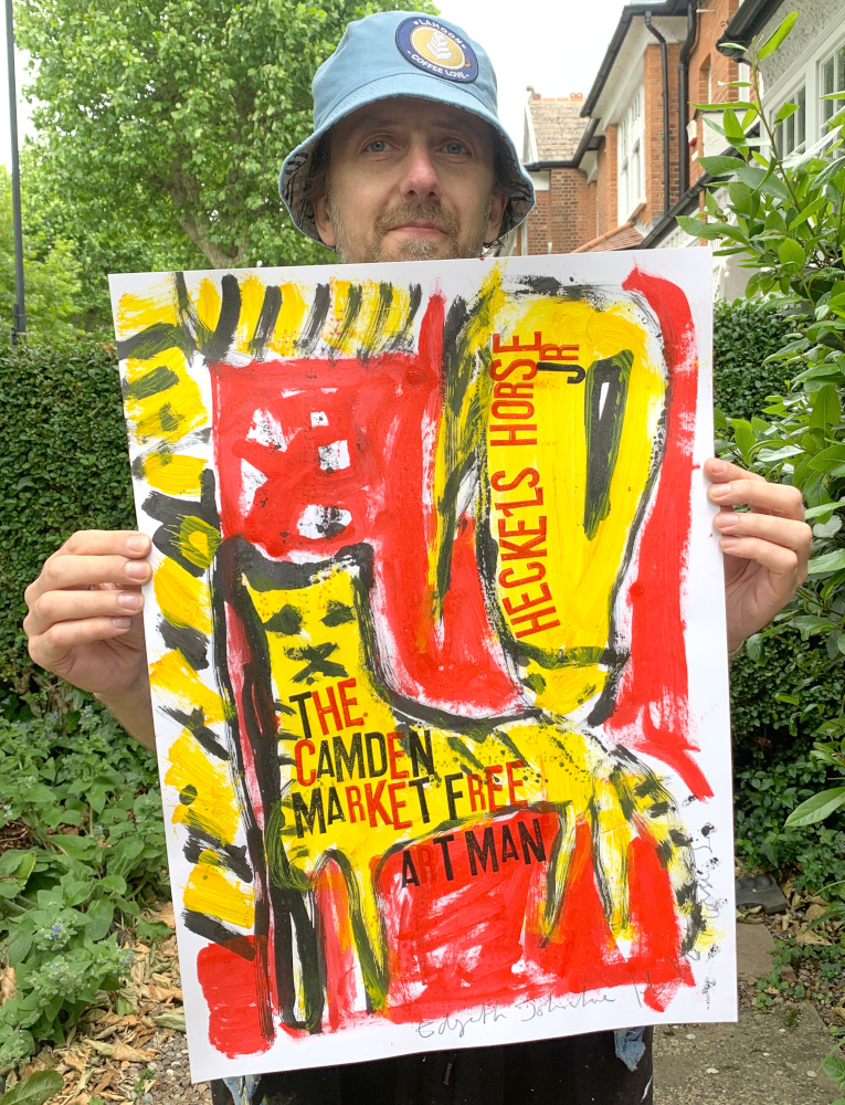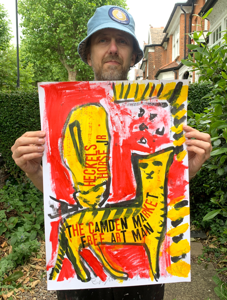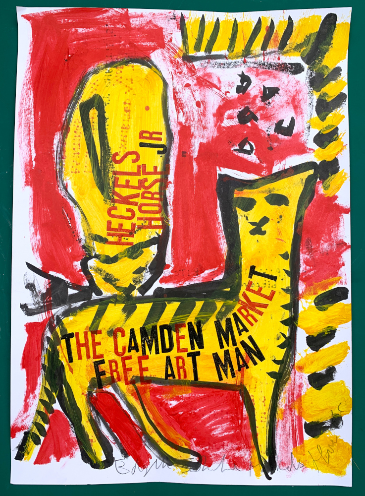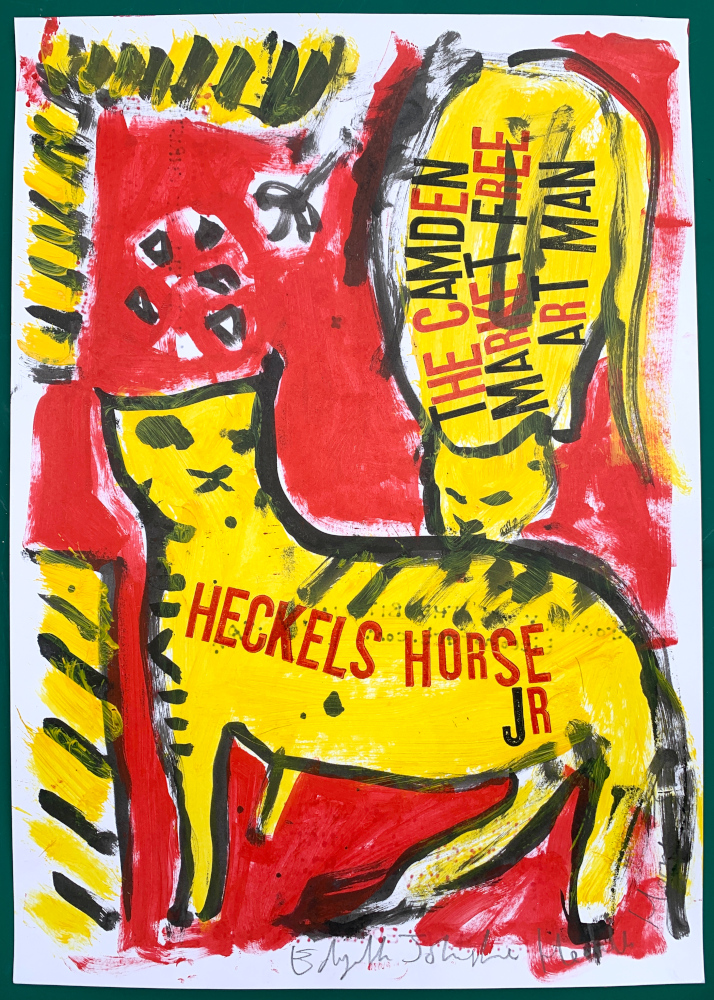 I’ve started a series of “Two Cats” paintings. Painted in black Indian ink and yellow and red acrylic on 300gsm thick acid free A2 size paper. Under one of my aliases Heckel’s Horse Jr. All HHJ paintings are after HH. The HH one is after Schmidt-Rottluff. Buy them in my Etsy shop. The first batch is of nine. I’m keeping the first three for now. Selling 4, 5 and 6 on Etsy. Giving 7, 8 and 9 away at my The Camden Market Free Art Man Political Demonstration Against Expensive Art.