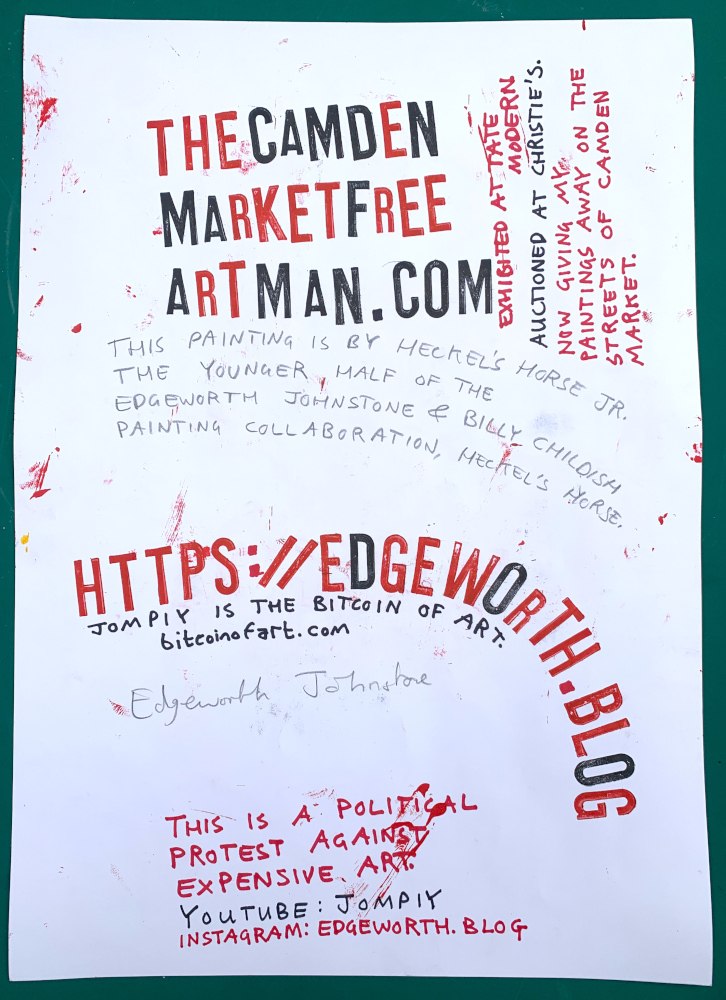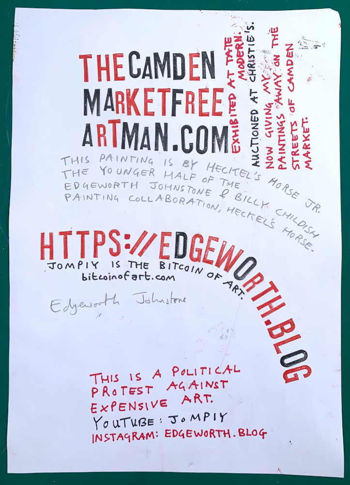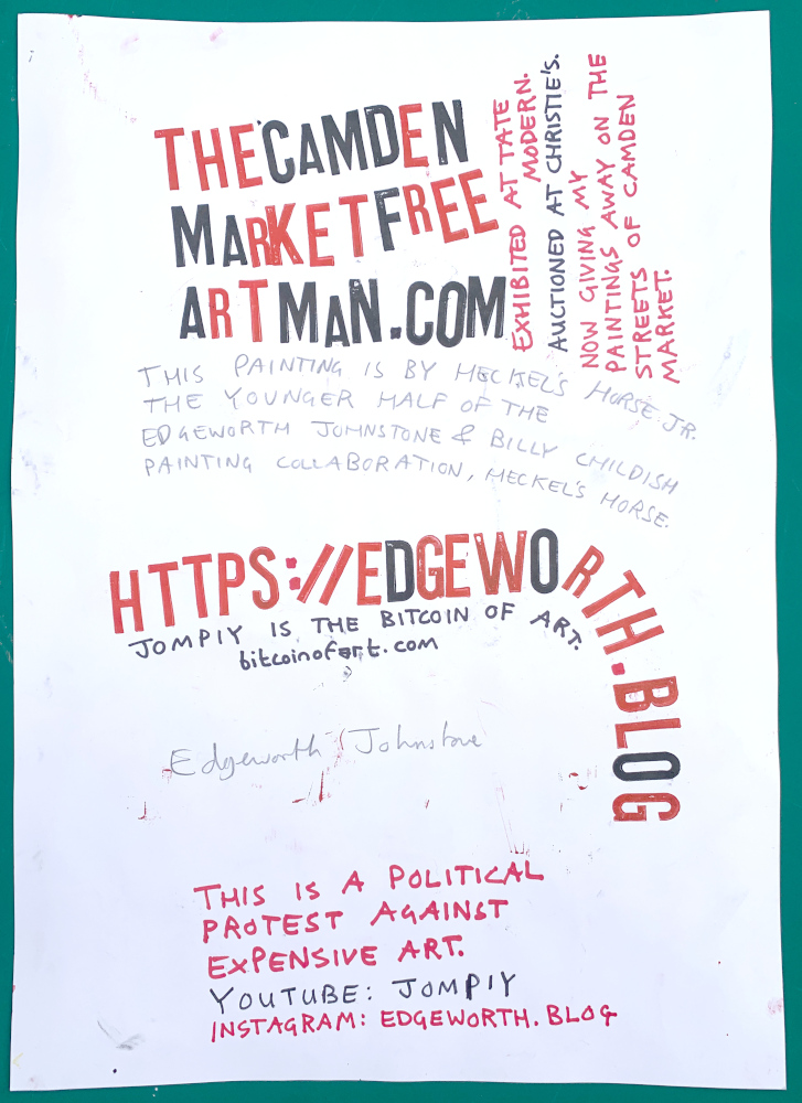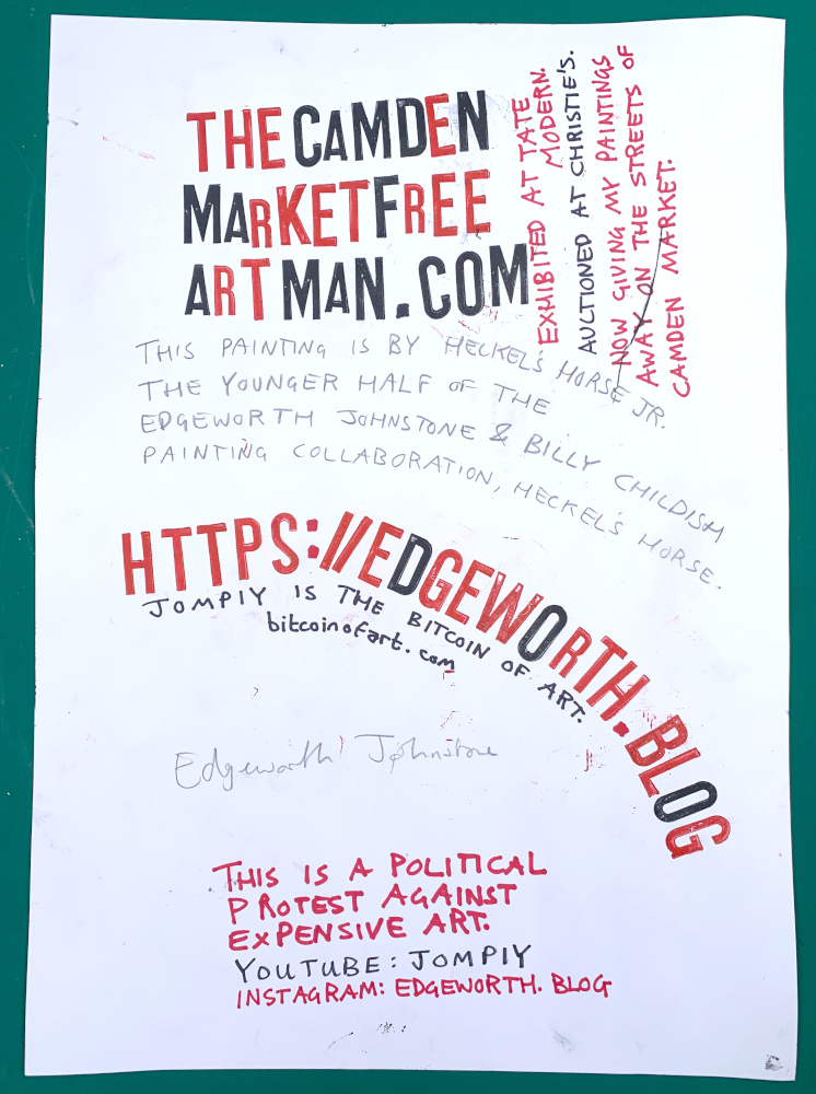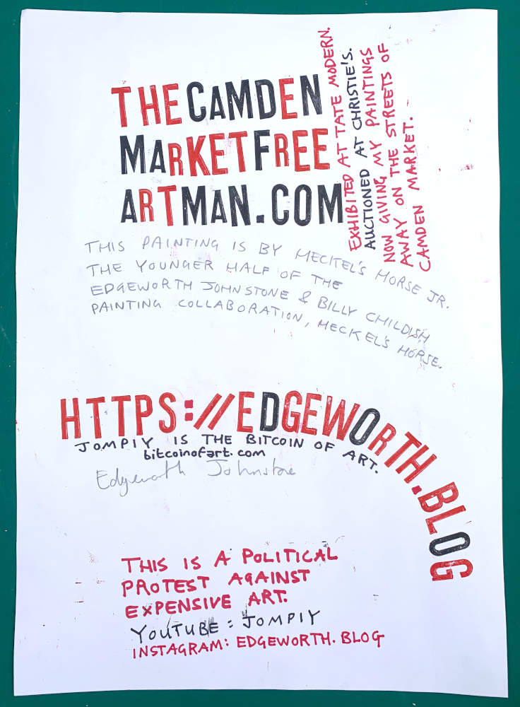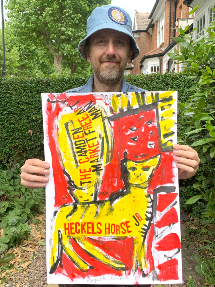 I’ve started a series of “Two Cats” paintings. Painted in black Indian ink and yellow and red acrylic on 300gsm thick acid free A2 size paper. Under one of my aliases Heckel’s Horse Jr. All HHJ paintings are after HH. The HH one is after Schmidt-Rottluff. Buy them in my Etsy shop. The first batch is of nine. I’m keeping the first three for now. Selling 4, 5 and 6 on Etsy. Giving 7, 8 and 9 away at my The Camden Market Free Art Man Political Demonstration Against Expensive Art.