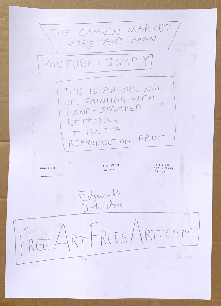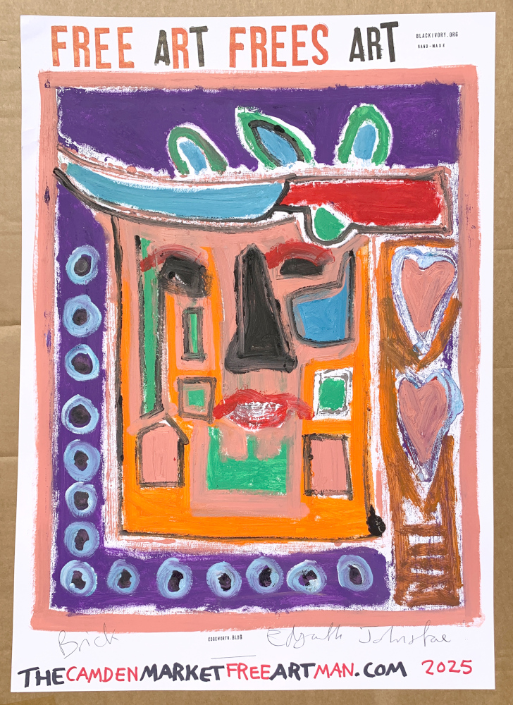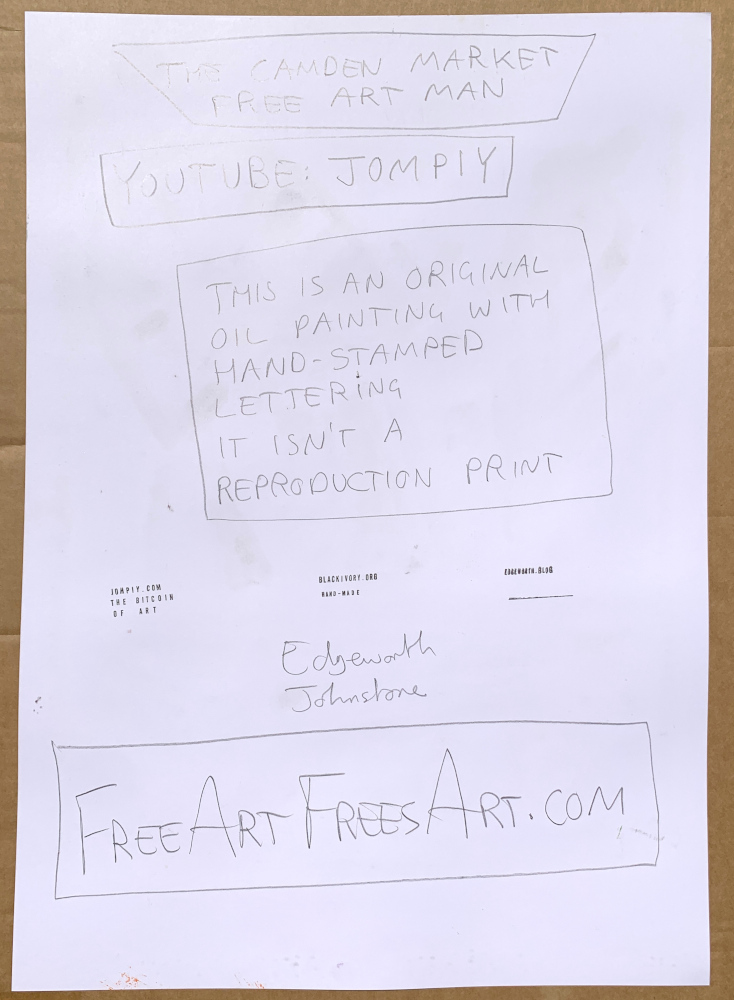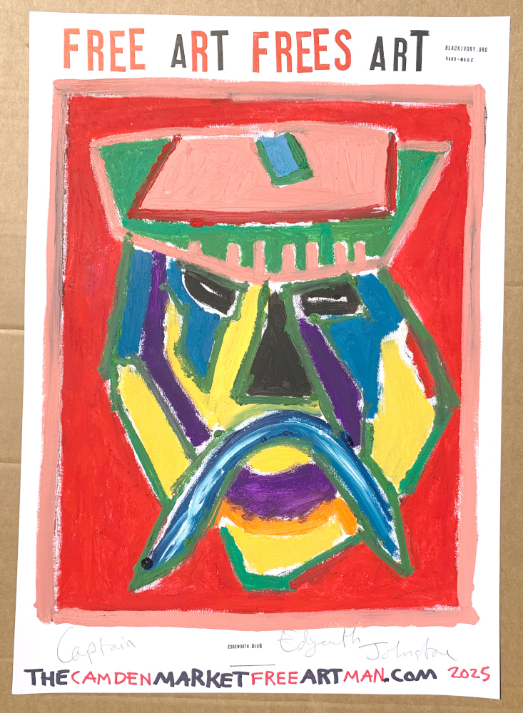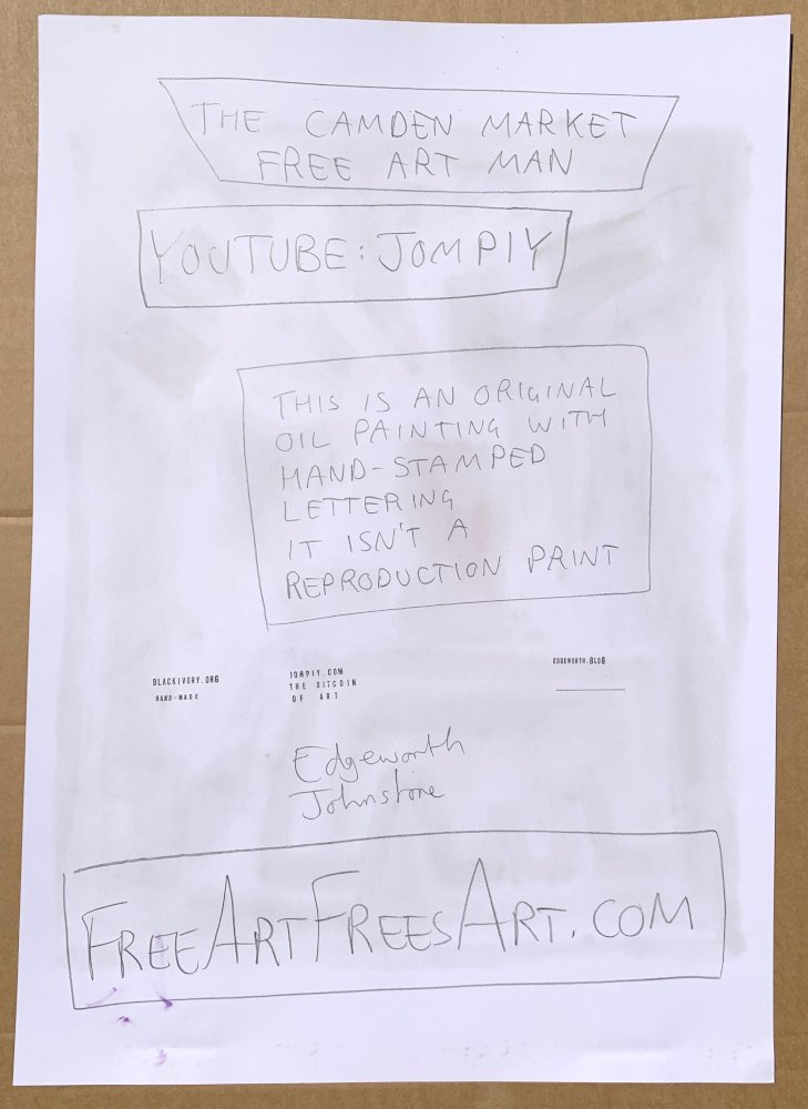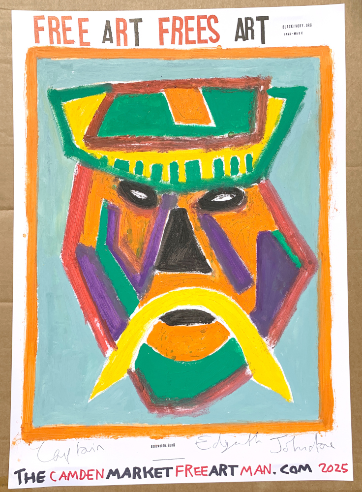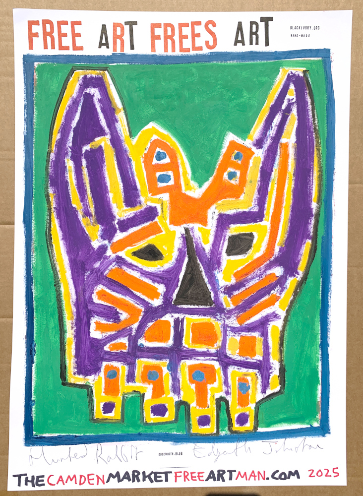 Batch 2 of the Masks paintings are on 300gsm paper, and have a lot more writing and stamping on the back than batch 1. 25 paintings in batch 2. Some will go in my Etsy shop, but most will be given away at The Camden Market Free Art Man Political Protest Against Expensive Art. These paintings are of the masks I made and wore in some home-made films. Most recently with Ron Throop, although this one isn’t published yet.