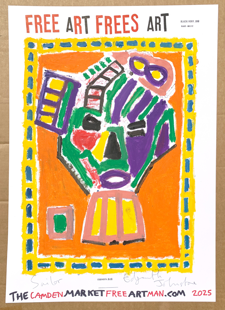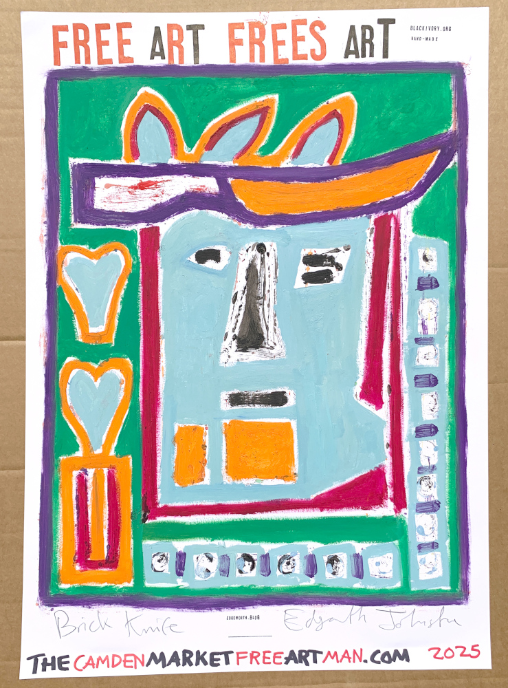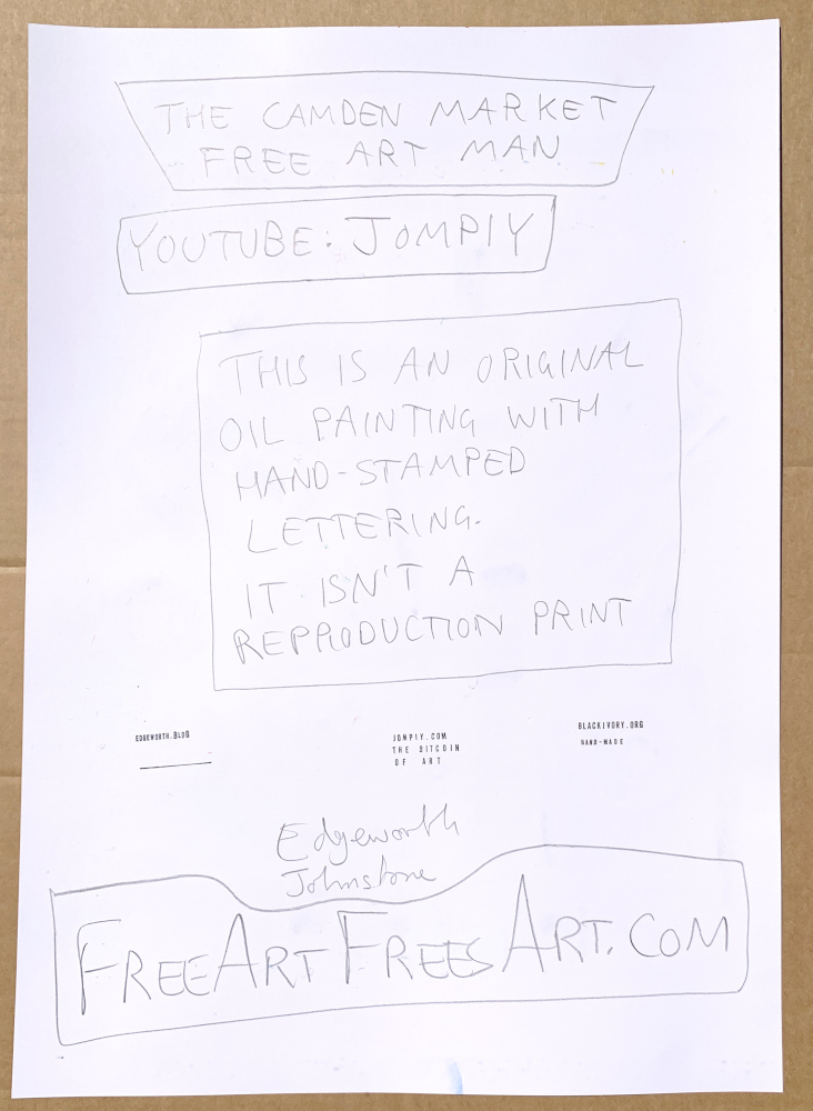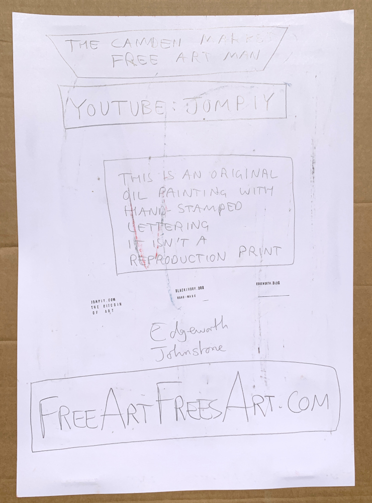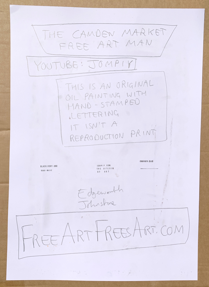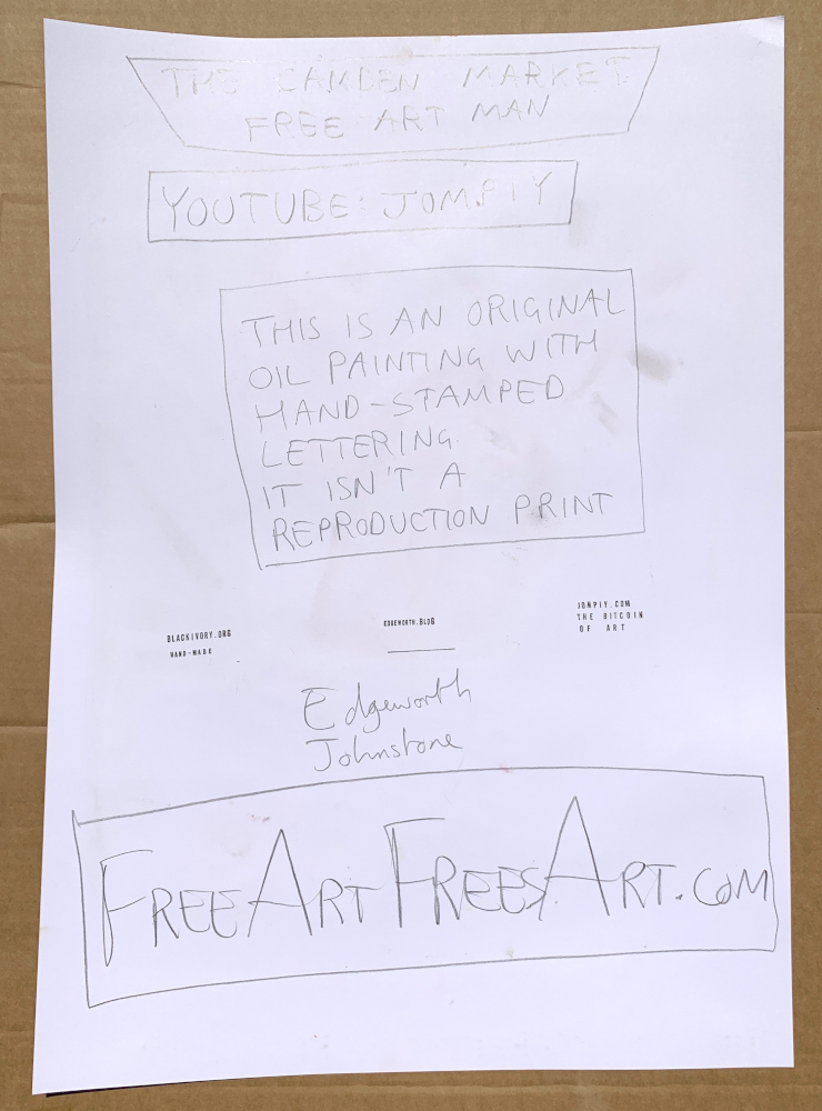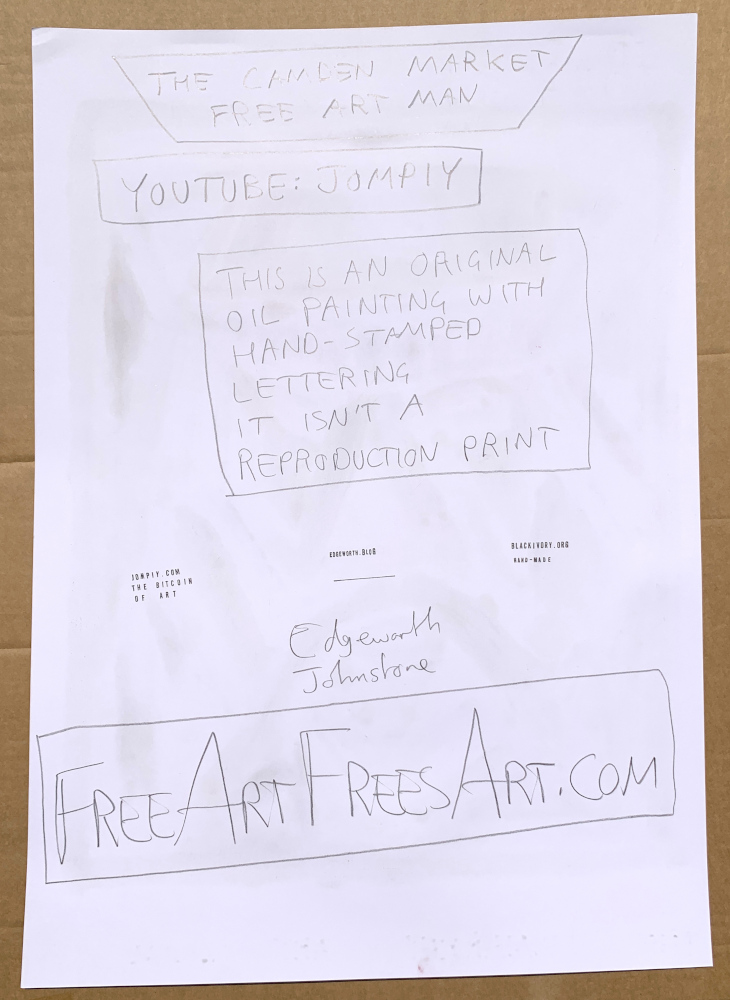 Batch 2 of the Masks paintings are on 300gsm paper, and have a lot more writing and stamping on the back than batch 1. 25 paintings in batch 2. Some will go in my Etsy shop, but most will be given away at The Camden Market Free Art Man Political Protest Against Expensive Art. These paintings are of the masks I made and wore in some home-made films. Most recently with Ron Throop, although this one isn’t published yet.
