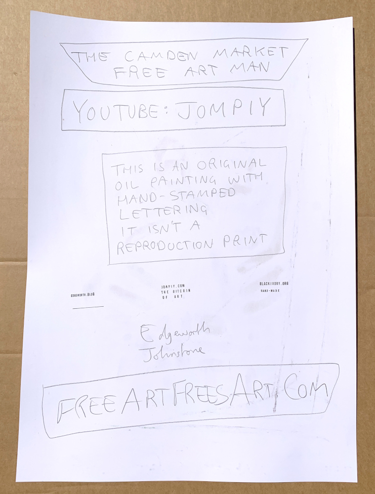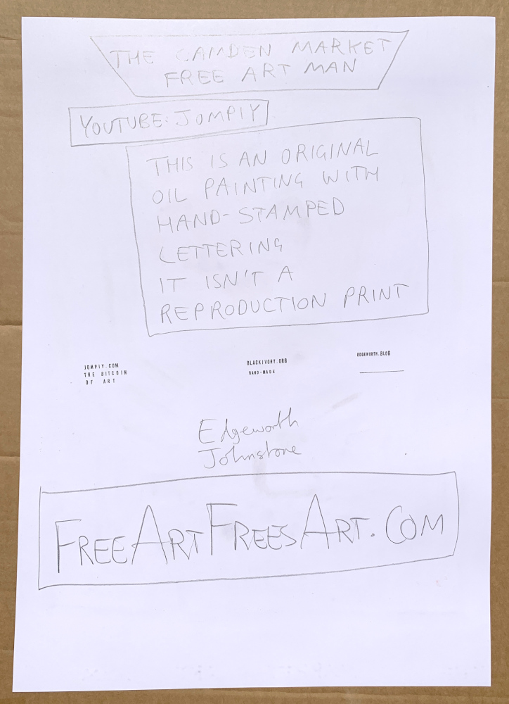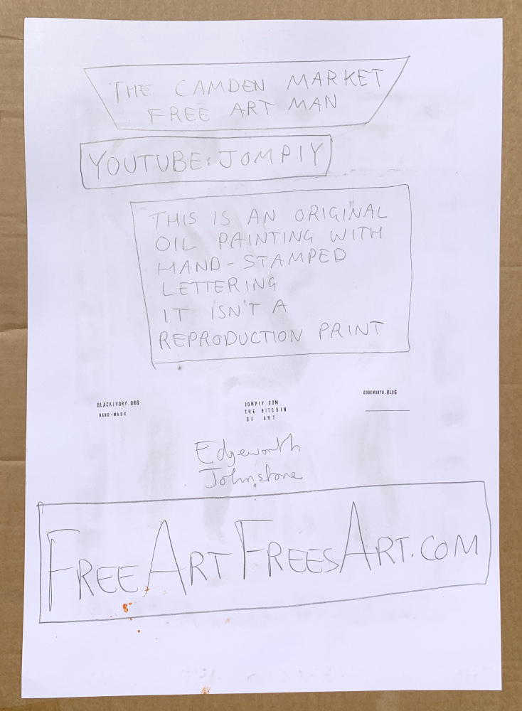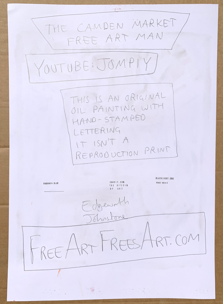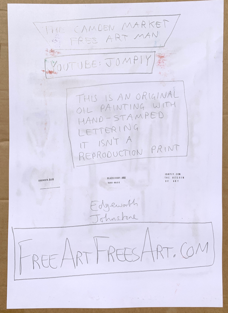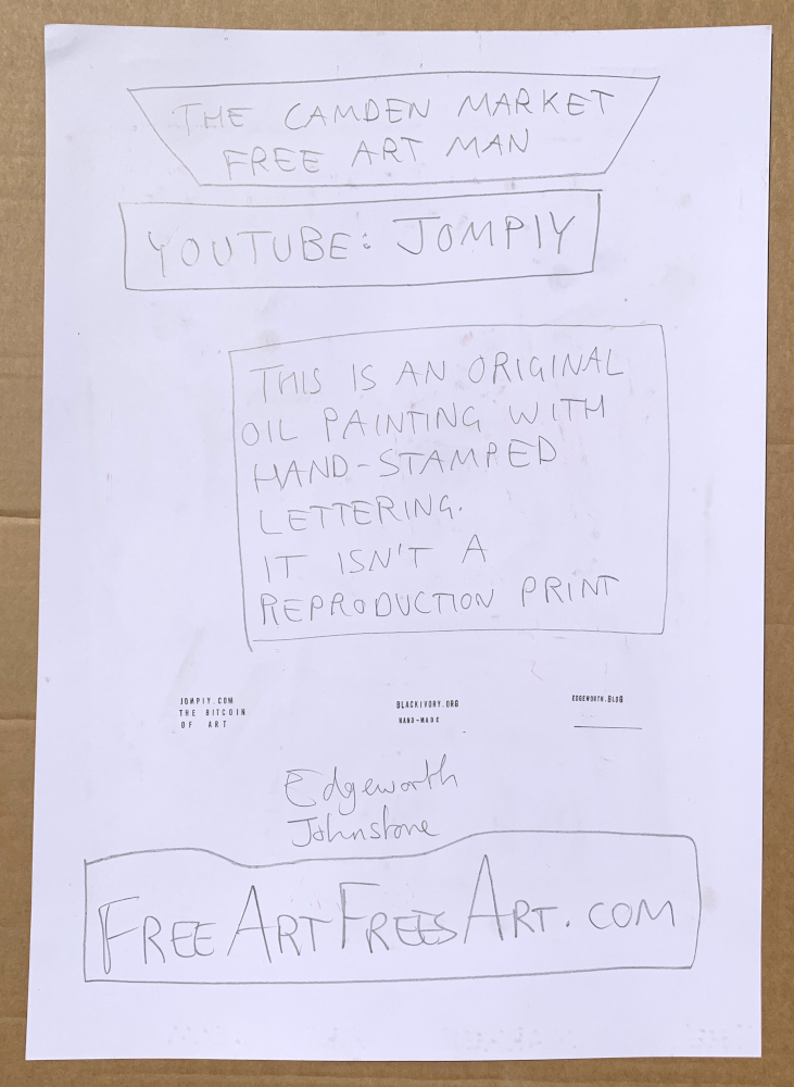 Batch 2 of the Masks paintings are on 300gsm paper, and have a lot more writing and stamping on the back than batch 1. 25 paintings in batch 2. Some will go in my Etsy shop, but most will be given away at The Camden Market Free Art Man Political Protest Against Expensive Art. These paintings are of the masks I made and wore in some home-made films. Most recently with Ron Throop, although this one isn’t published yet.