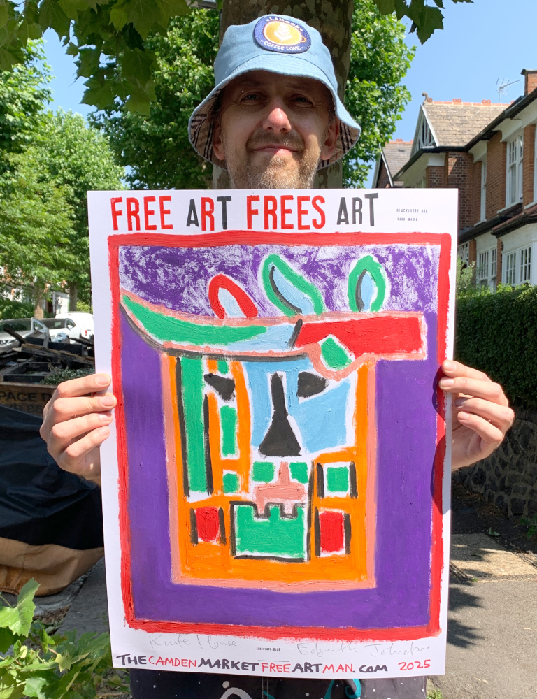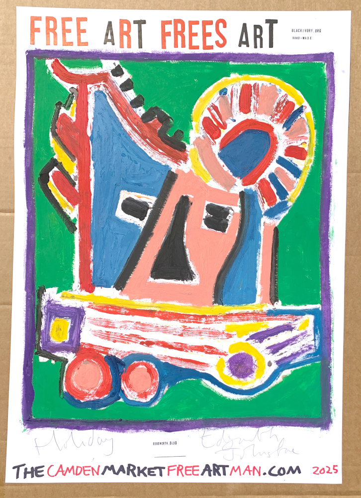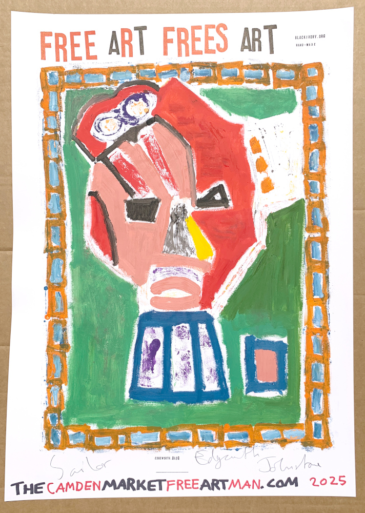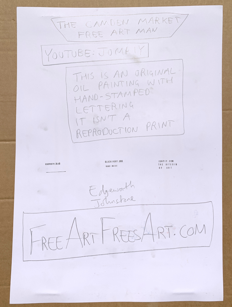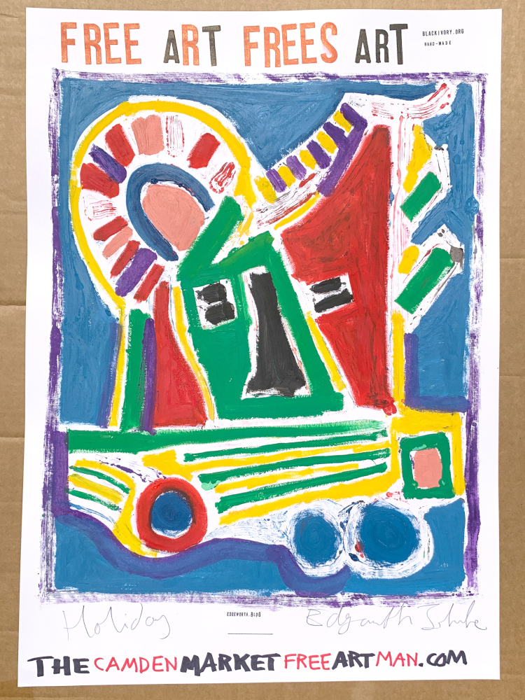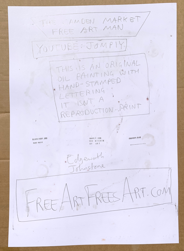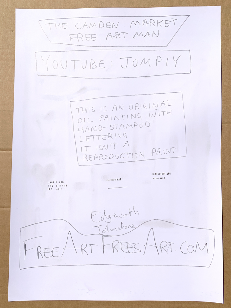 Batch 2 of the Masks paintings are on 300gsm paper, and have a lot more writing and stamping on the back than batch 1. 25 paintings in batch 2. Some will go in my Etsy shop, but most will be given away at The Camden Market Free Art Man Political Protest Against Expensive Art. These paintings are of the masks I made and wore in some home-made films. Most recently with Ron Throop, although this one isn’t published yet.