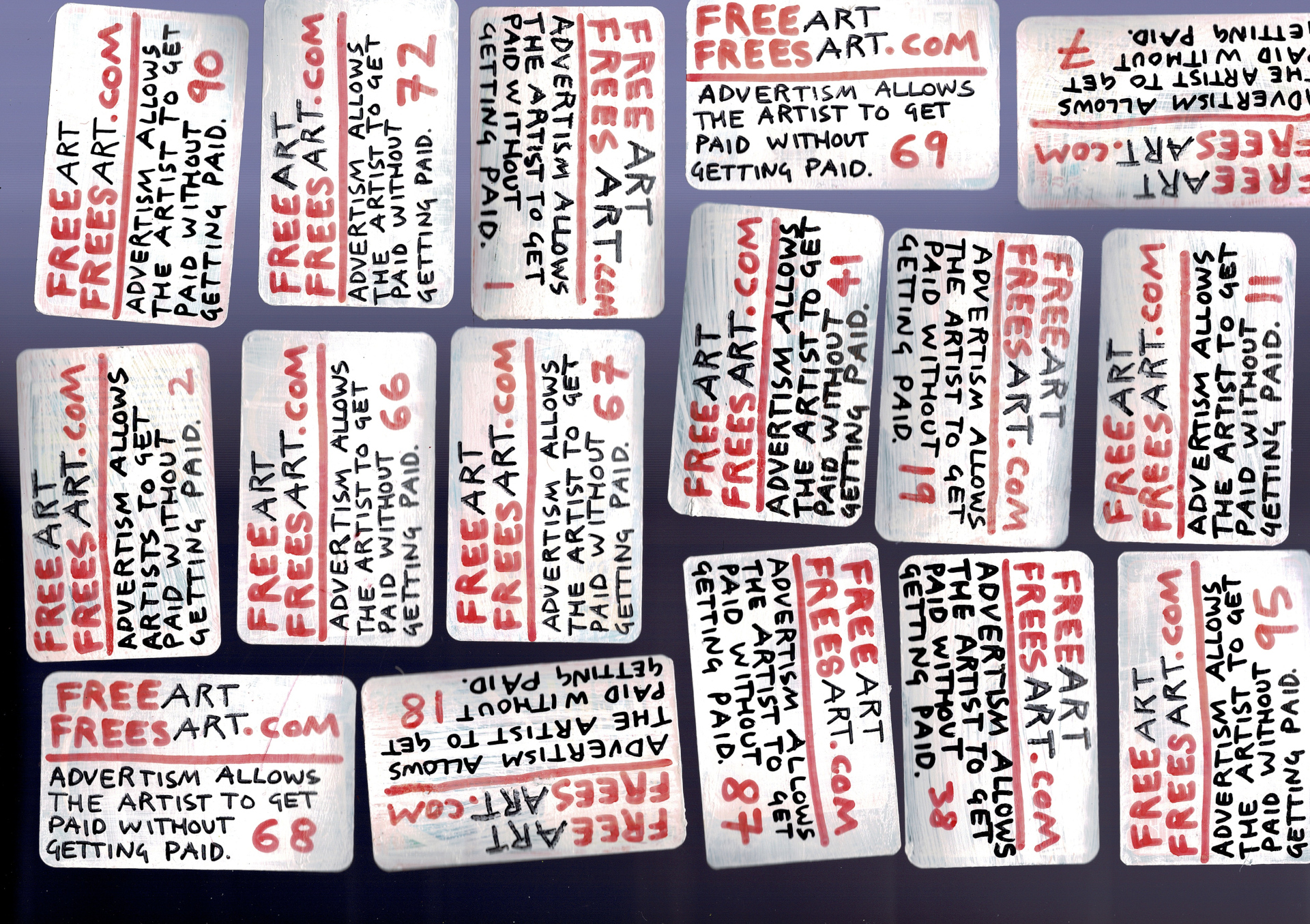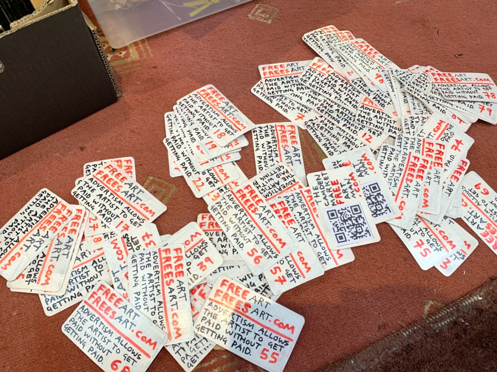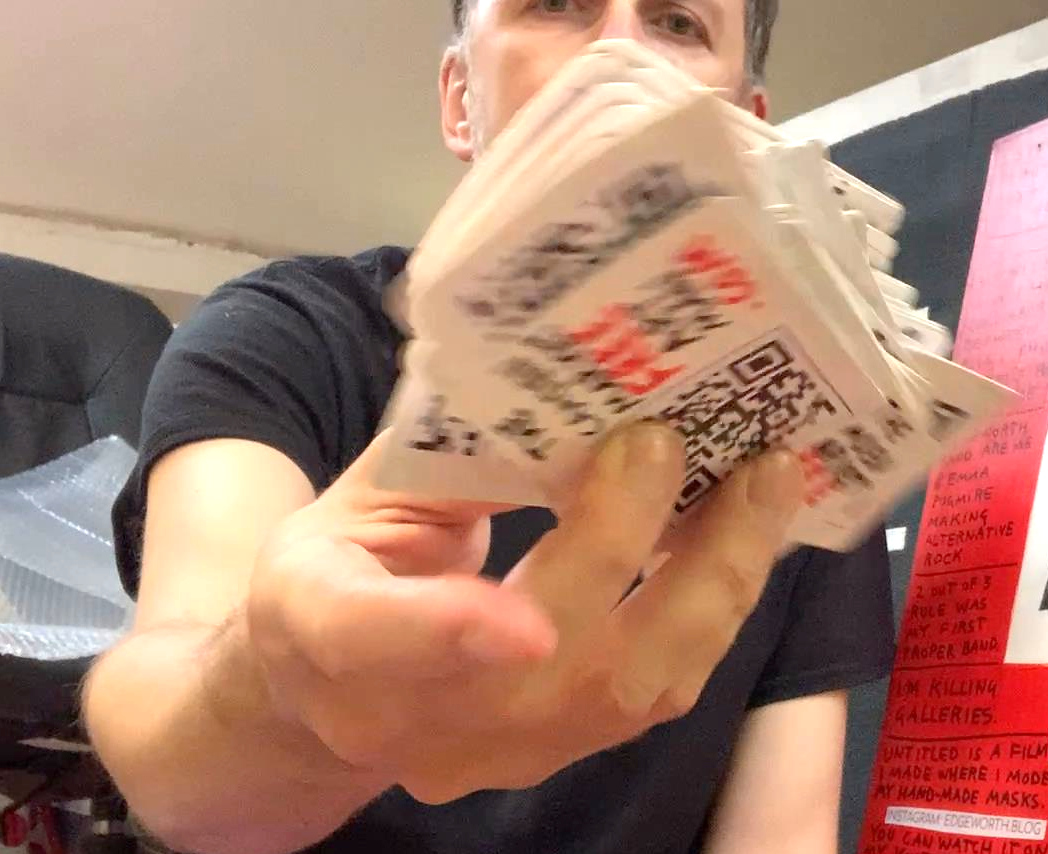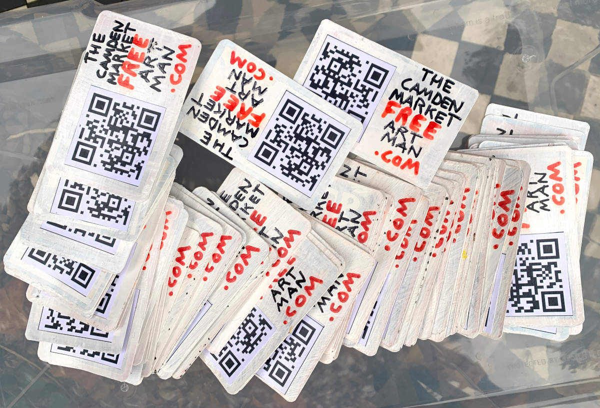 Hand made business cards I’ll be giving out at Camden and selling in my Ebay and my Etsy shops. I made them from Top Trump cards I bought at charity shops. 100 so far. They’re all numbered, so if you want a low number get in early. Forge proof as each is documented in detail in the photos and video on this page. Top Trump card triple-primed, black and red permanent marker pen, PVA glued over the top to protect. So the permanent maker won’t rub off as a layer of glue sits over it. QR code links to my blog.