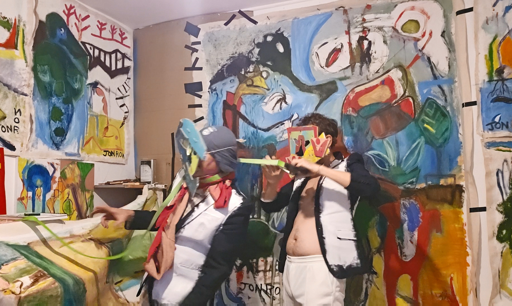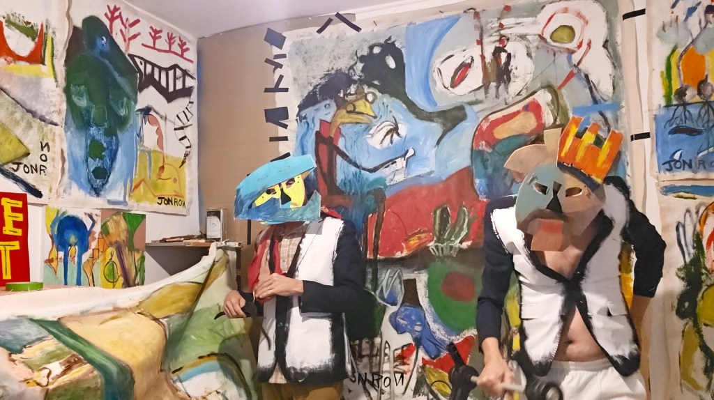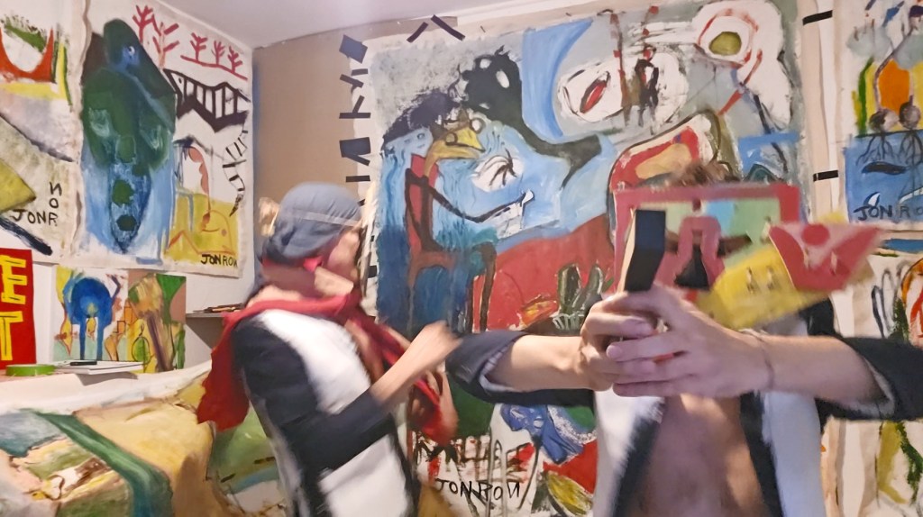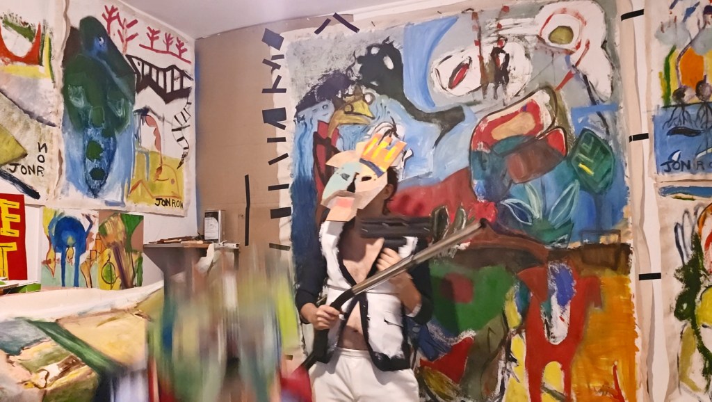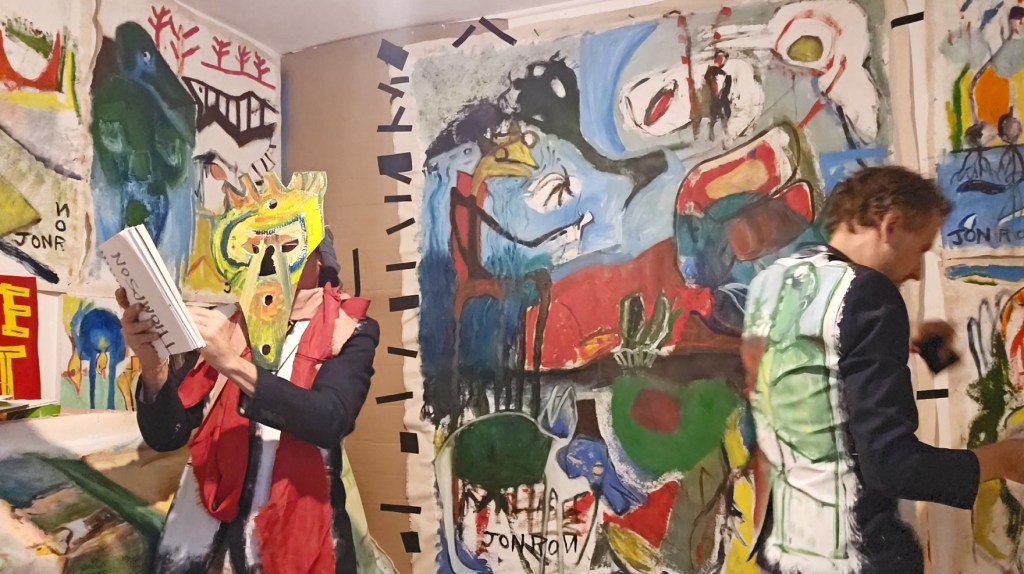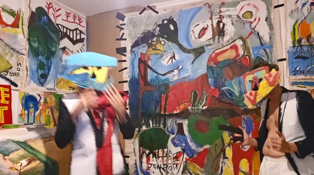 Jonron in Masks at Black Ivory, surrounded by Jonron paintings.