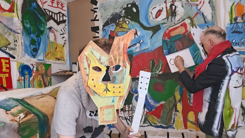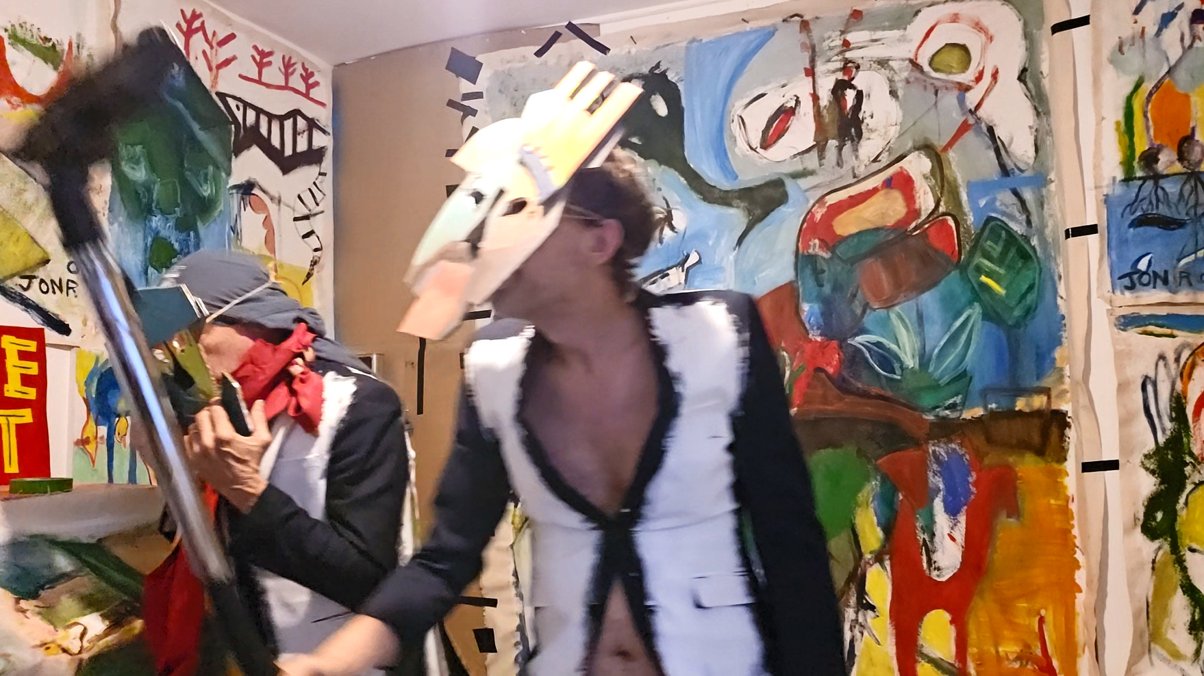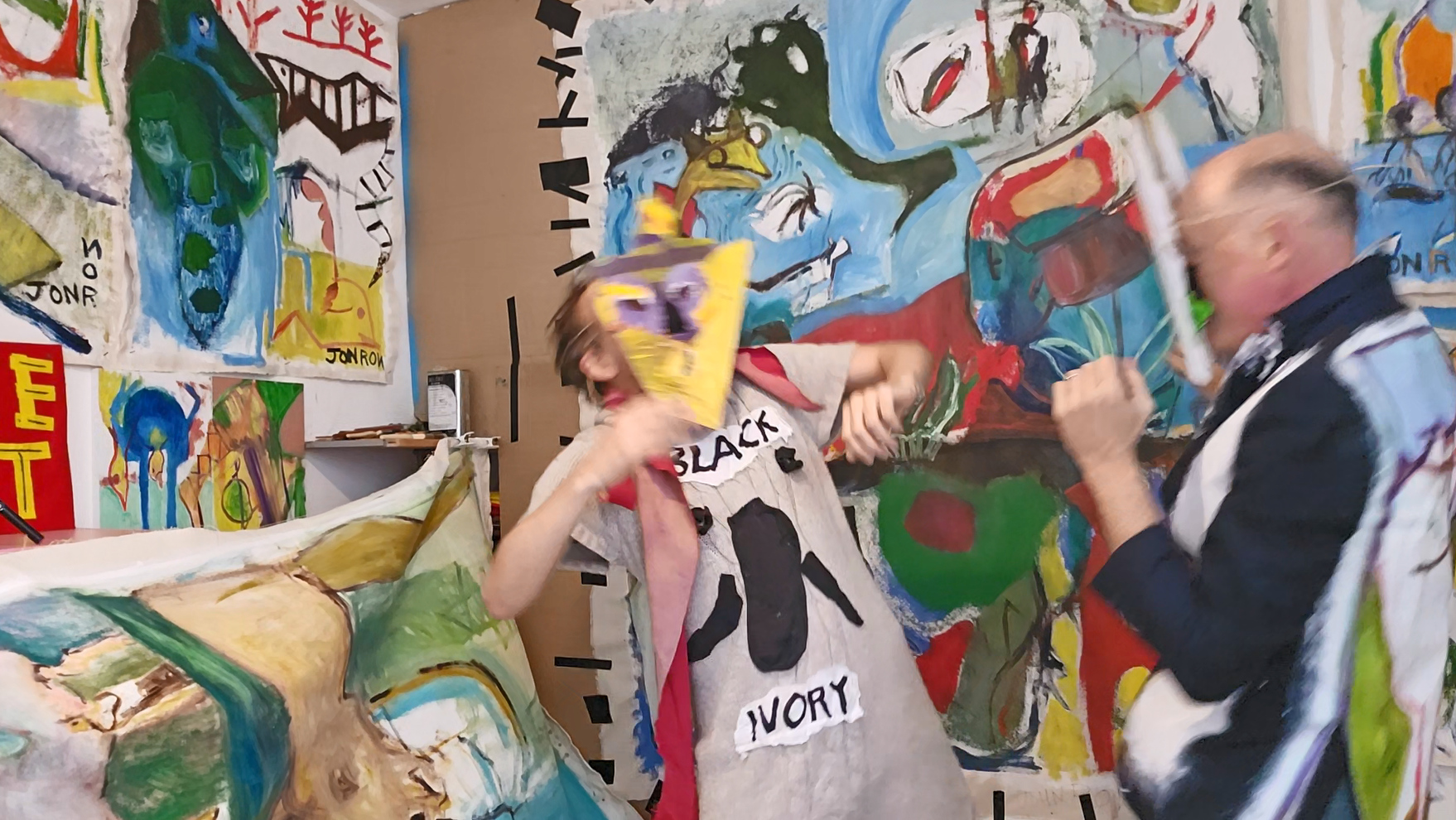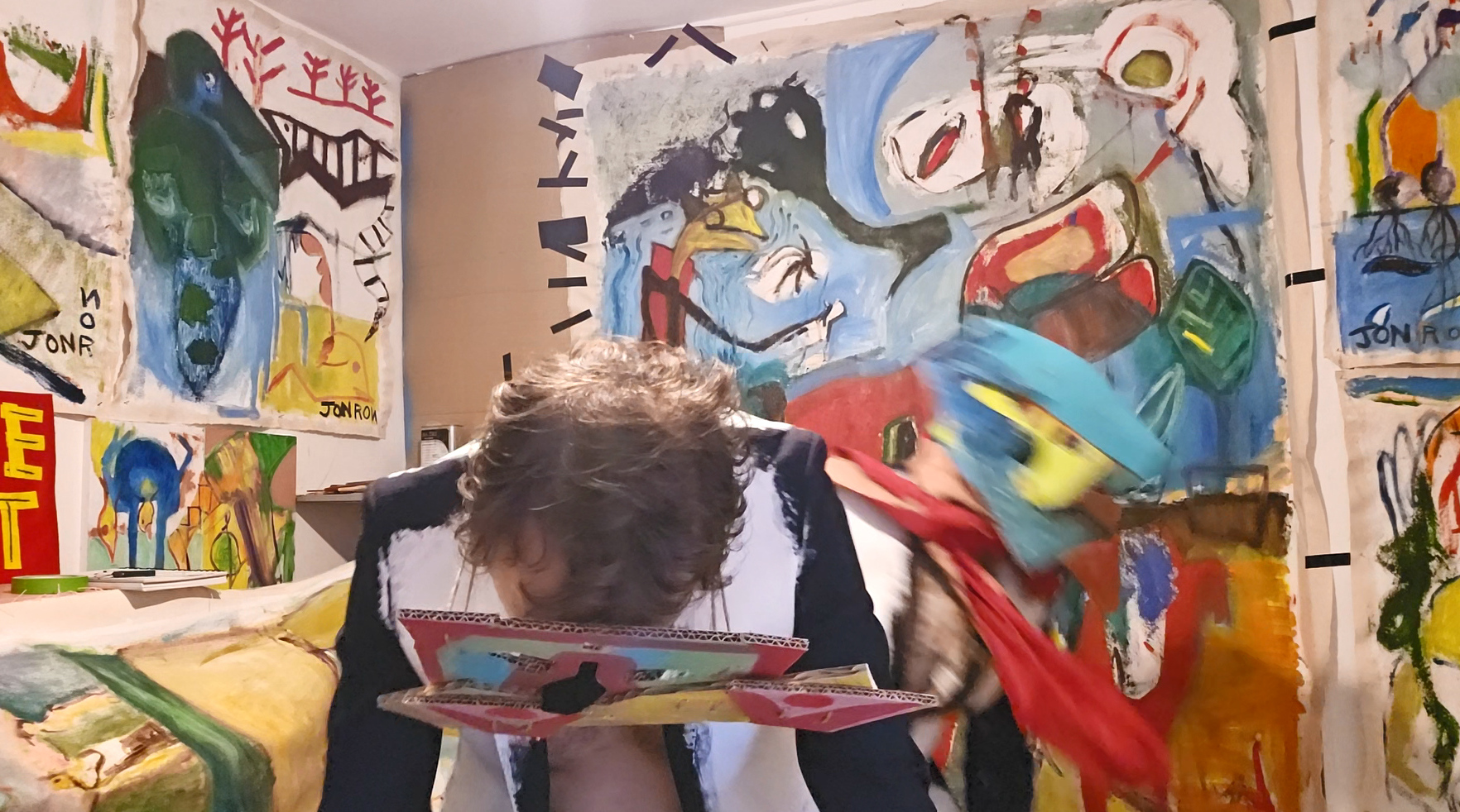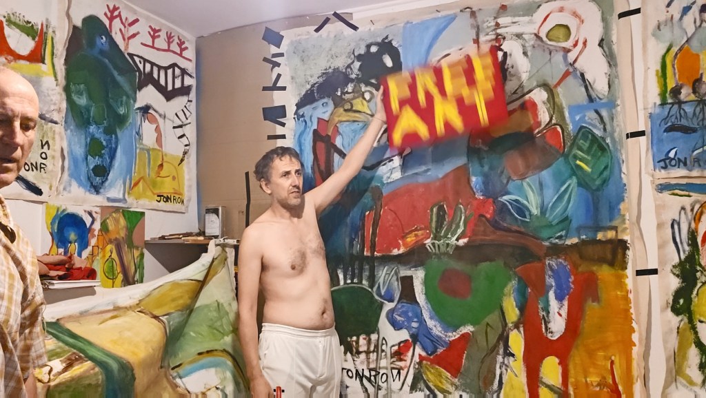 Jonron in Masks at Black Ivory, surrounded by Jonron paintings.