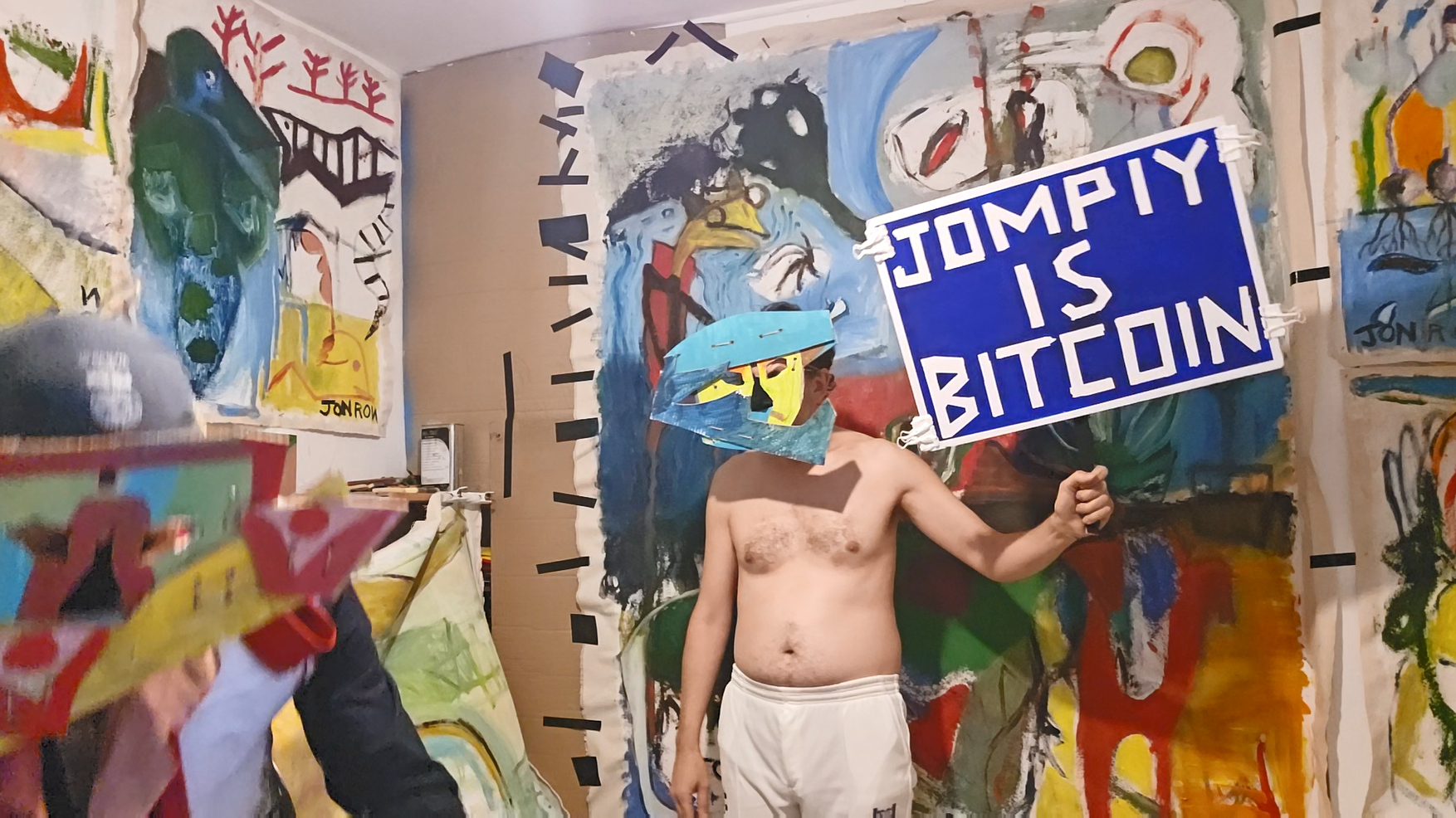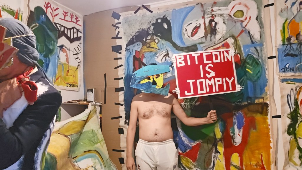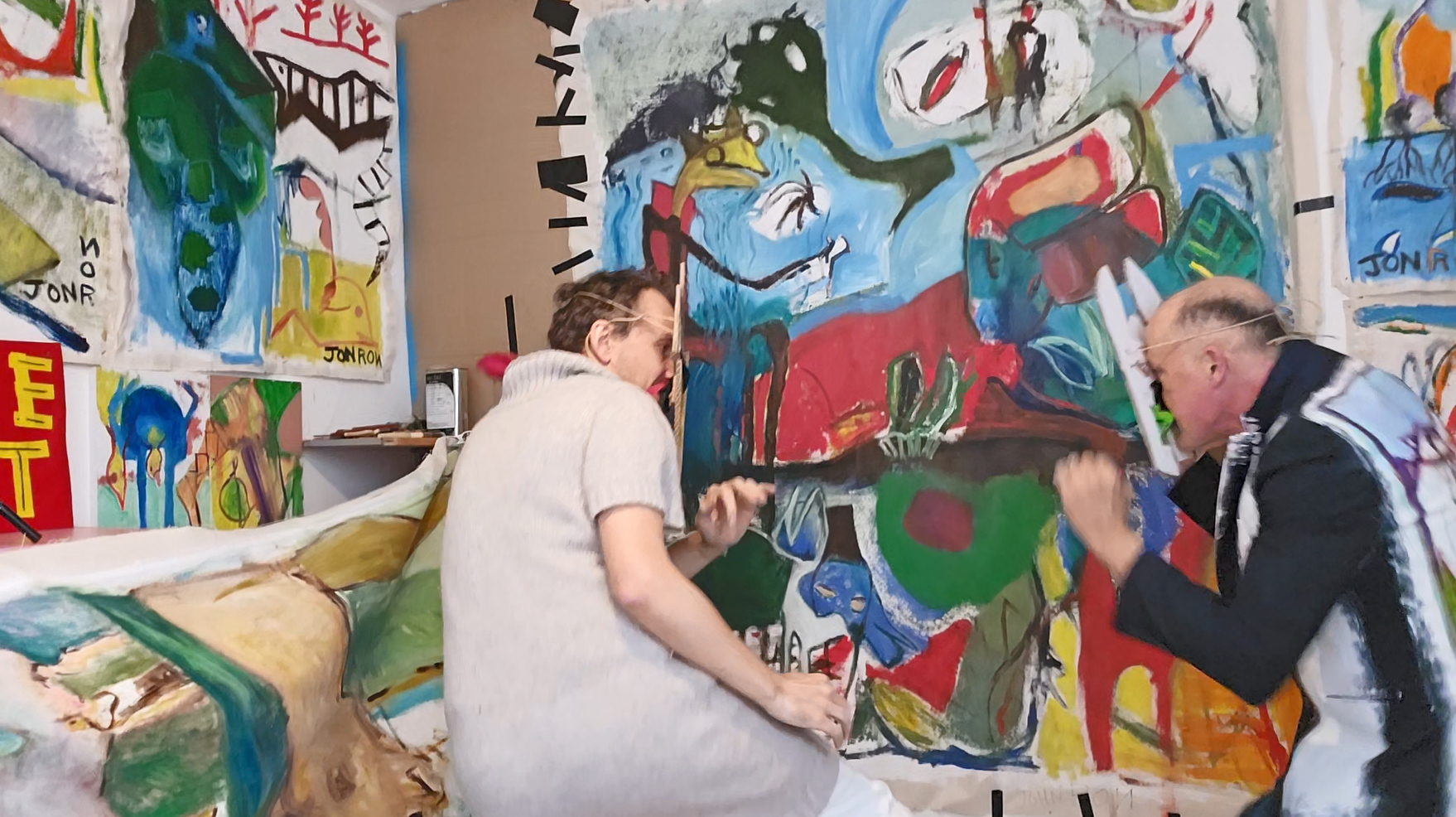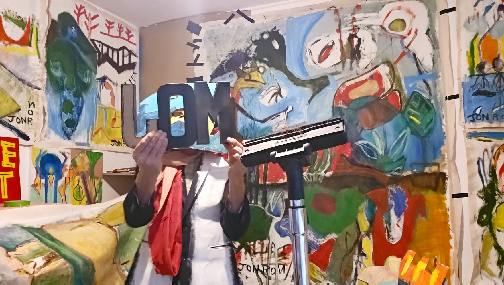 Jonron in Masks at Black Ivory, surrounded by Jonron paintings.
