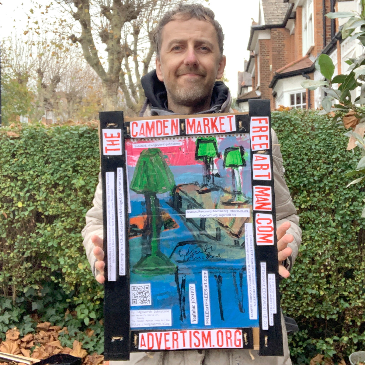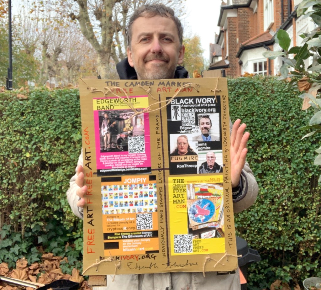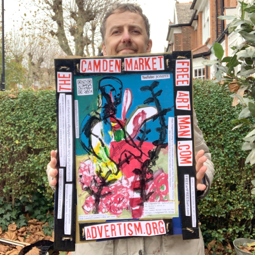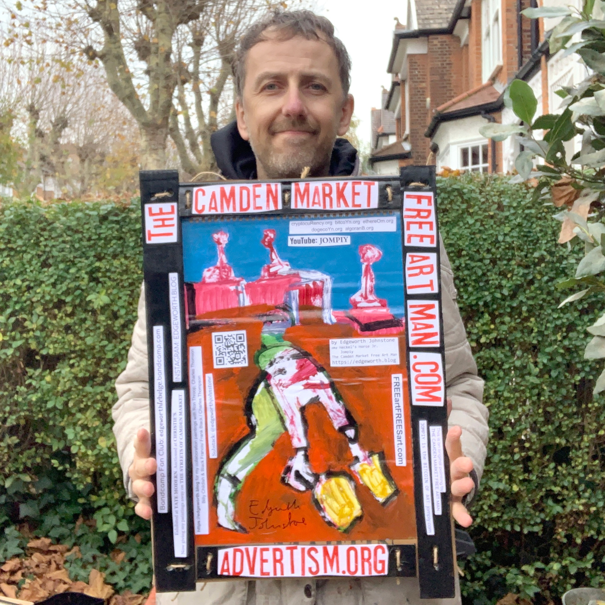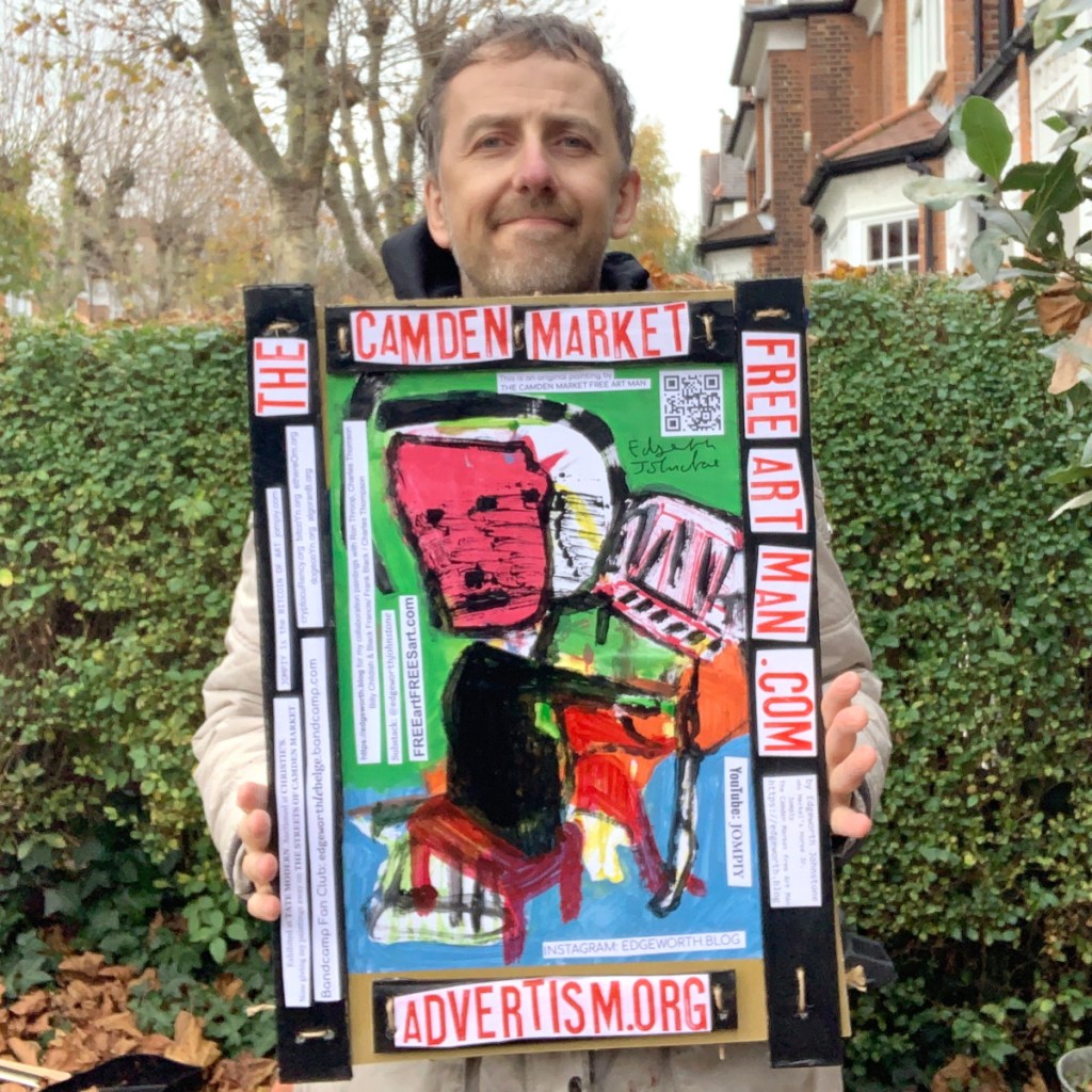 A3 size original, signed acrylic paintings on paper by me Edgeworth Johnstone. PVA glued to cardboard. I wrote and PVA glued the text and QR code. I then PVA glued over the top to give the paintings and text protection and a gloss finish. I individually hand stamped the red lettering on the front using high quality printing inks. I then punched holes in the front with an awl and threaded garden twine string for the cardboard attachments, allowing the painting to be hung on the wall without needing any further attachments. The black frame is 4 pieces of cardboard I cut and painted two coats of black acrylic paint. The cardboard is good quality, thick, double corrugated cardboard. Signed on the front and back in permanent marker pen. These paintings are ready to hang. You can buy them in my Etsy shop and my Ebay shop. I also give them away at my Camden Market Free Art Man display.