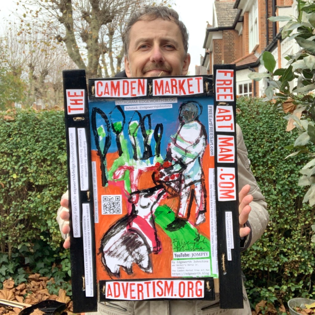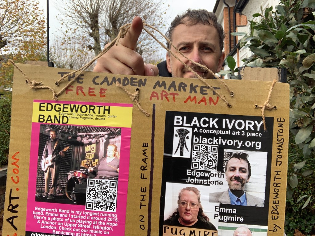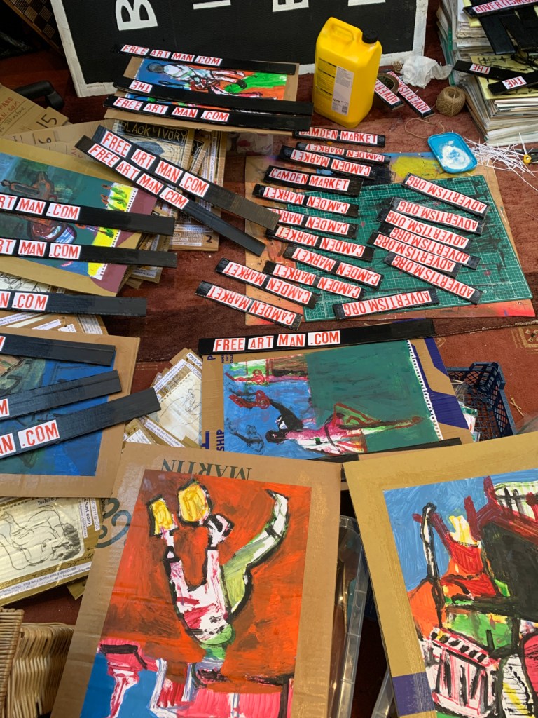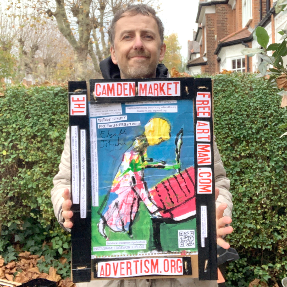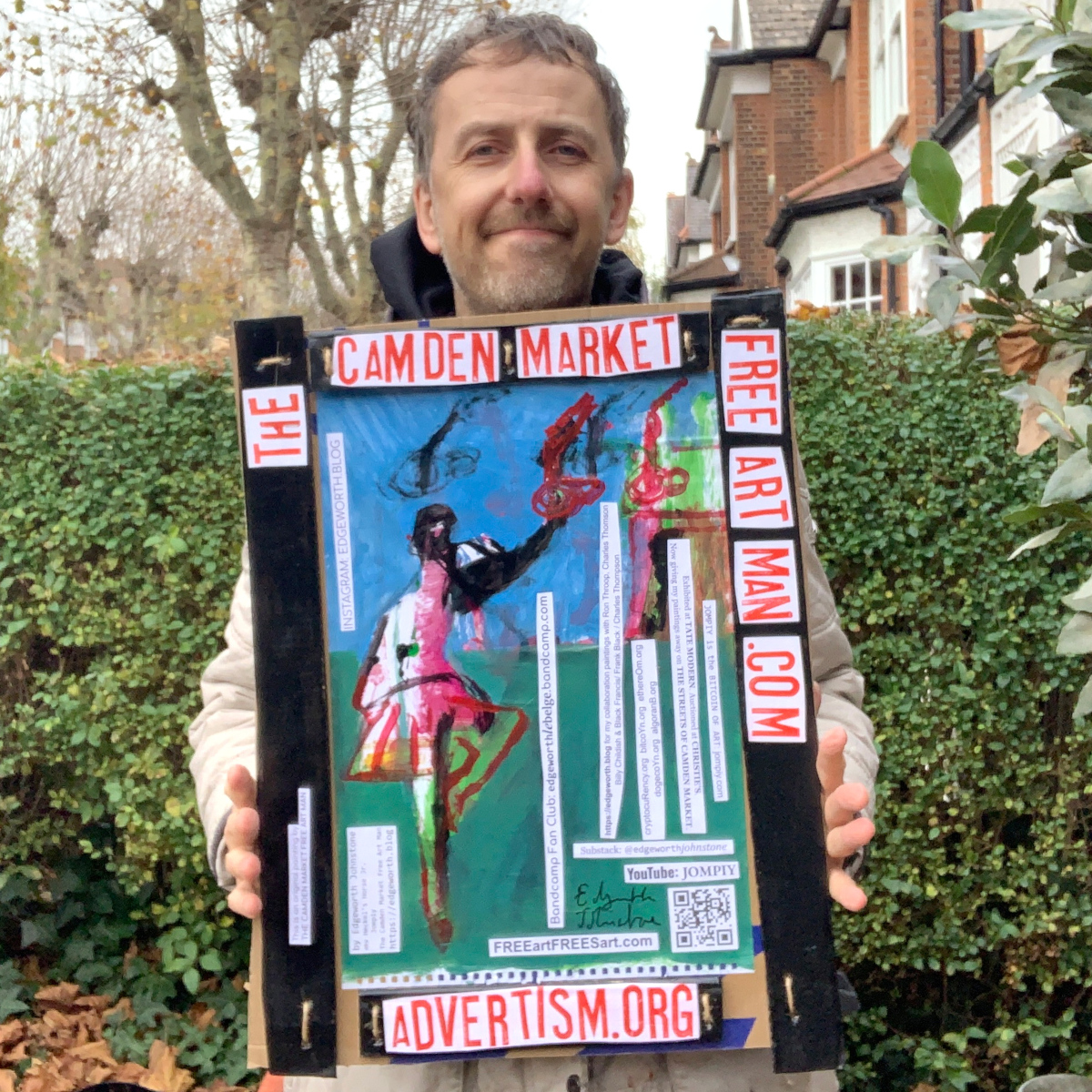 A3 size original, signed acrylic paintings on paper by me Edgeworth Johnstone. PVA glued to cardboard. I wrote and PVA glued the text and QR code. I then PVA glued over the top to give the paintings and text protection and a gloss finish. I individually hand stamped the red lettering on the front using high quality printing inks. I then punched holes in the front with an awl and threaded garden twine string for the cardboard attachments, allowing the painting to be hung on the wall without needing any further attachments. The black frame is 4 pieces of cardboard I cut and painted two coats of black acrylic paint. The cardboard is good quality, thick, double corrugated cardboard. Signed on the front and back in permanent marker pen. These paintings are ready to hang. You can buy them in my Etsy shop and my Ebay shop. I also give them away at my Camden Market Free Art Man display.