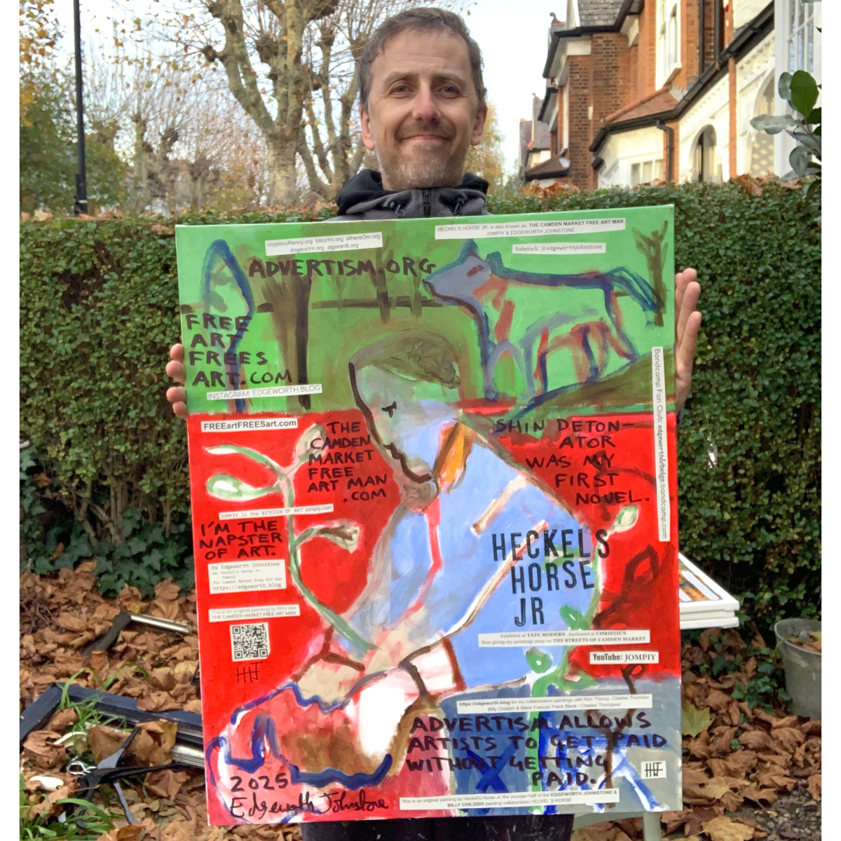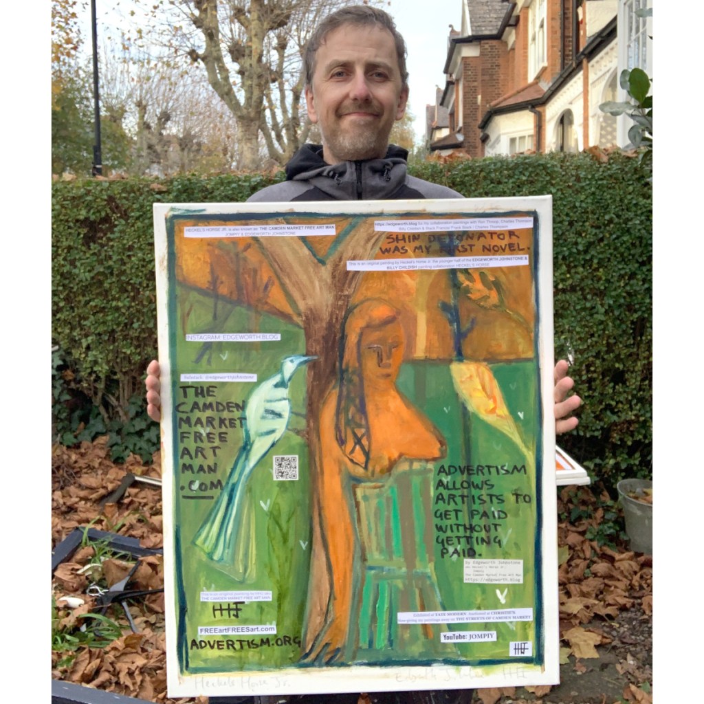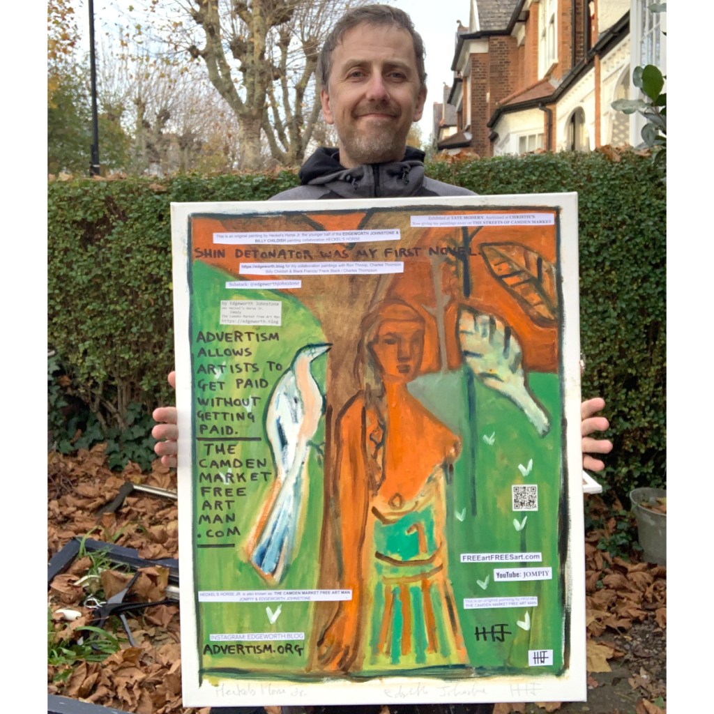 Paintings on stretched canvas, with text PVA glued on top. I sell them in my Ebay shop and my Etsy shop, and give them away at Camden Market.