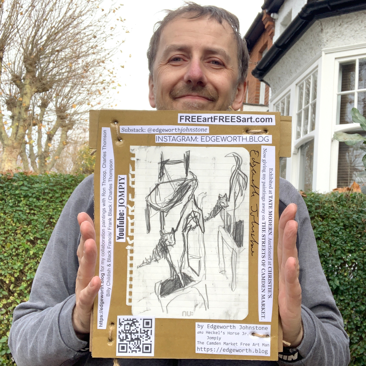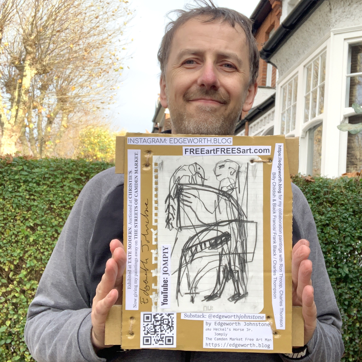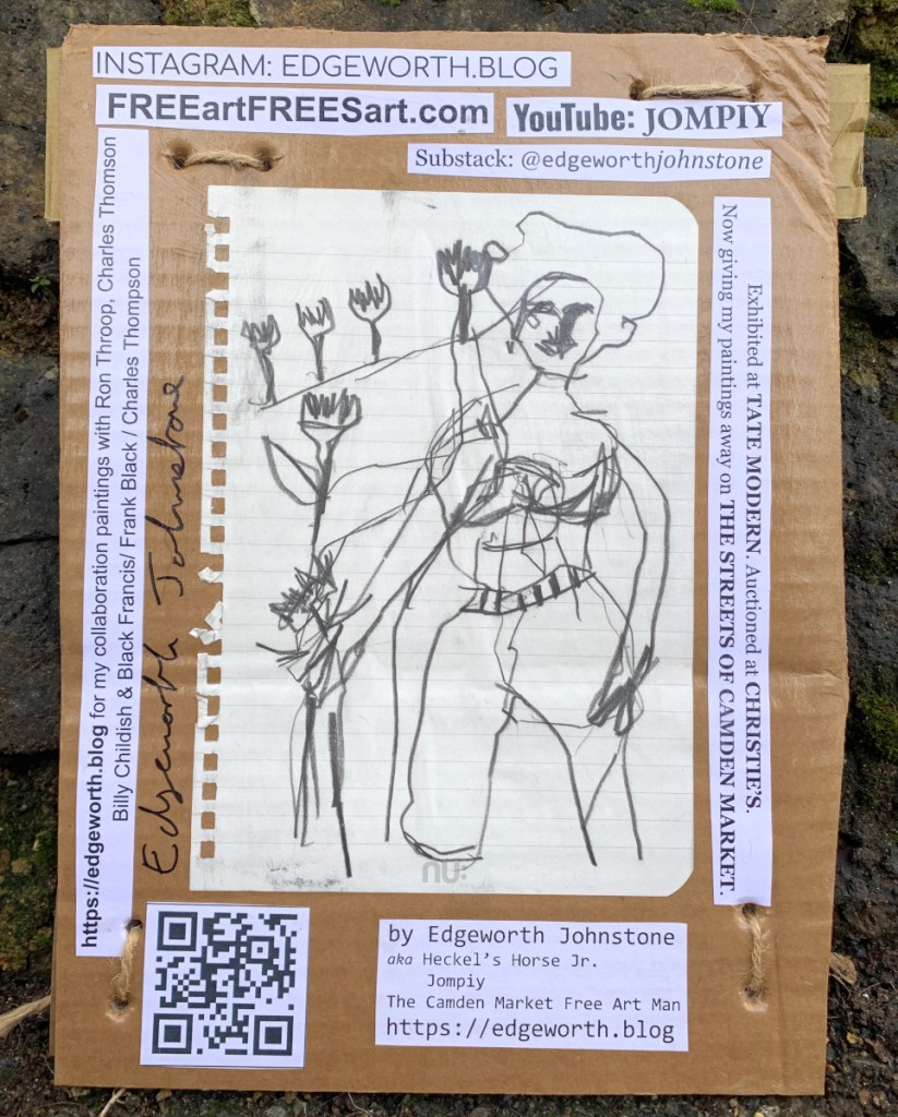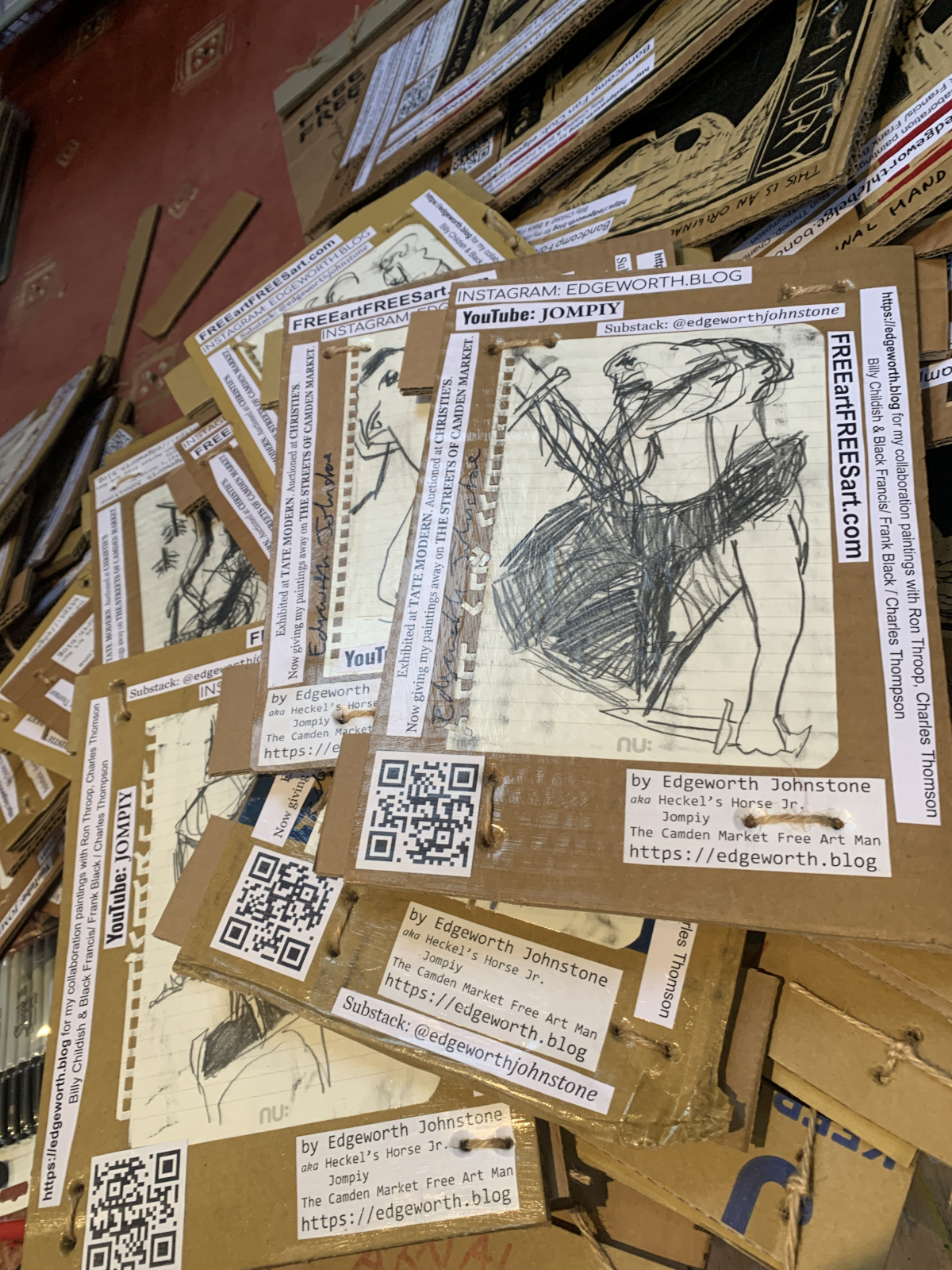 Original pencil drawings by me, Edgeworth Johnstone. I also made the cardboard frame, tying it together with garden twine string, glued the paer to the cardboard and wrote the text on the back in permanent marker pen. You can buy them in my Ebay shop and my Etsy shop, or for free at my Camden Market Free Art Man giveaway.