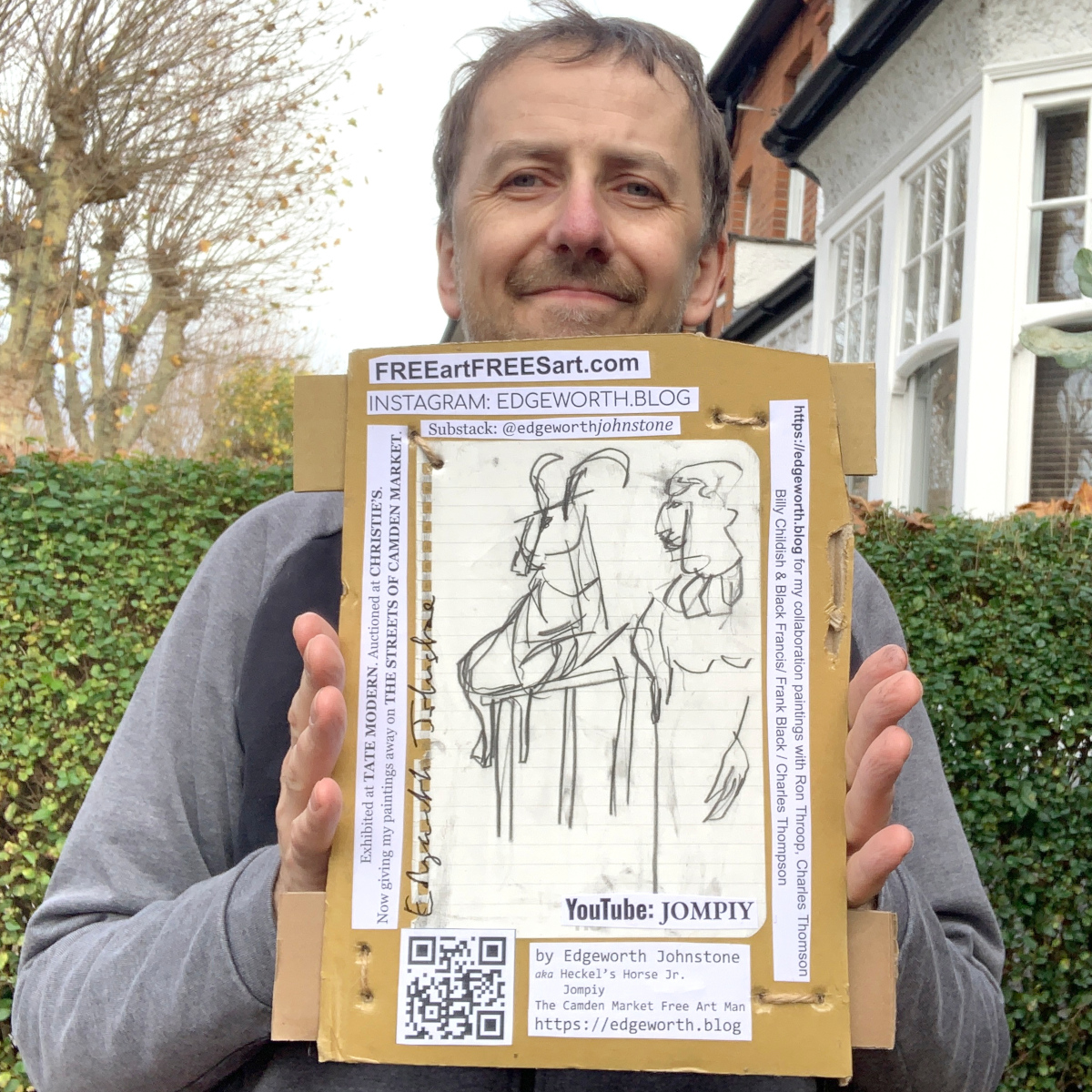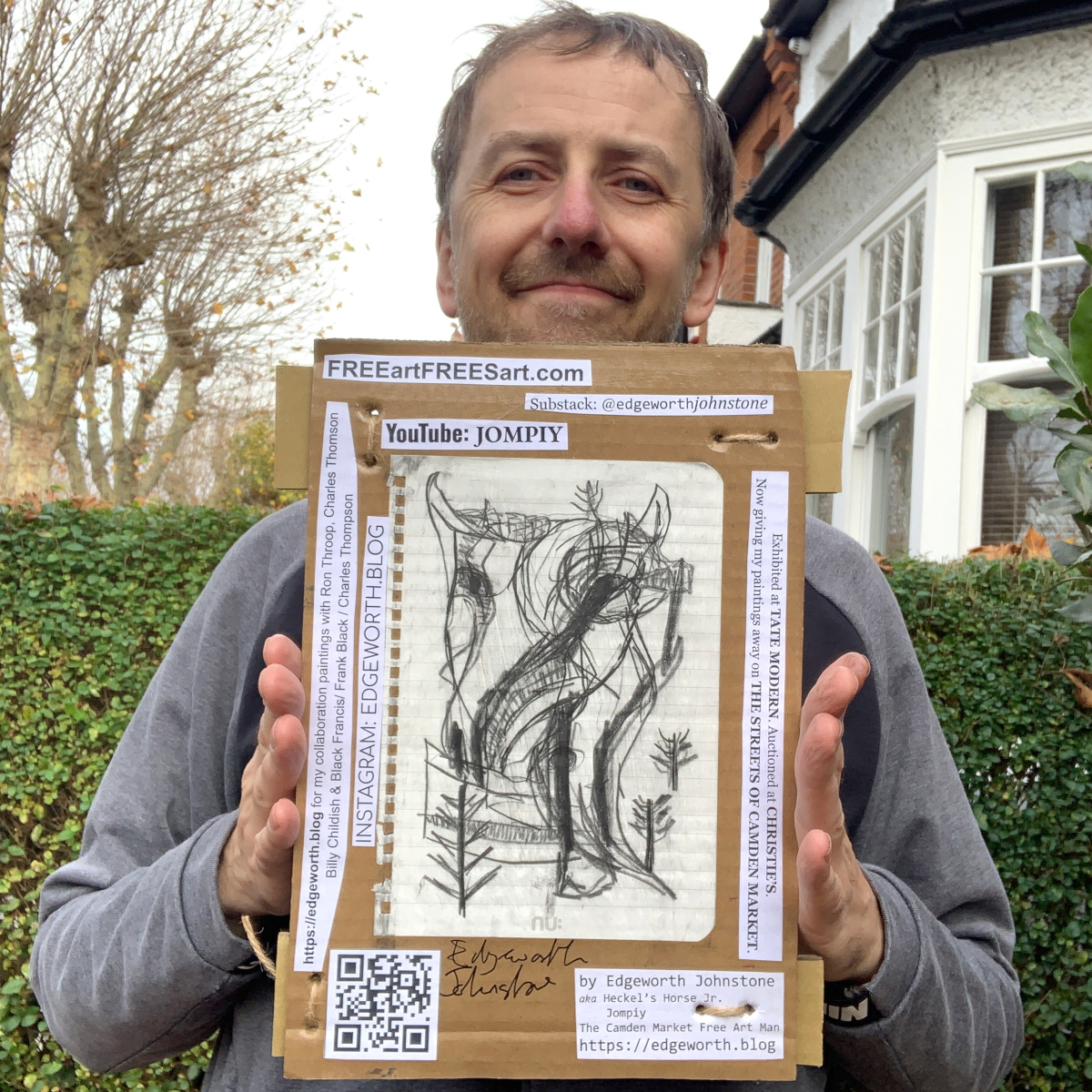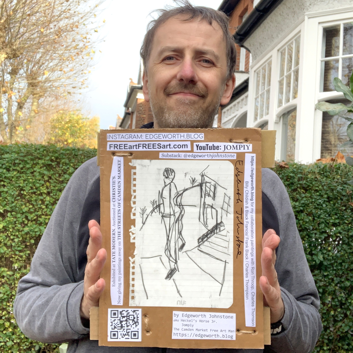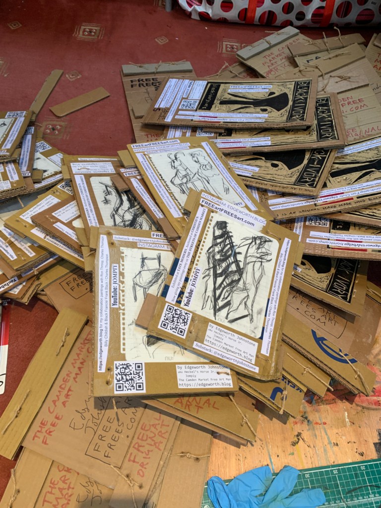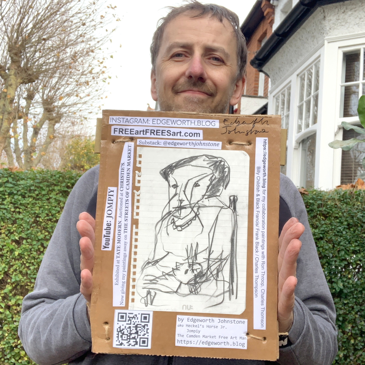Original pencil drawings by me, Edgeworth Johnstone. I also made the cardboard frame, tying it together with garden twine string, glued the paer to the cardboard and wrote the text on the back in permanent marker pen. You can buy them in my Ebay shop and my Etsy shop, or for free at my Camden Market Free Art Man giveaway.