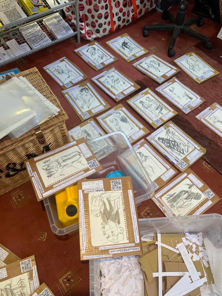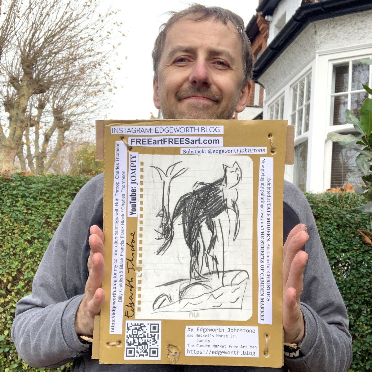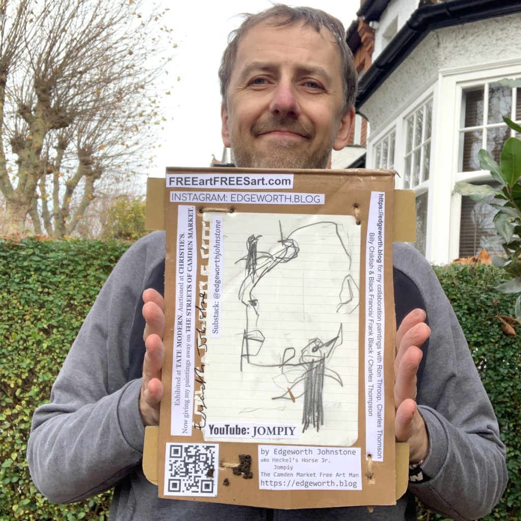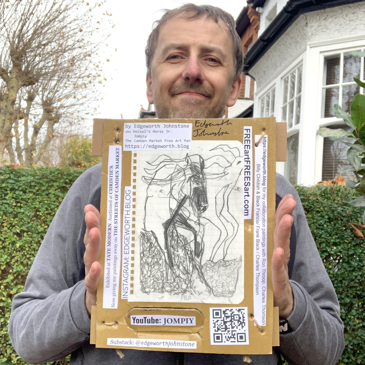 Original pencil drawings by me, Edgeworth Johnstone. I also made the cardboard frame, tying it together with garden twine string, glued the paer to the cardboard and wrote the text on the back in permanent marker pen. You can buy them in my Ebay shop and my Etsy shop, or for free at my Camden Market Free Art Man giveaway.
