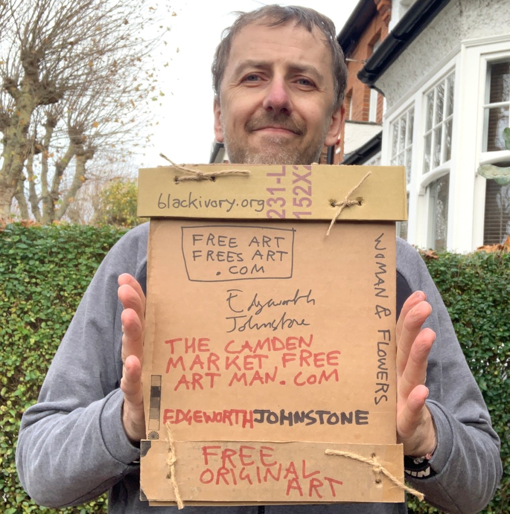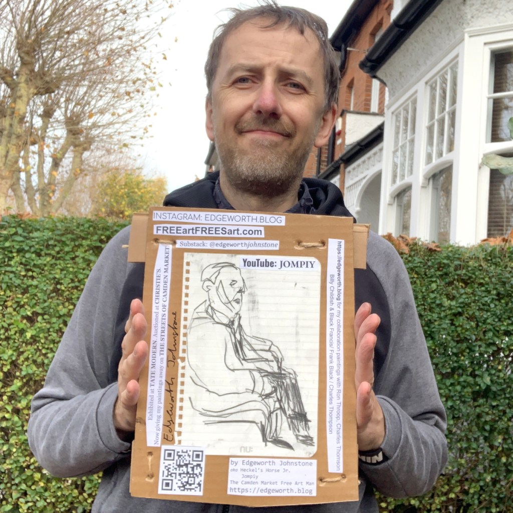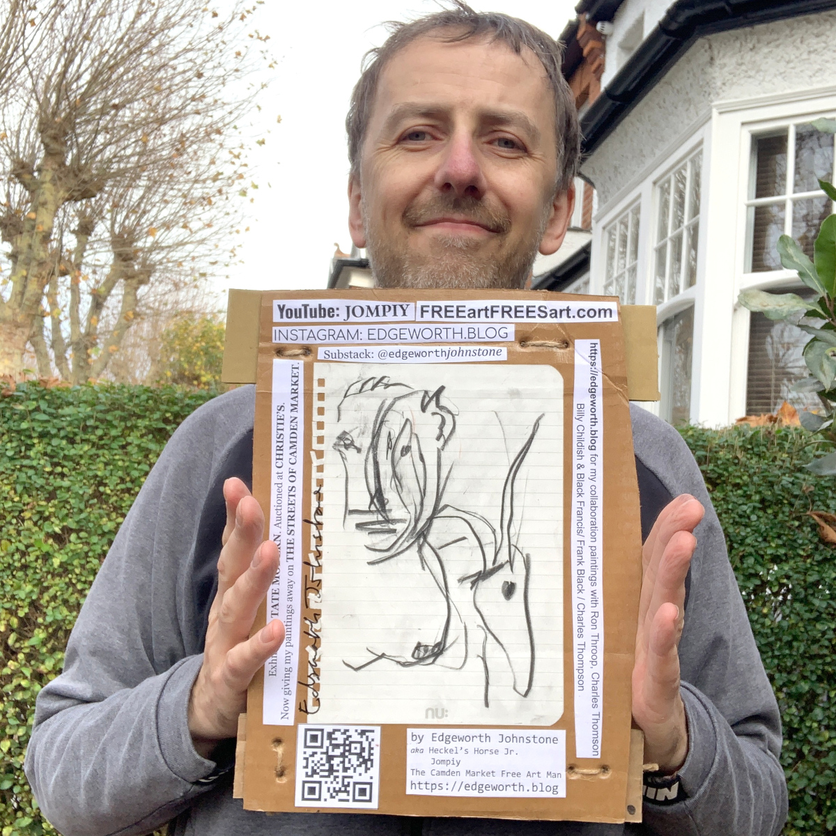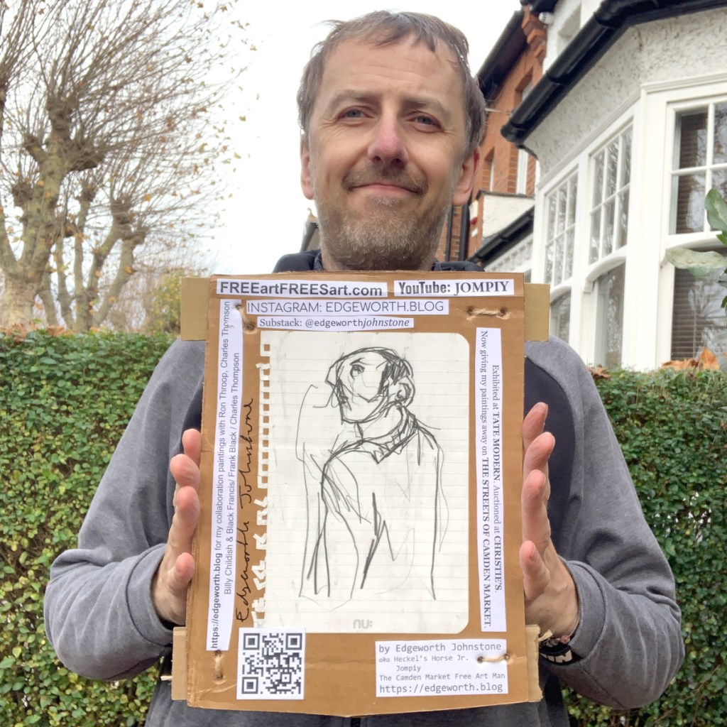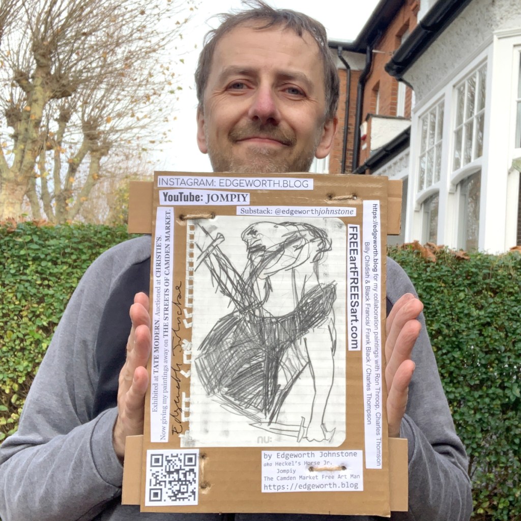 Original pencil drawings by me, Edgeworth Johnstone. I also made the cardboard frame, tying it together with garden twine string, glued the paer to the cardboard and wrote the text on the back in permanent marker pen. You can buy them in my Ebay shop and my Etsy shop, or for free at my Camden Market Free Art Man giveaway.