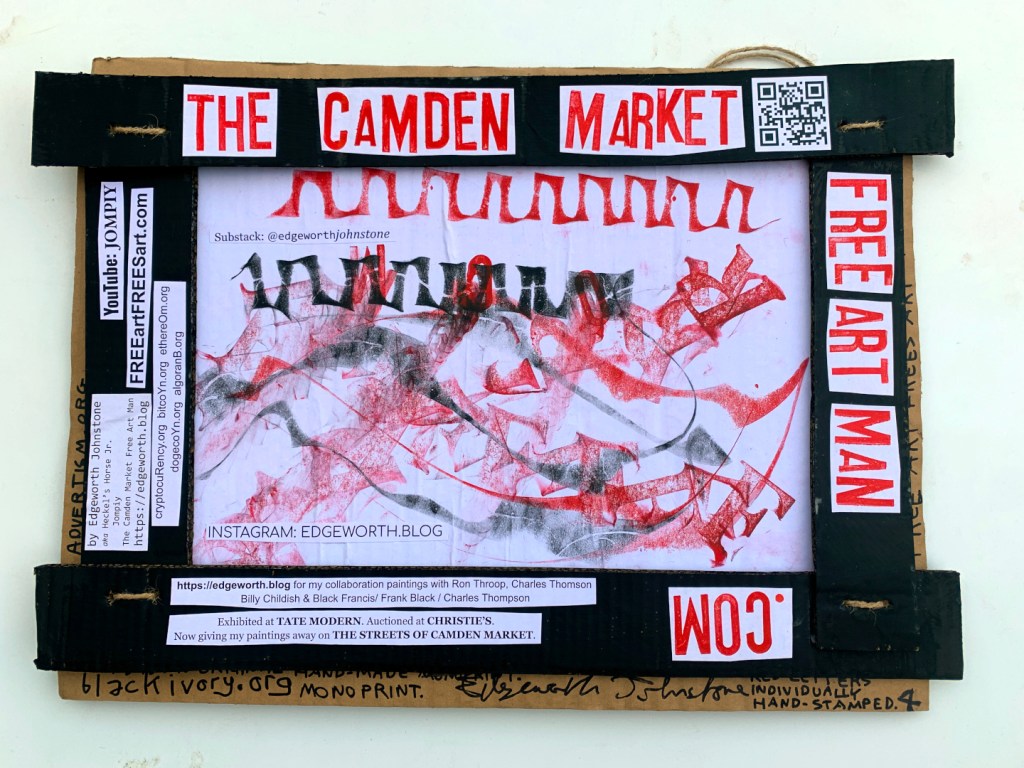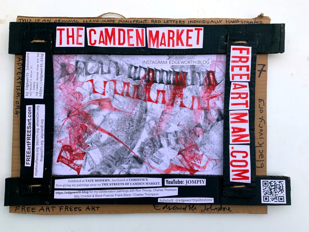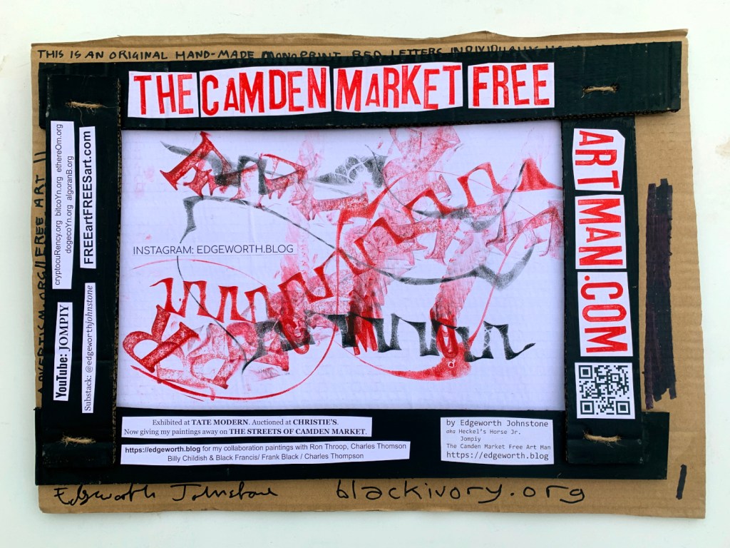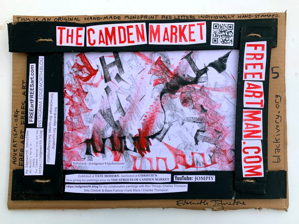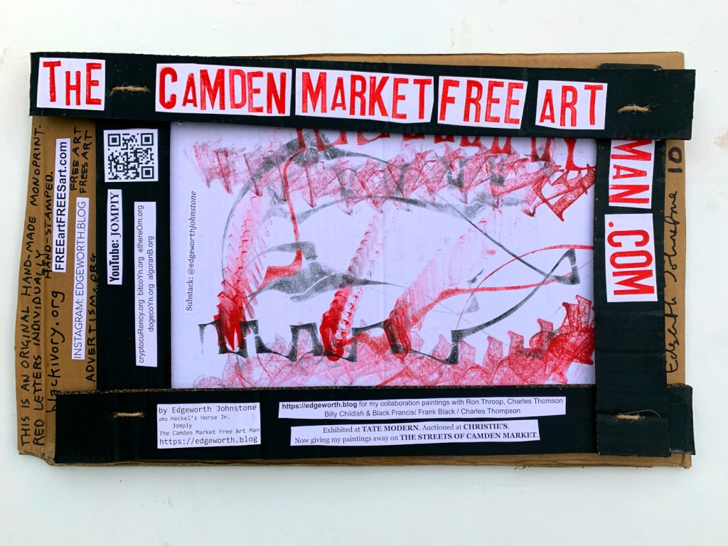 Handprinted monoprints on paper, PVA glued to cardboard. Individually handstamped red letters. Have string weaved into them and a hanging cord. Painted over with PVA.