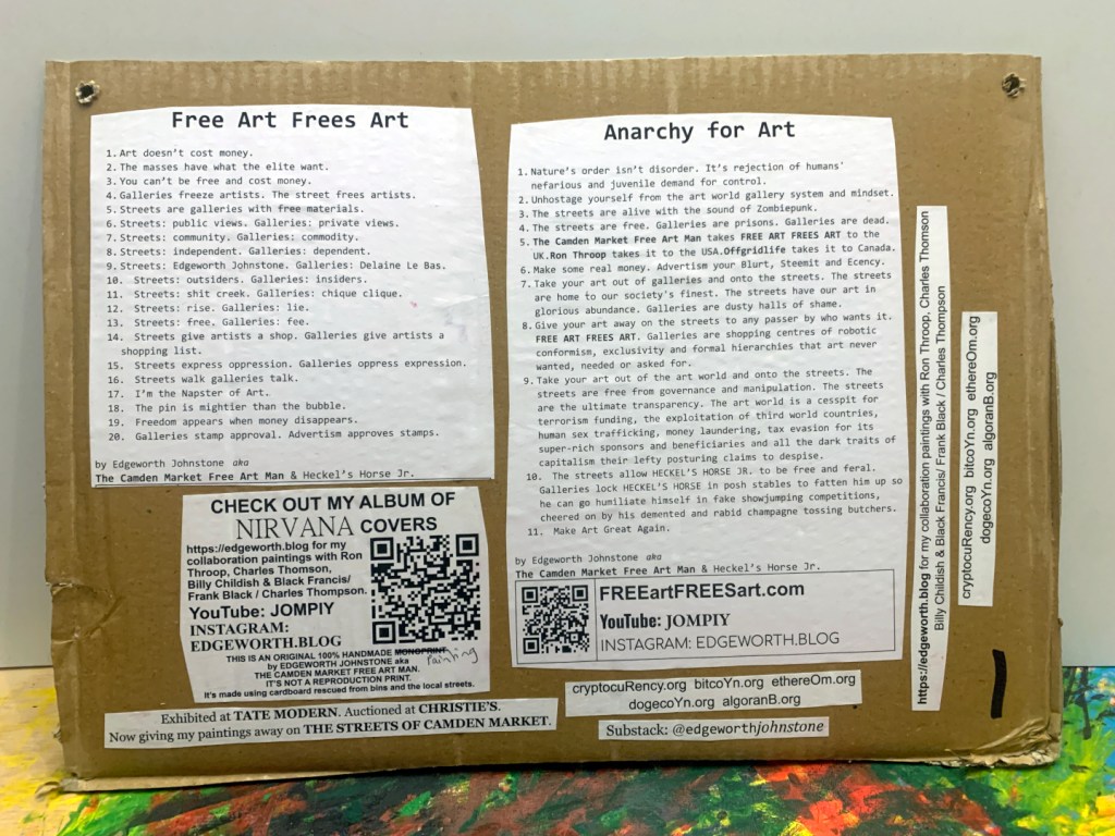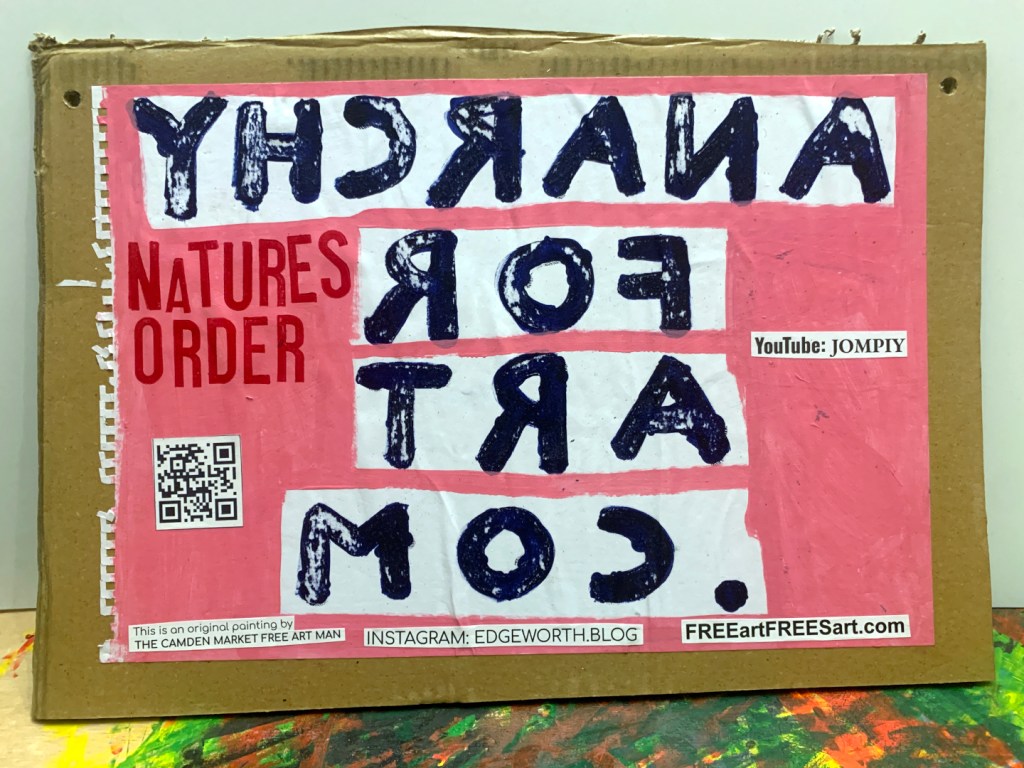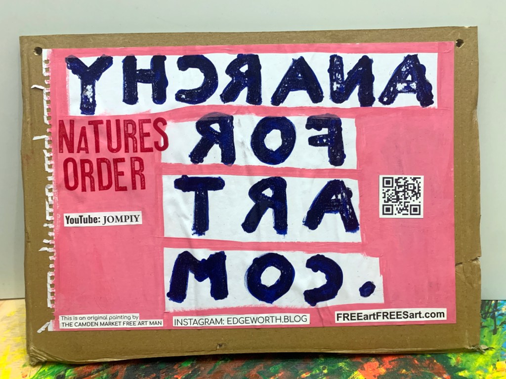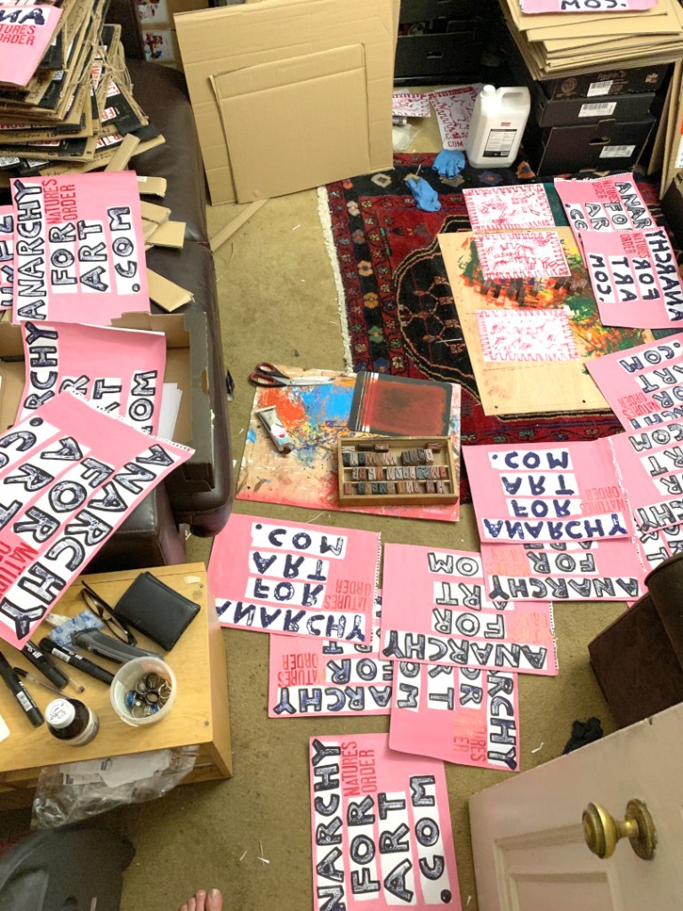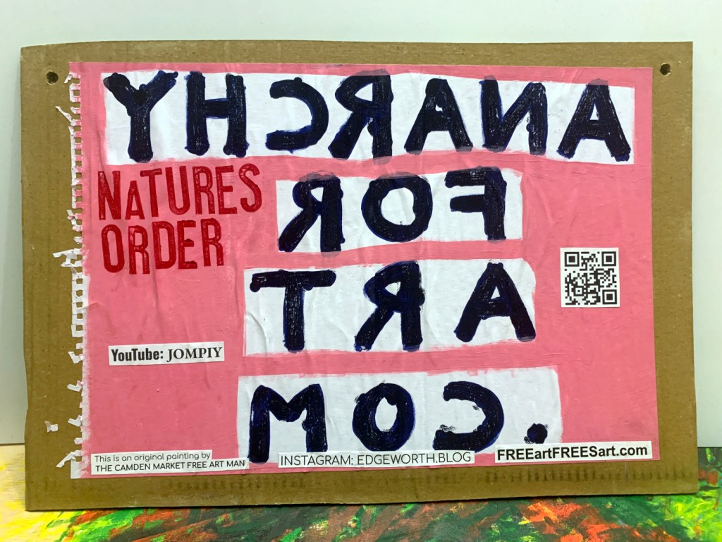 Acrylic paintings on A3 sketchbook pages. PVA glued to thick cardboard. Individually hand stamped NATURES ORDER. Manifestos on the backs.