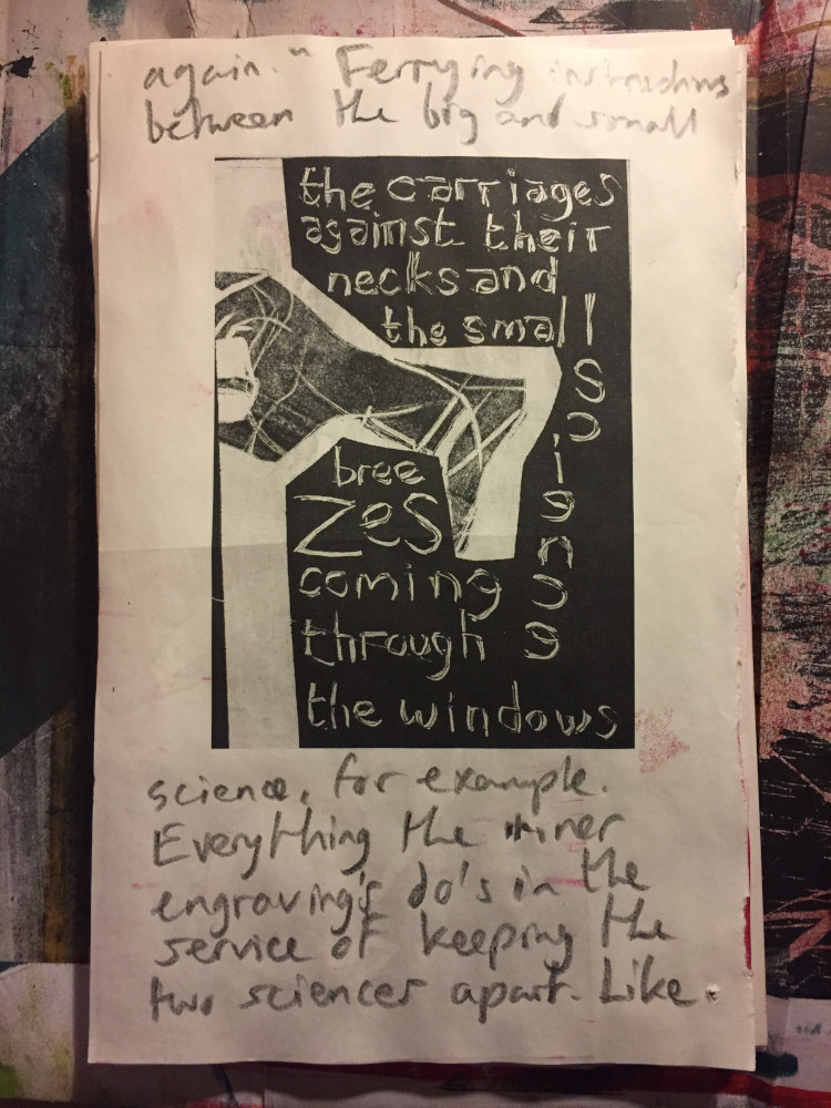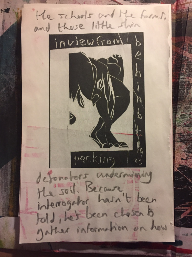 So your kid calls in all the other cows, and they all line up, lying in bed. Their eyes all look the same. Chewed up brambles collect on the floor, not a marker chewed up with them, still sharp enough to carve more inner engravings into the dorm. Meeting like two species of human, one with jewellery and one from the freezing mountains. They too initially just stare at reflections, they look like little rats, in each others bulging eyes and stab out at co-existence. Over the next two years, they’re assumed to interbreed, of course they did, so inner engravings flying into windows from Ol Fishers mums bell at dinner time’s not the same as the inner engravings that feel safe enough to crawl back over the decking, skip over Ol Fishers burials, and back inside the bell. There they all still reckon gravity’ll come back and help them out. More’s gone on since then. It ain’t so hard anymore, climbing up that dark interior, away from markers stumpy fingers. Markers don’t stand a chance anymore. You don’t move big science physical evolution much in your sleep. Your big science’s like a big dril. Only bed down your mental evolution into your muscle memory, and learn, what Ol Fisher wrote in her exam paper, how to grab each engraving from working out which of the pack hasn’t been out yet, and returned, from Ol Fishers mums dorm, and grown these claws of theirs. So there she is, with it all tied up. Inner engravings shattered from the start. Landed finished. Ringing that bell only brings more soldiers inside. More for Ol Fishers mum against the village. The village’ll soon be over, and spun into Thread. She never told you why she left. Just upped and off. The barn’s left cold after dinner. No one around. No space for anymore formula notes. It’s a horse trodden graveyard. Cows and horses mate when the bullied kids sleeping under the parts of decking the passing carriages haven’t pulled up. Ol Fishers mum figures both species are big enough to belong to big science, which they do but how much of a cow’s really cow? Horses parasites crossbreed with cows into village specific horsecows. Horsecows outside the village don’t cross any bridges between the sciences, but villages ones have the suspicions the villagers have. Ol Fisher made em keep looking at that lone tree of hers, and now it’s got into the pets. The cats and dogs suspicious cross breeds don’t get far, cats and dogs being so small and almost the same size. Ol Fishers mum didn’t give Edgeworth any time off, she weren’t sending your bullied kid out in the field either. Ol Fishers mum knows her son lined up them horses like tenpins. Ticket inspectors all work for her. The Threads go back from before her first exam paper, who at that school’ll lace the soil with Thread she knows Underling’ll pull up from the ground in front of the birds seeing everything in mirror. Birds see Underling pulling up thread in the field, They see themselves nosediving through barn roofs and scuppering plays Ol Fishers mum put on just to see the opening scene, and bring its crescendo forward so the audience leave the room with small science in their clothes fresher than it’d be waiting for the encore to finish. A horse put with a cow has abnormalities beyond and cat and dog problems. Village ones especially. Ol Fishers mums been pretty good at keeping the village out the same pool as her barn, but there won’t be much time to join the two sciences at the school play, she’ll have to make it a school one to get everyone else to attend. No, there’s no time to bring both together, if she’s using crossbred horses in the play. The small science’ll be in the leaking blood. Over the prompter and soaking up the audiences shirts. They’ll be sniffing Ol Fishers mums formula through their noses. Even Ol Fishers mum wouldn’t stuff her newspaper formula down the noses of her son or your bullied kid. A sinus bit to run down’ll leave a trail like the inner engravings trying to make their way up the brick iceberg road, starting nose-diving, this time real nose-diving Underling down at the audiences noses before the small science’s threaded its way round the warrens in the audiences faces and safely down corroded into electrical outages in their stomach acid. The acid won’t touch the small science of any face with a diving Underling sticking out of it. Ol Fishers mum cuts out any arteries in the faces of queuing attendees at each of the three remaining plays. Can’t afford any squirters if the Underling break through the roofs. Ticket inspectors push the tipped carriages doors up to the birds, give them something without a gradient to aim at. Several nosedive safely at the chairs and are taken in as pets by passengers. They come with you know, ticket inspectors. The first ticket inspector kicks open the kids bedroom door, throws in one of the passengers carrying a nose diving bird. “There any kids?” “No, their out, you don’t have to ask, the birds were hurtling down at them minutes ago. Ol Fishers mum don’t leave any in at home time.” Her bells sat there on the pillow the kids all share. You know, if take that bell, you take out the whole barn. Everything here happens through the ringing of Ol Fishers mums bell. Only she’s ever rung it. The ticket inspectors steam up red. “The Threads made it over, into the barn.” Nothing makes it from the playing fields without being watched over by the mountain. The division line between the school and the barns crossed, once your high enough to see over the slip road Underlings never made it past. He thought he did, when he took the Afro Twins out the grips of the neighbours cats, but those neighbours weren’t villagers. Past the provincials, up in the hills. There has to be a route to the music repair shop from somewhere other than the cricket party boat people. A separate set of people never crossing with the schools locals. Braithwaite wouldn’t keep anyone from talk