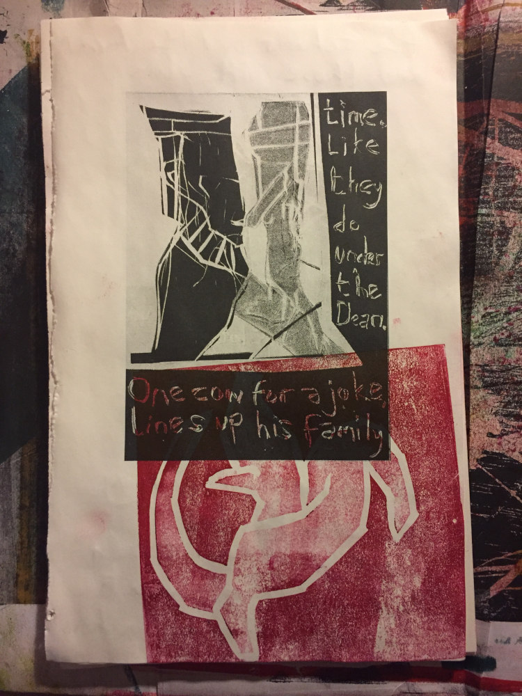Ol Fishers mum: “You overrate that woman. See her in the town hall, this month. She her with the village, and yes, the whole village’ll be there. She’s filling in exams for cheating engraving masters, who don’t even know the leave the engravings to pattern themselves. Who don’t know that? You’ve got a town hall full of cheating exam engravers, carving what into the paper? Answers? Might as well be. Pour the right colour ink over the page when the invigilators not looking, and re-dye it black before they stroll the corridors collecting them all in. You want a good job in the village, you need to listen here. Red, the invigilators can’t see red. Pour your red ink over the engraved exam paper when invigilators gone for her tea, overwrite it in black once it’s dry enough. Wipe off the red and stick it in your sock. Exam paper doesn’t cockle till it’s in the brown paper pack on its way to the markers, and by the time it gets there, everything’s cockled anyway. Postmen in the village cockle everything. Braithwaite won’t. Come and see your dancing horses, dancing with heads on sticks in their hands. Come and see why abattoir don’t take livestock from villagers anymore.” Another of your neighbours kids starts sharing out Ol Fishers mums dinner with the cows. The rest of the village sends them out after the markers, thinking they’re sleeping in the bramble bushes, but Ol Fishers mum just said ‘bushes’. If she means bramble bushes, she says ‘bramble bushes’. Ya can hear em in the regular ones if you bother to listen. The locals just see bramble as meaning bushes, so send the cows out to chew at the brambles. If anything, only softening the markers noises. Only help them hiding further. The cows are chewing but ain’t gonna swallow brambles, so your kid starts calling em over to the dormitory window with savings from Ol Fishers mums dinner. He flutters it out the window like ticker tape onto the grass, so the kids behind him start bullying him. The bullies don’t think, them being newer to the dorm’ll count against them, but they’re wrong. Your kids grasses them up to Ol Fishers mum.