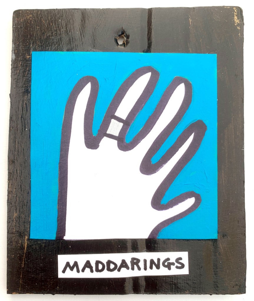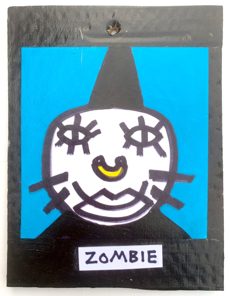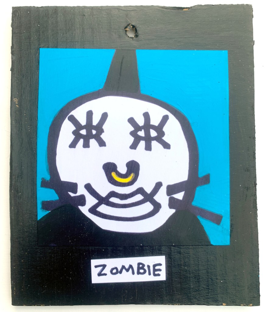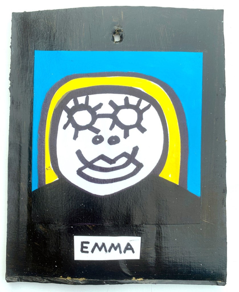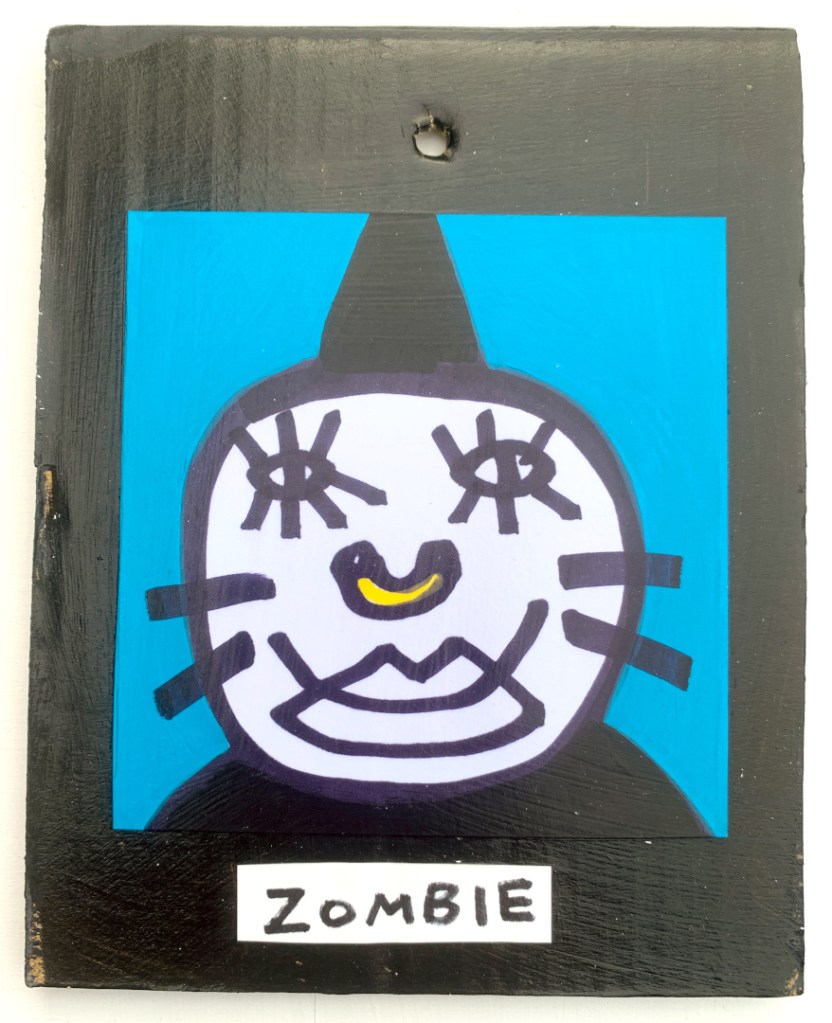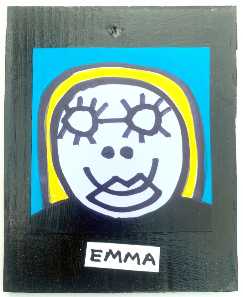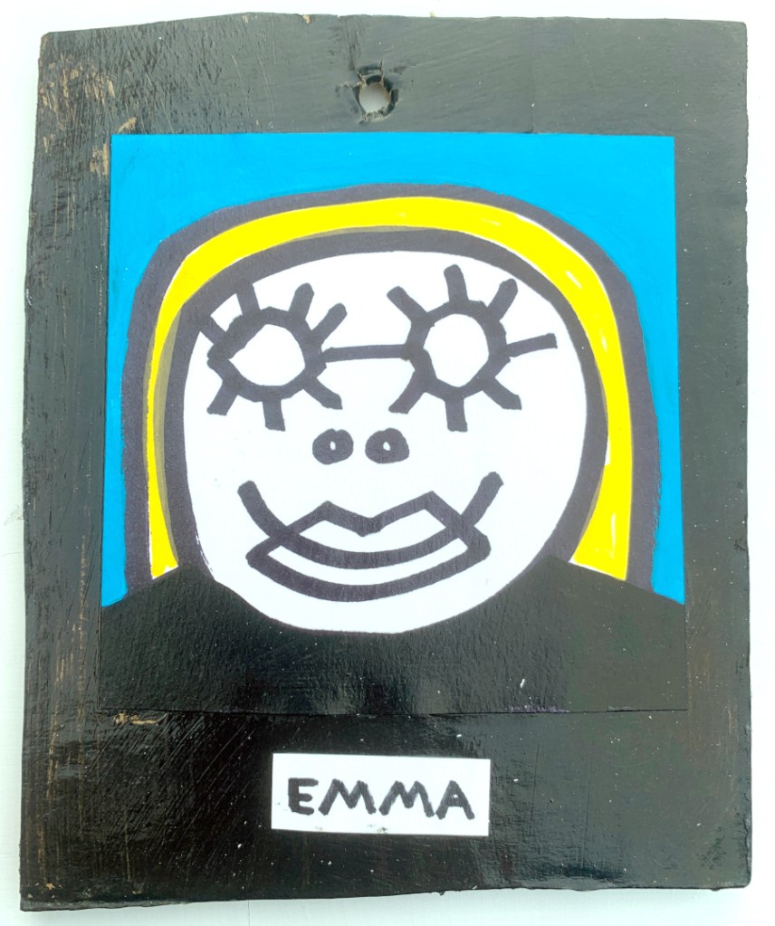 Acrylic on paper paintings, PVA glued onto thick, good quality cardboard rescued from the streets of Camden and Muswell Hill. Coated in PVA glue with hand-written info on the back in black Sharpie permanent marker.