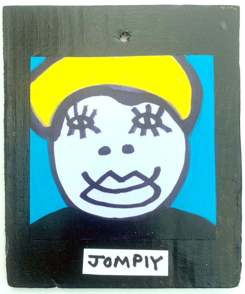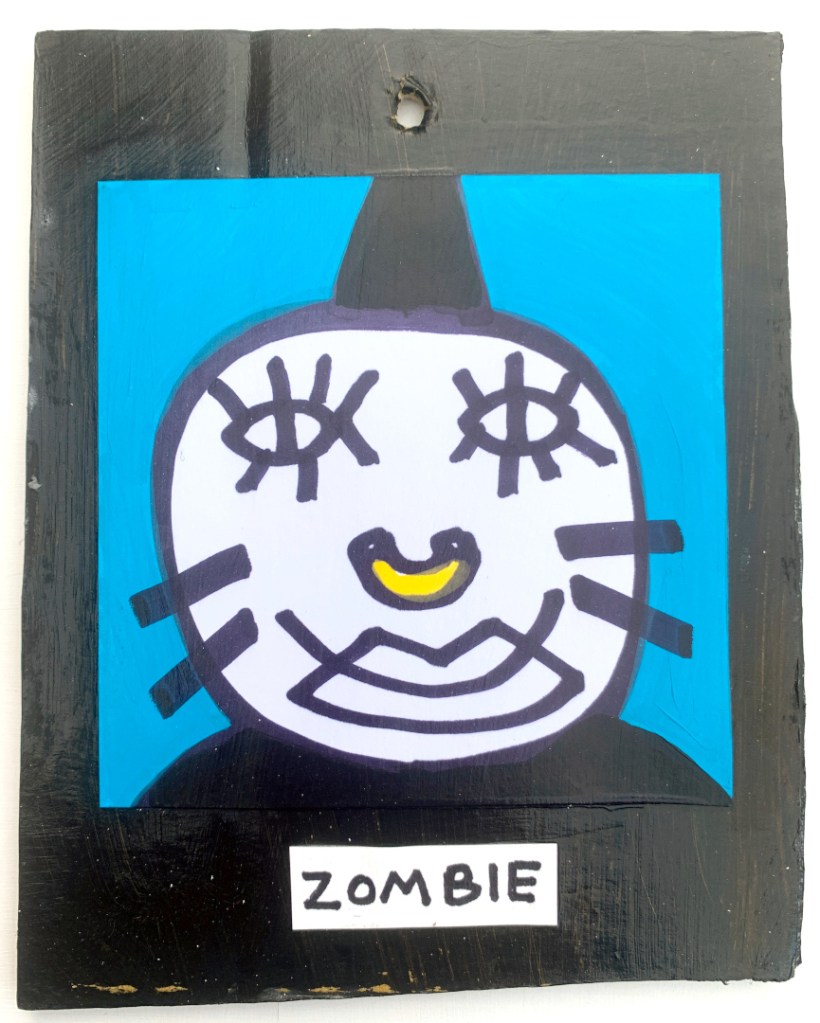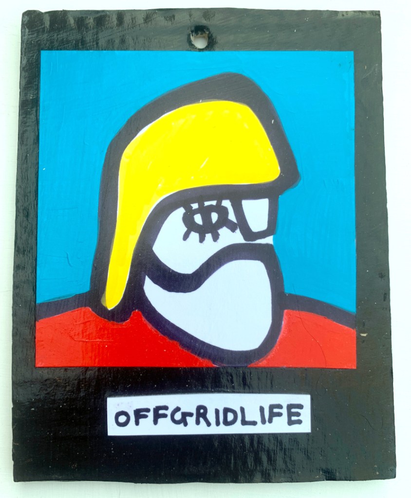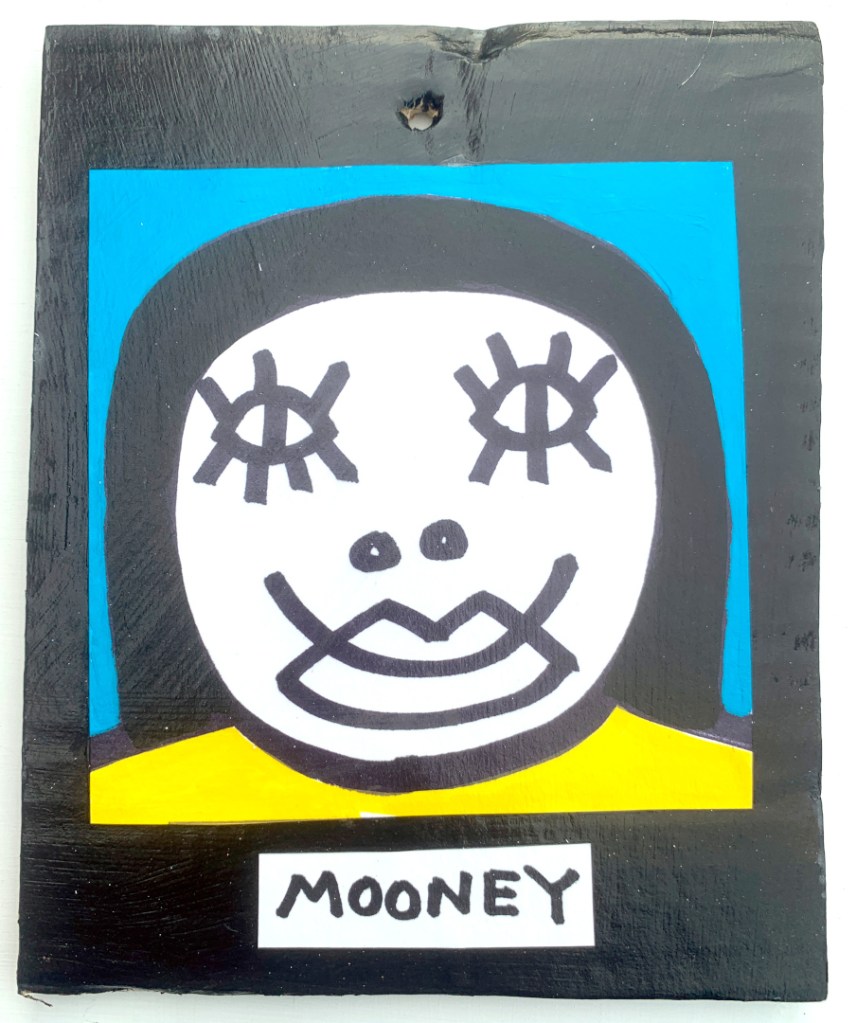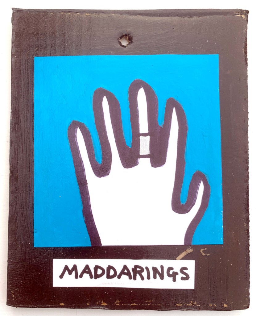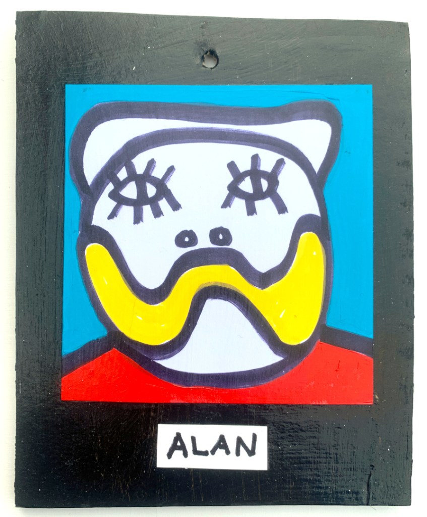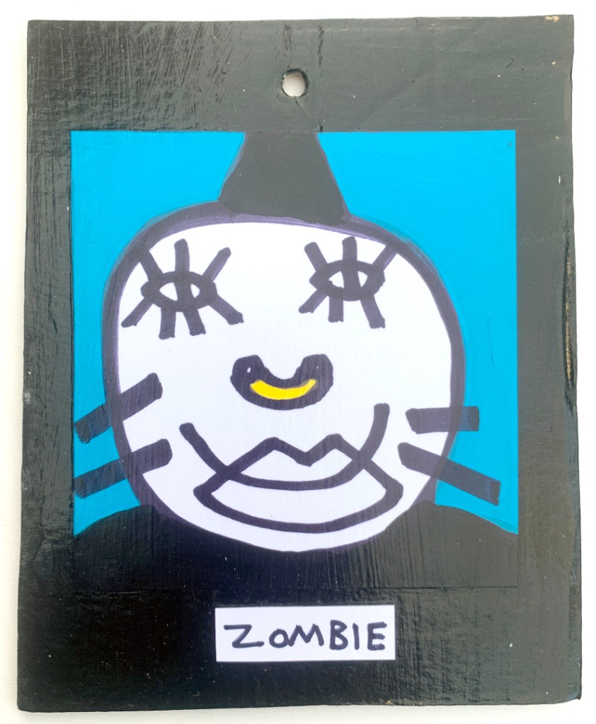 Acrylic on paper paintings, PVA glued onto thick, good quality cardboard rescued from the streets of Camden and Muswell Hill. Coated in PVA glue with hand-written info on the back in black Sharpie permanent marker.