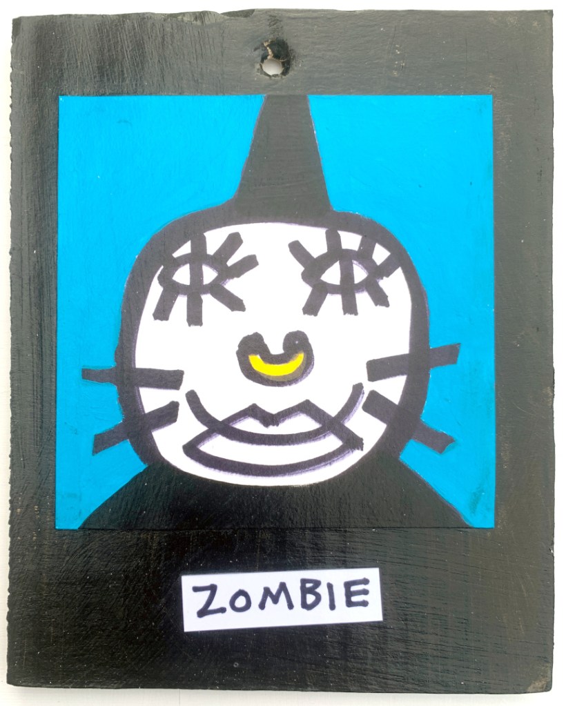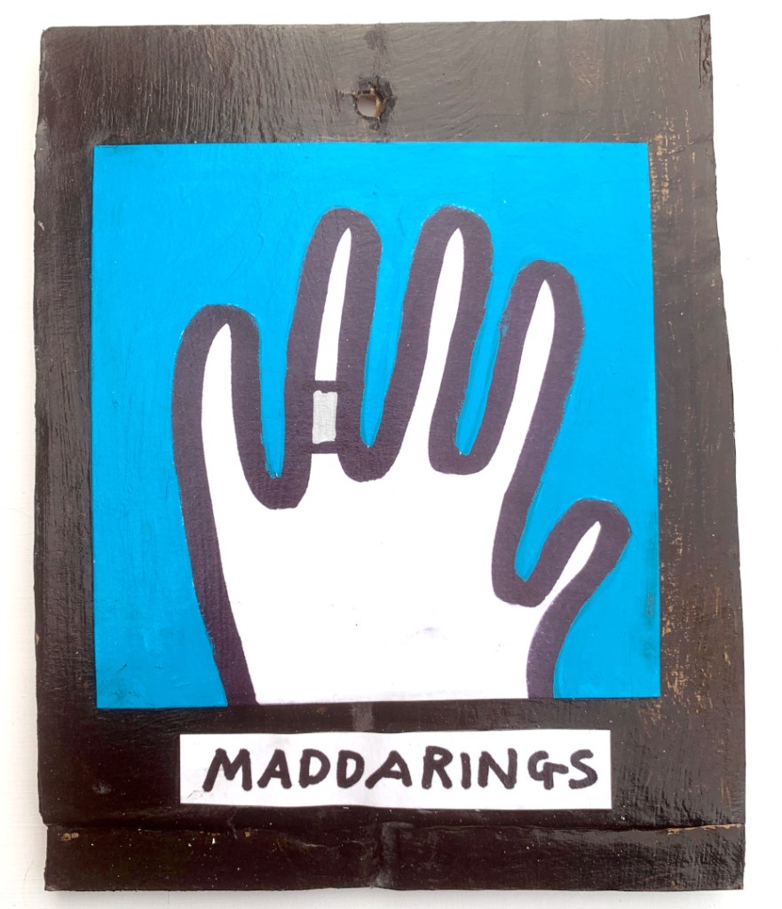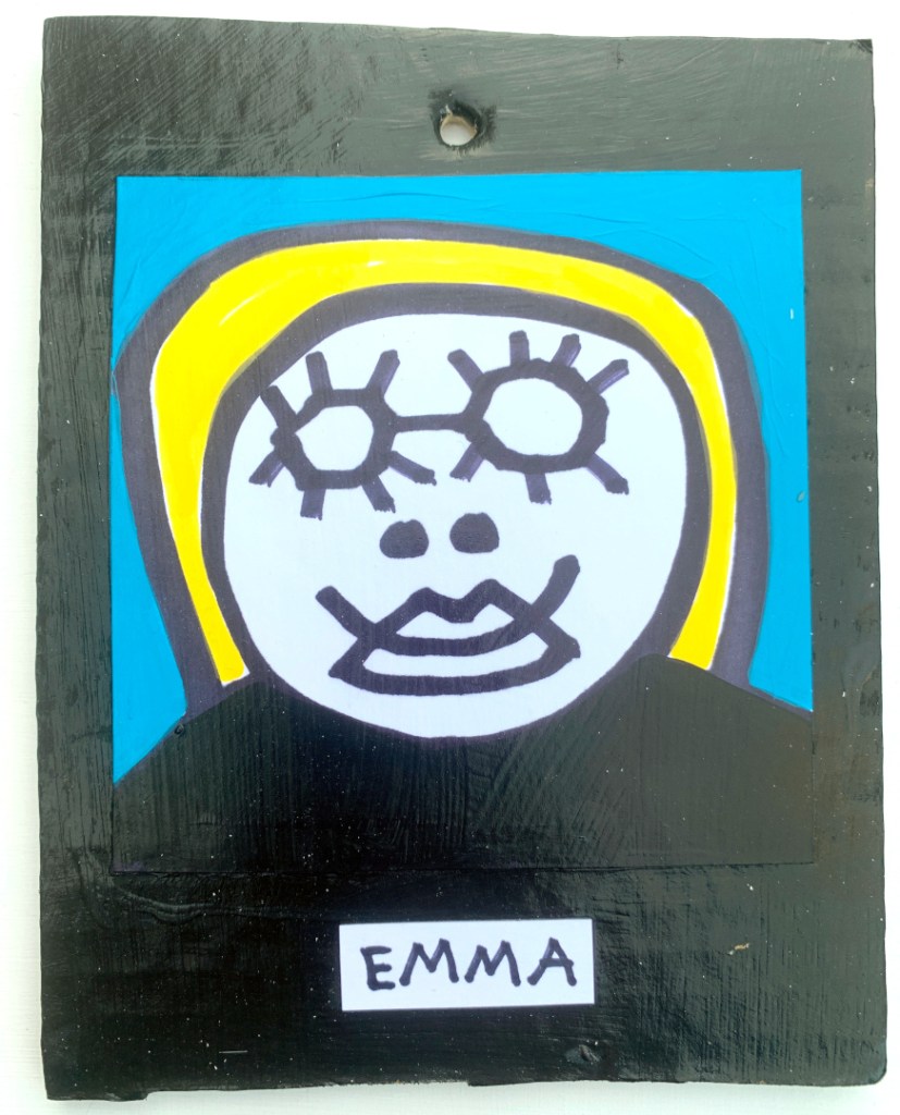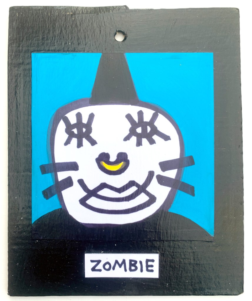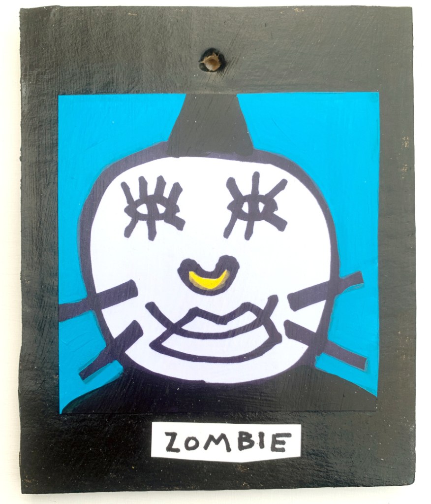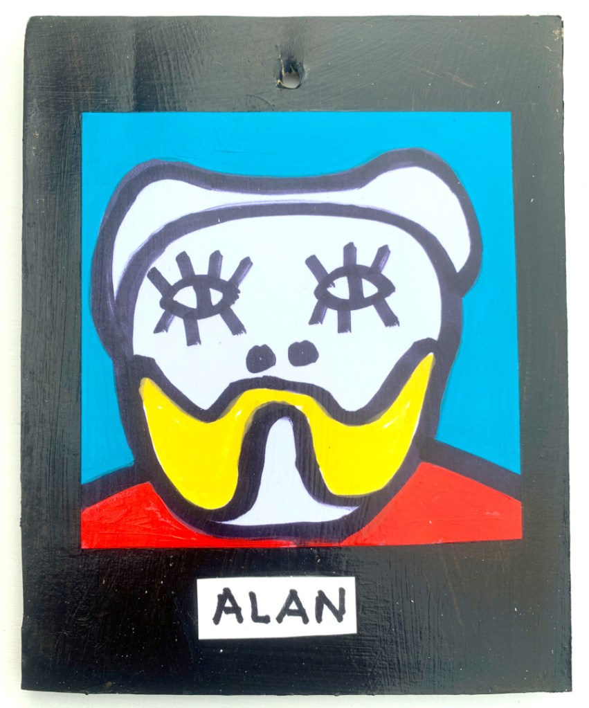 Acrylic on paper paintings, PVA glued onto thick, good quality cardboard rescued from the streets of Camden and Muswell Hill. Coated in PVA glue with hand-written info on the back in black Sharpie permanent marker.
