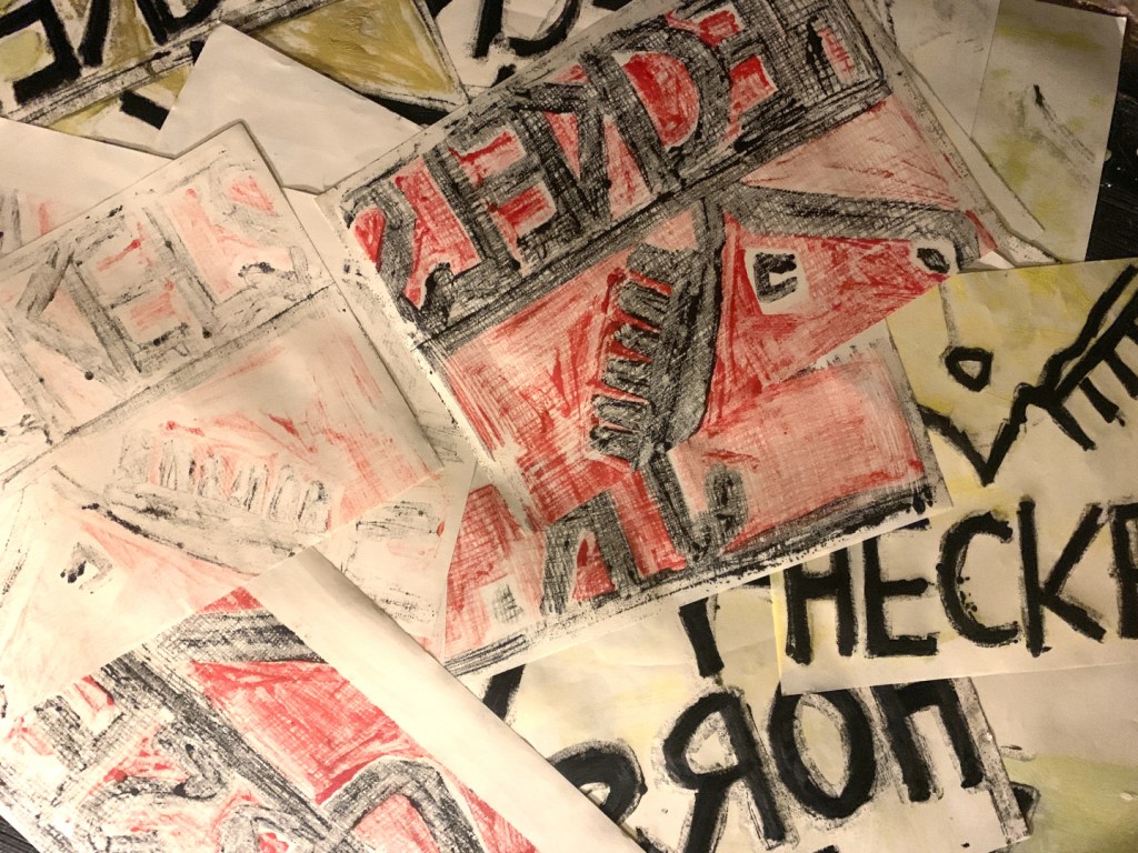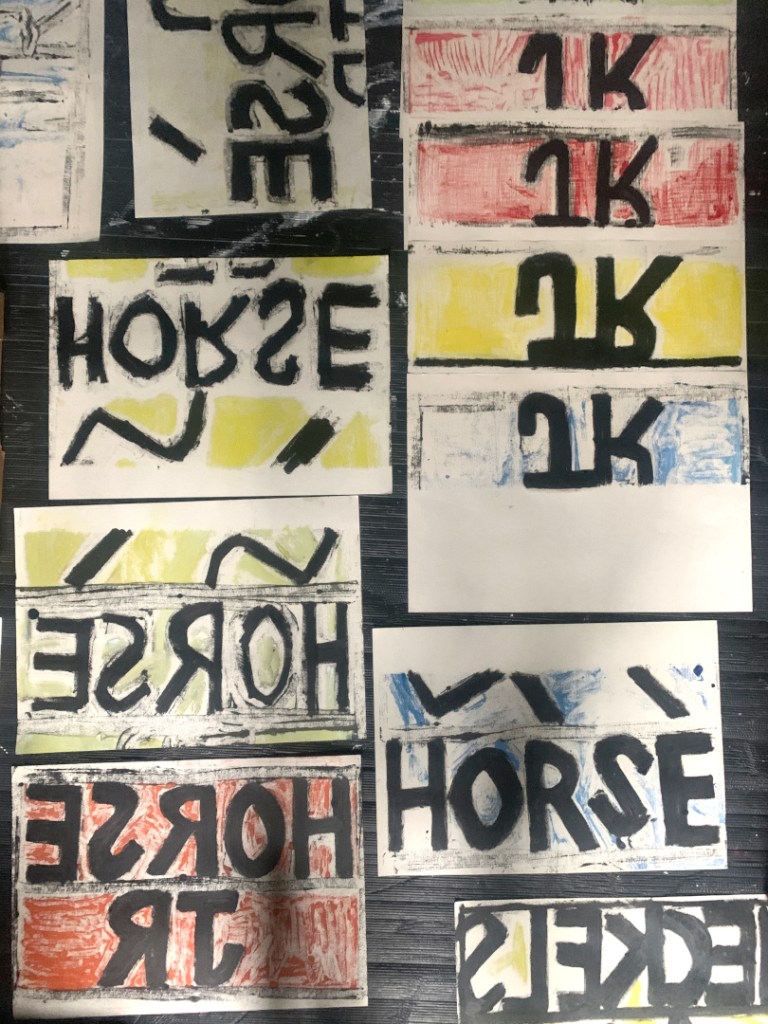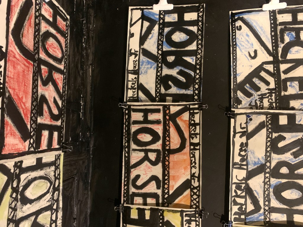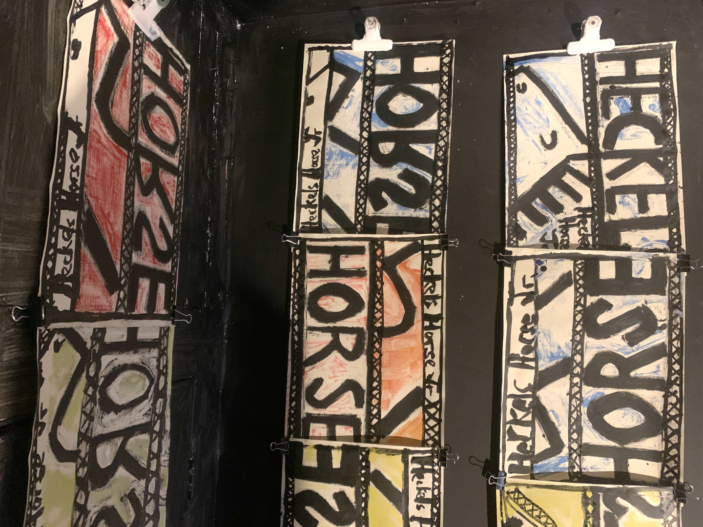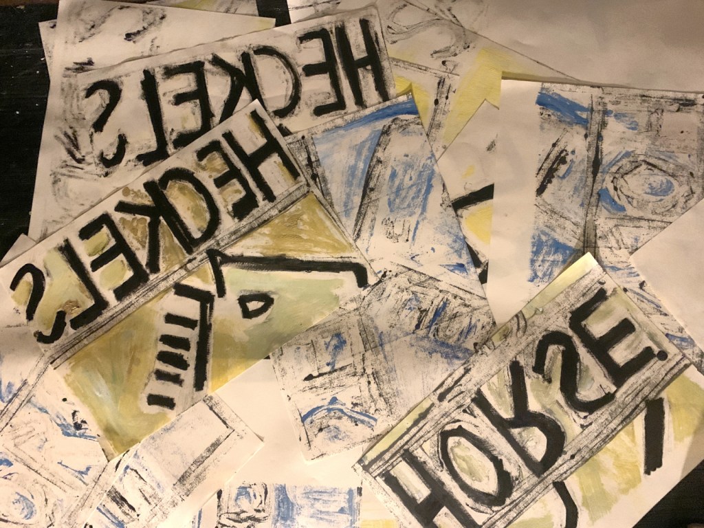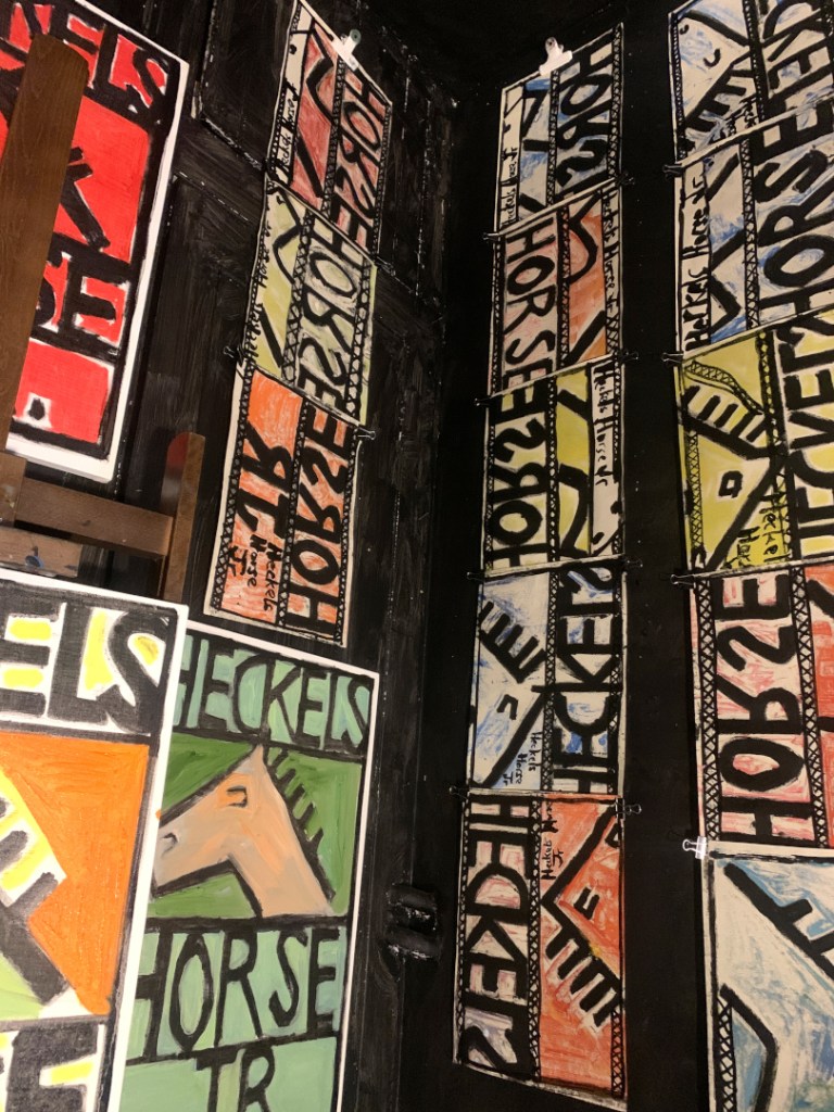 Heckel’s Horse Jr Heckel’s Horse Double Portraits. Acrylic on paper paintings. Three layers of red. Black Indian Ink and Posca pen outlines. Indiviually hand stamped title letters in Caligo Safewash oil based printing inks. PVA glued to thick cardboard, and PVA varnished. The handwritten text under the paintings is done in black posca pen and…