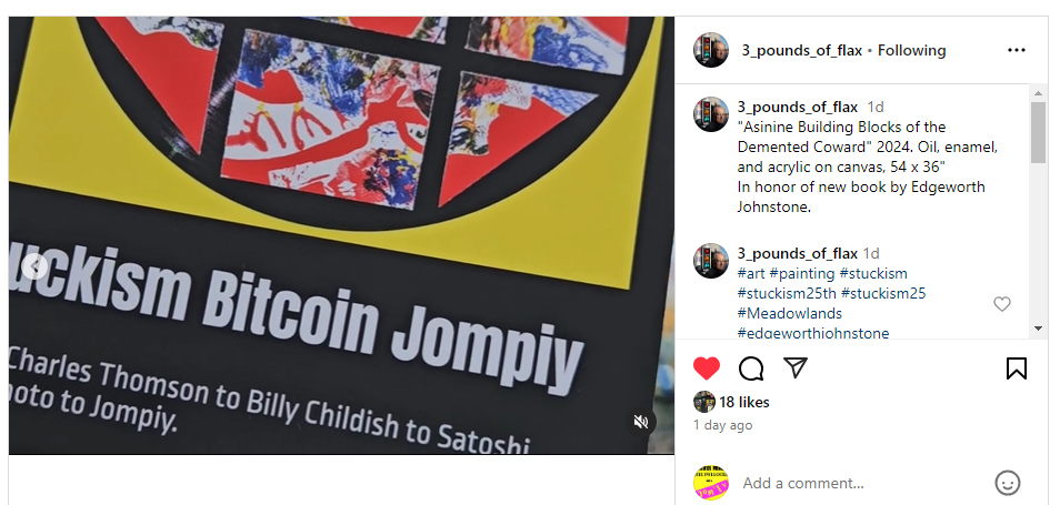 Stuckism Bitcoin Jompiy: From Charles Thomson to Billy Childish to Satoshi Nakamoto. Stuckism then Bitcoin then Jompiy. A book by Jompiy that won The Stomach Turner Prize 2024.