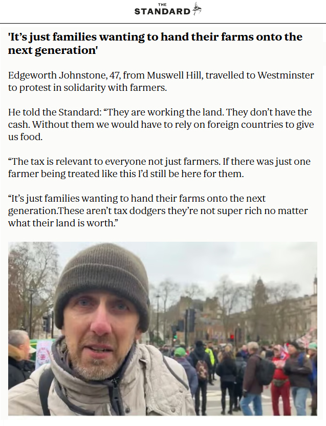 I’m officially claiming “Starmer Farmer Harmer”. I thought the slogan up on the bus last month and used it for my placard at the first demo, see “Protest 1” section below. Didn’t see my slogan anywhere at the first demo, other than on my placard. Now, at the second demo, it’s everywhere. Although some had re-ordered the words. Cheekier still, how about adding a “the” and selling it on Etsy?. Do I get commission? Even saw my exact slogan on the front of two of the tractors. When I took the same placard as I had at the first demo to the second one, today, this time, it had the “Starmer Farmer Harmer” written on both sides. Instantly double your audience. Probably doubled my copycats for the next demo. Maybe I should say “suspected plagiarism”, like I did Delaine Le Bas. Different story. Spoke to the Evening Standard:
