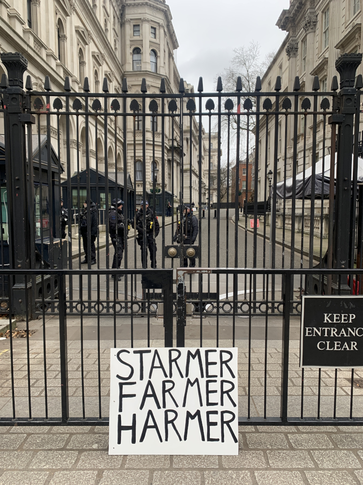 My main sign read “STARMER FARMER HARMER”. I put it up against the railings at Downing Street, outside Westminster tube and at the foot of Churchill’s statue near the Houses of Parliament. I also took another crap A4 sign that was too small, confusing, and factually inaccurate that had Starmer going after the farmers like Thatcher (as much as Wilson?) went after the miners.