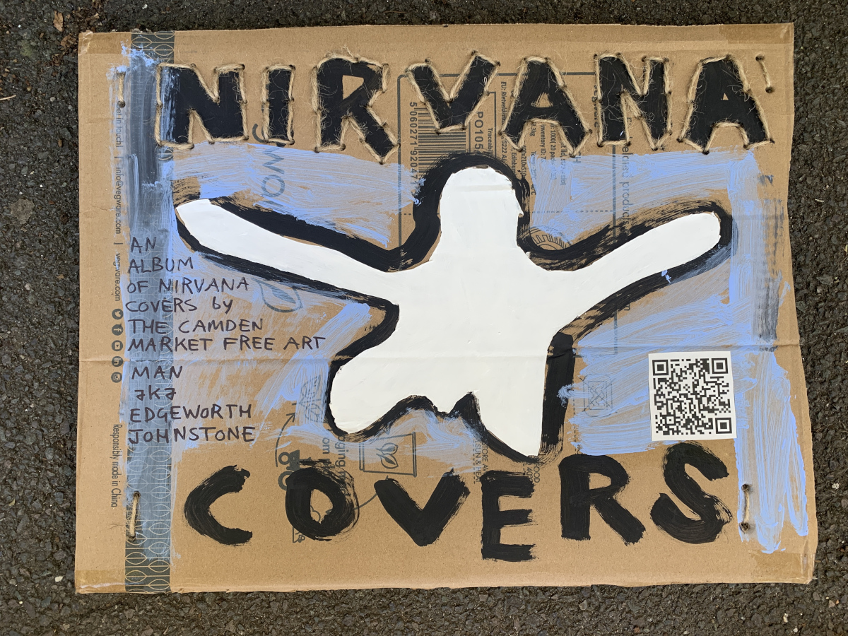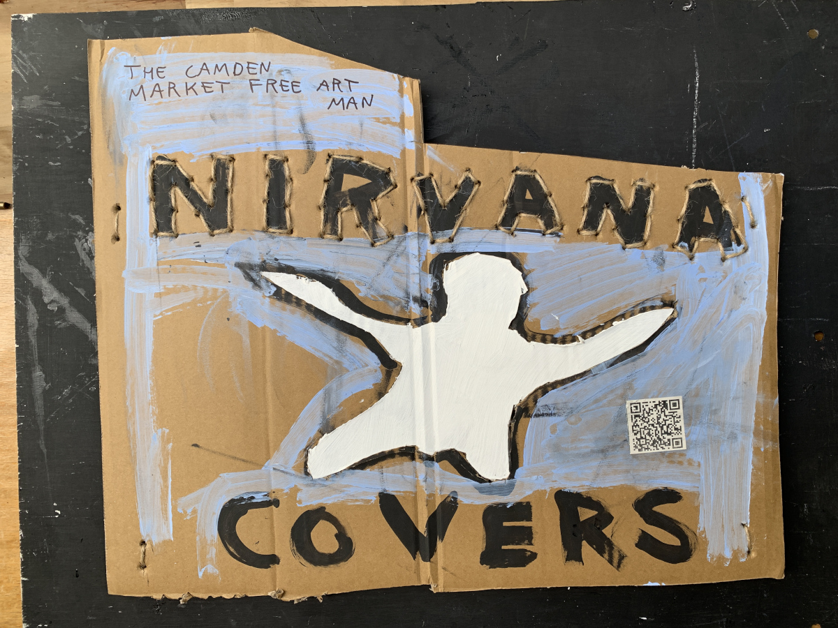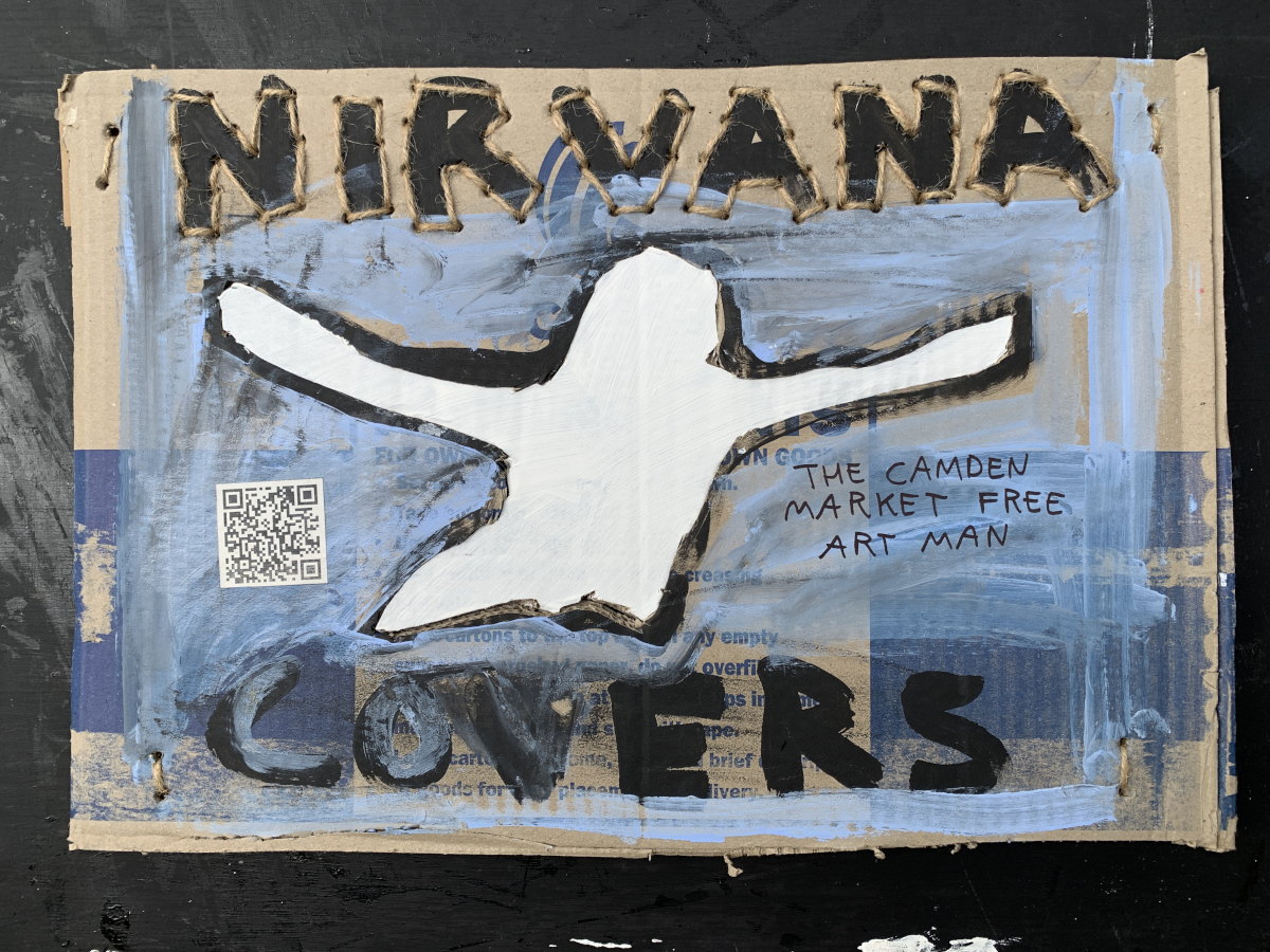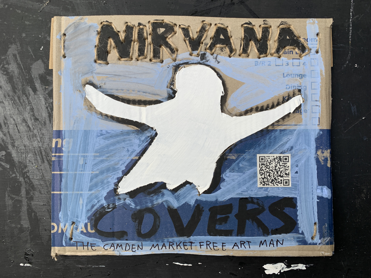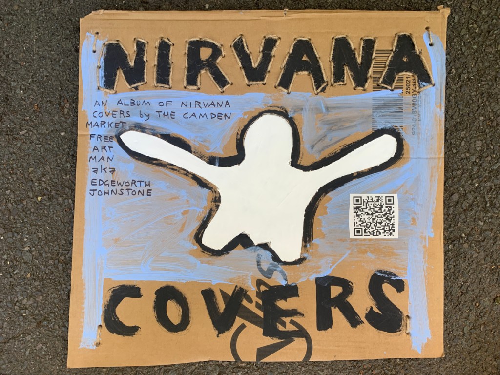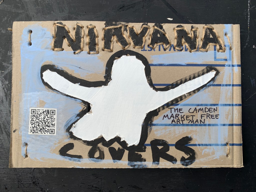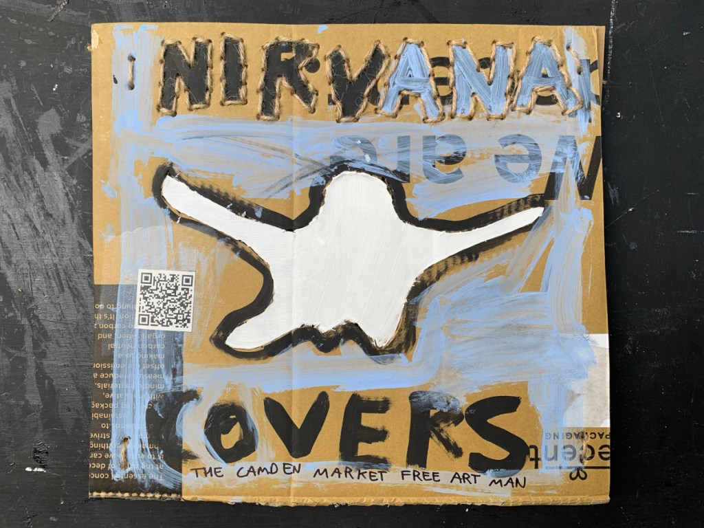 I make these 12 inch Nirvana LPs from second hand vinyl I buy in charity shops. Hand made monoprints on the album cover and face of the vinyl. They come in a clear crystal album sleeve, are signed and numbered and can be bought on my Etsy and Ebay shops. I also give them away at my Camden Market Free Art Man Political Protest Against Expensive Art. If you go to Camden and I’m not there, Moonlight Sculpture sell them on Maker’s Alley, near the Amy Winehouse statue and Cyberdog. See this Instagram post for a clearer picture of where that is: