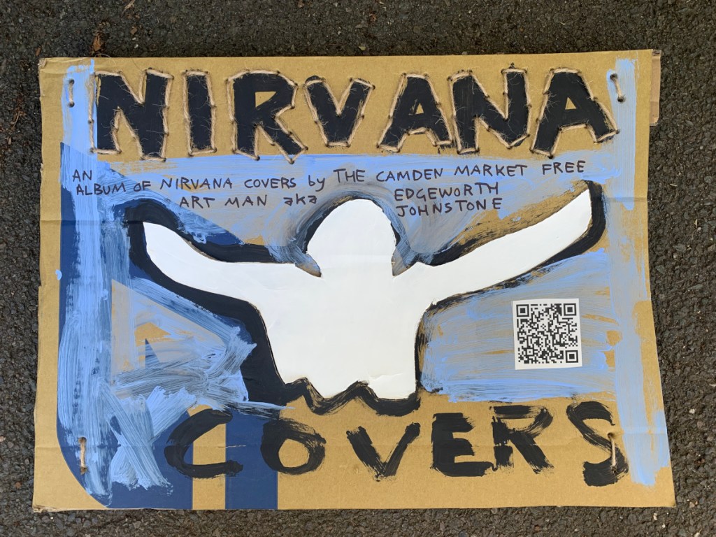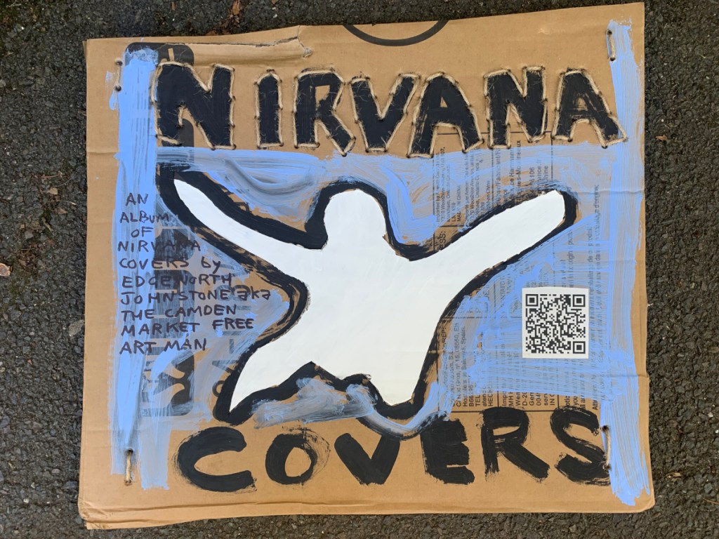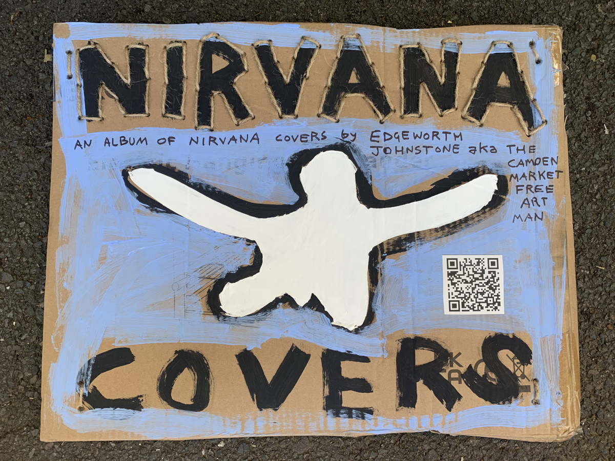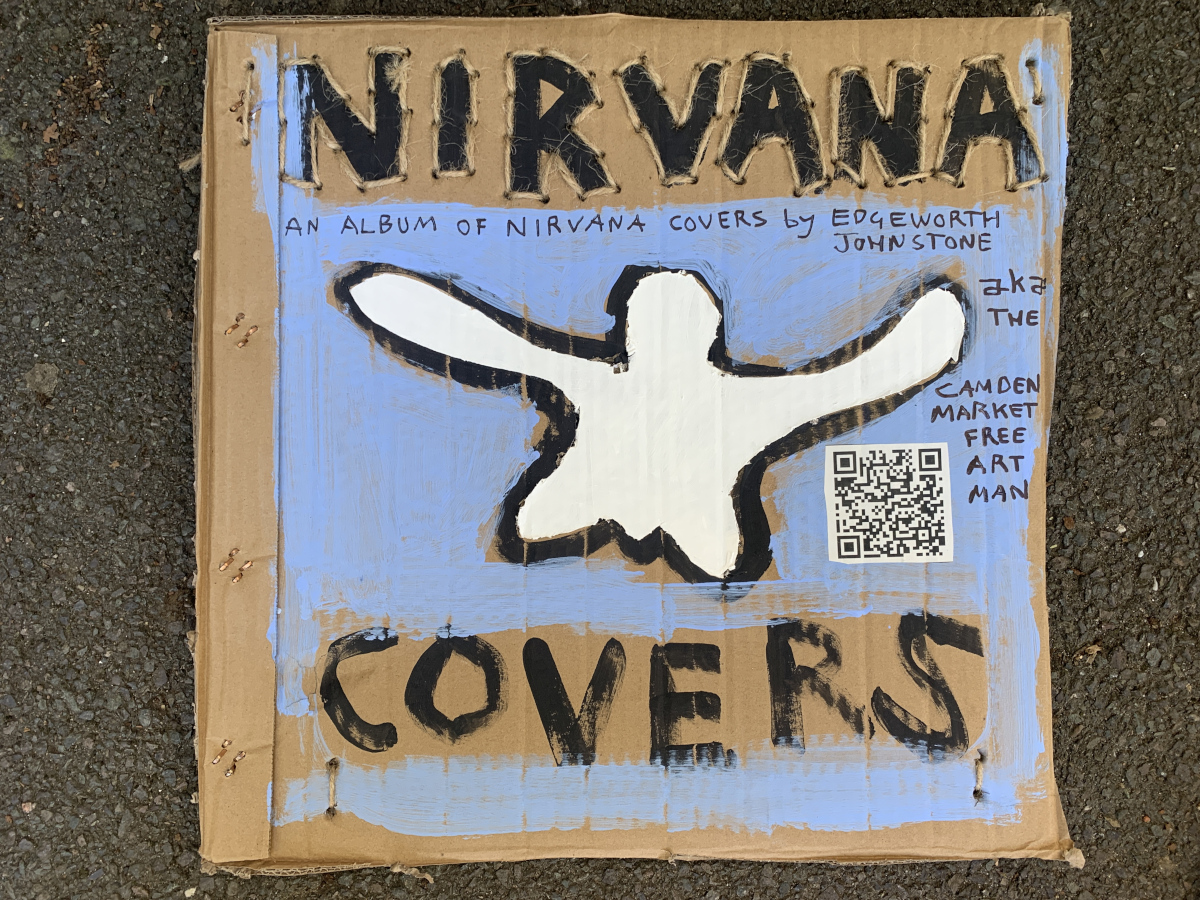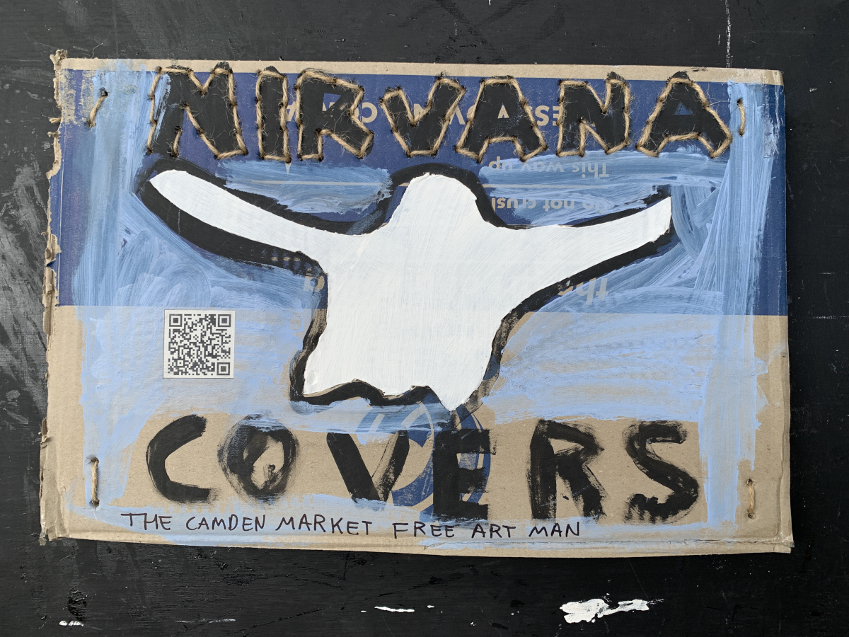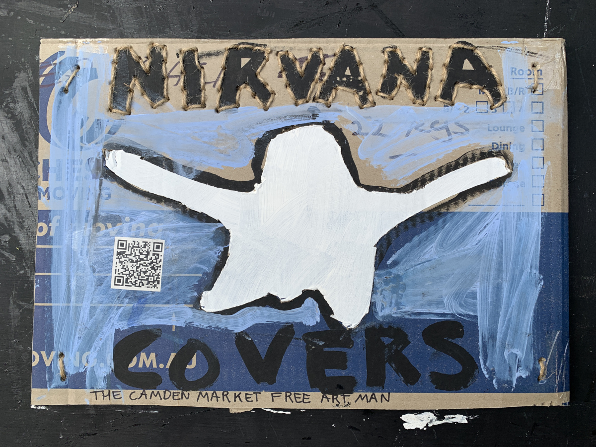 I make these 12 inch Nirvana LPs from second hand vinyl I buy in charity shops. Hand made monoprints on the album cover and face of the vinyl. They come in a clear crystal album sleeve, are signed and numbered and can be bought on my Etsy and Ebay shops. I also give them away at my Camden Market Free Art Man Political Protest Against Expensive Art. If you go to Camden and I’m not there, Moonlight Sculpture sell them on Maker’s Alley, near the Amy Winehouse statue and Cyberdog. See this Instagram post for a clearer picture of where that is: