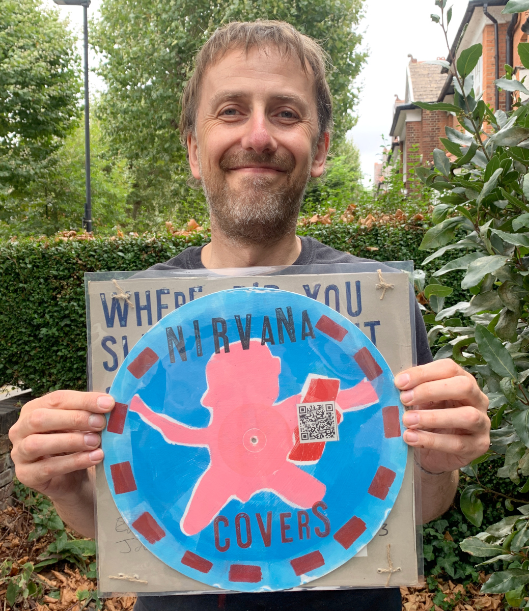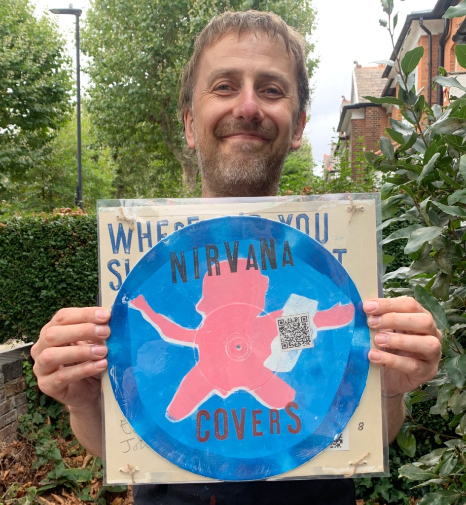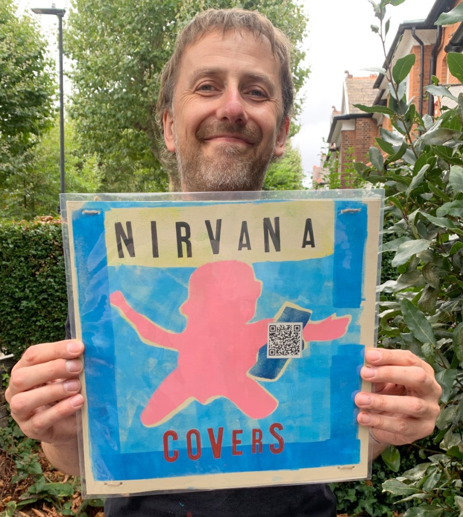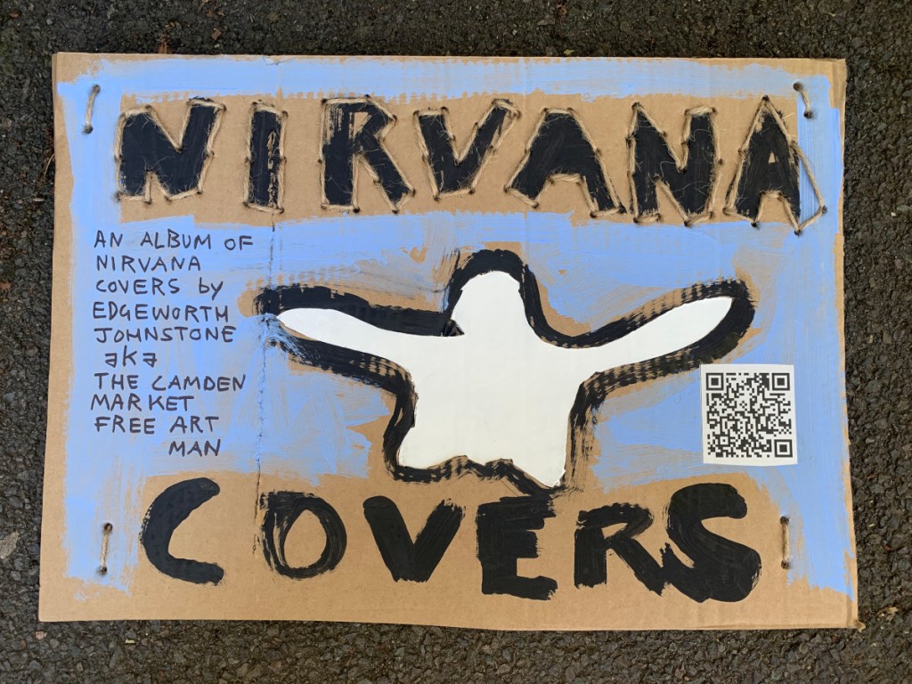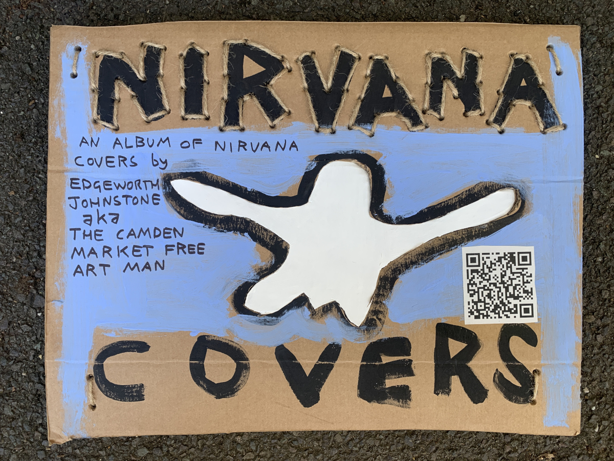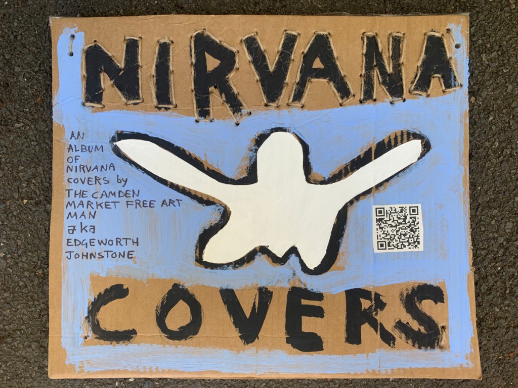 I make these 12 inch Nirvana LPs from second hand vinyl I buy in charity shops. Hand made monoprints on the album cover and face of the vinyl. They come in a clear crystal album sleeve, are signed and numbered and can be bought on my Etsy and Ebay shops. I also give them away at my Camden Market Free Art Man Political Protest Against Expensive Art. If you go to Camden and I’m not there, Moonlight Sculpture sell them on Maker’s Alley, near the Amy Winehouse statue and Cyberdog. See this Instagram post for a clearer picture of where that is: