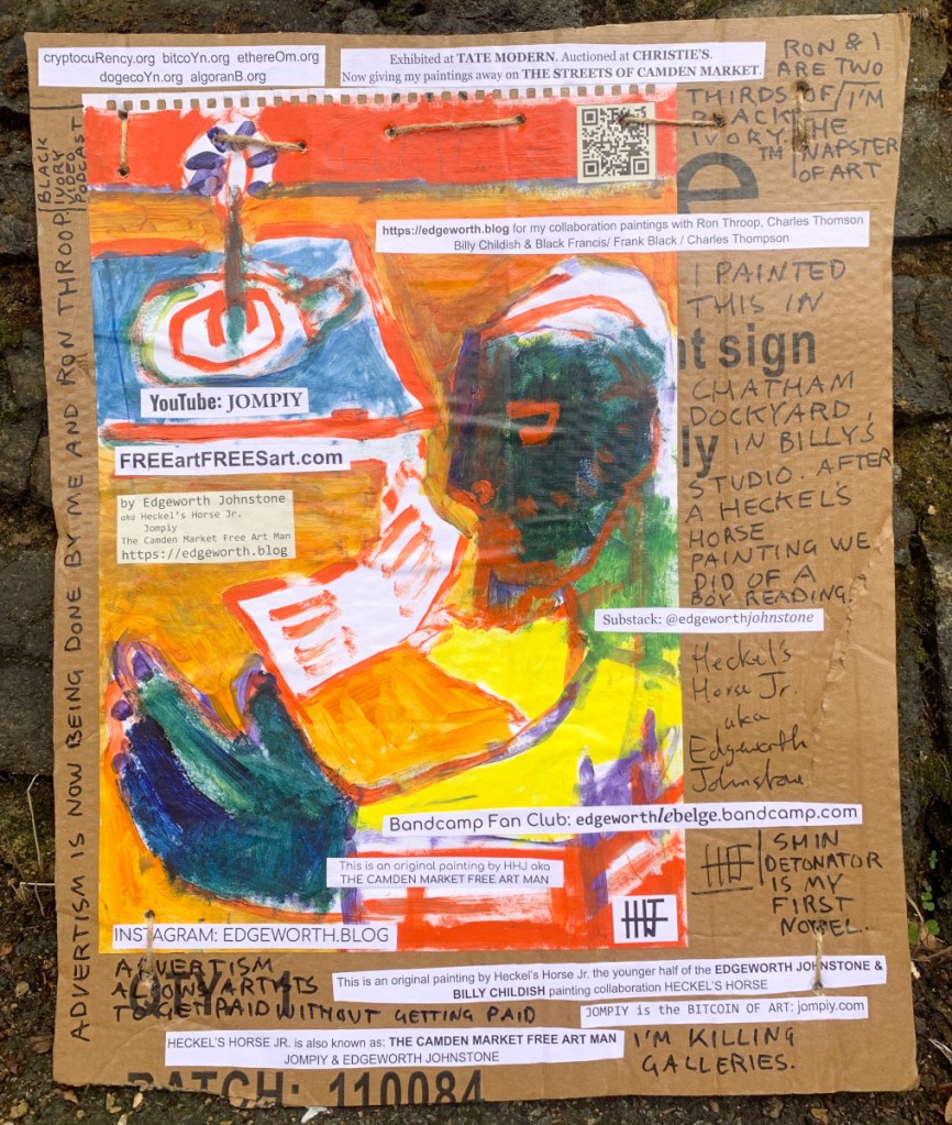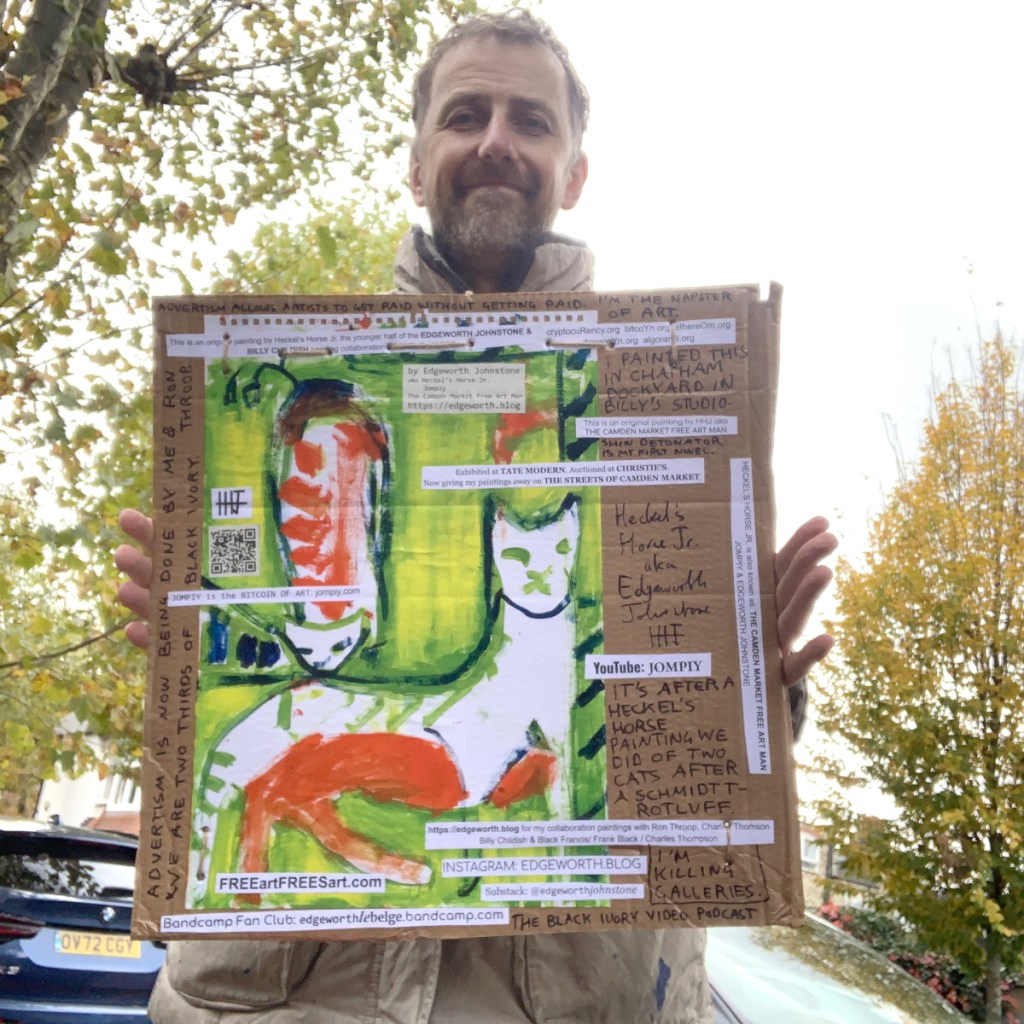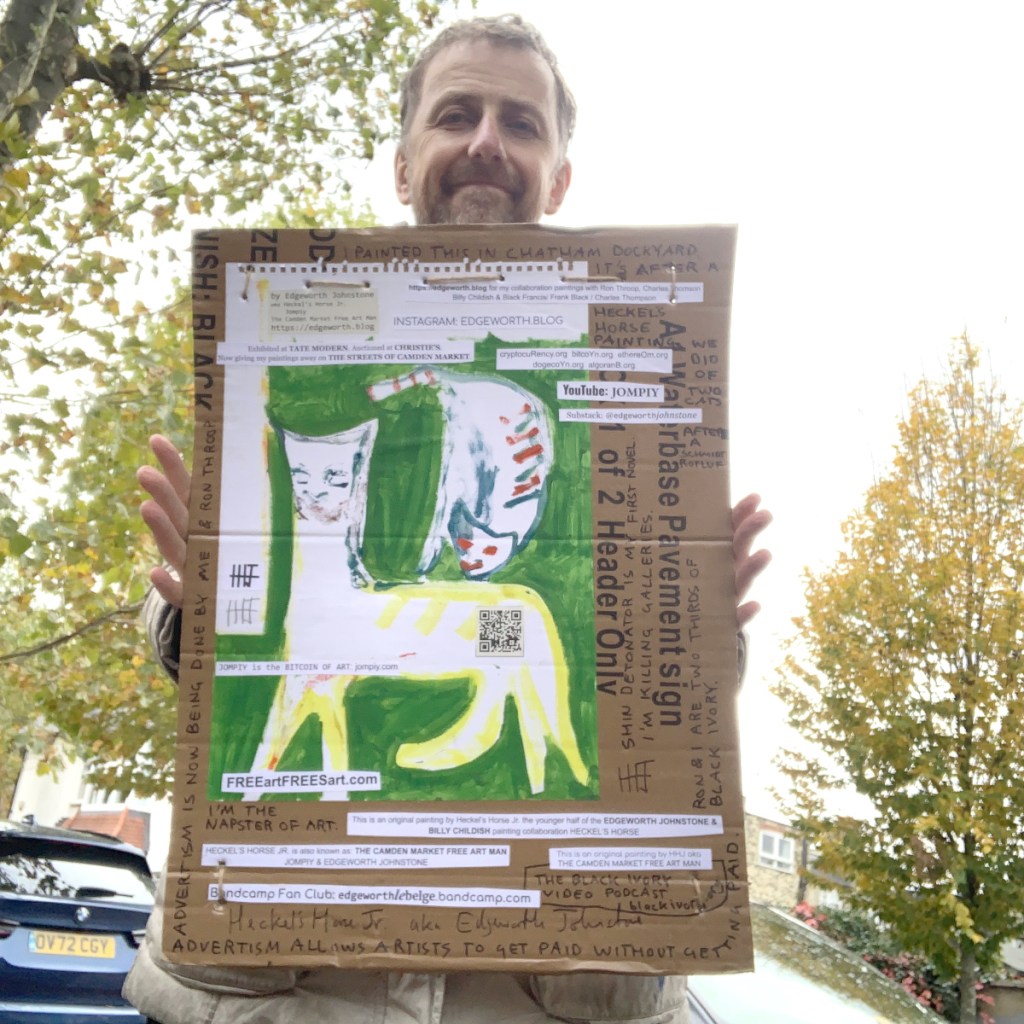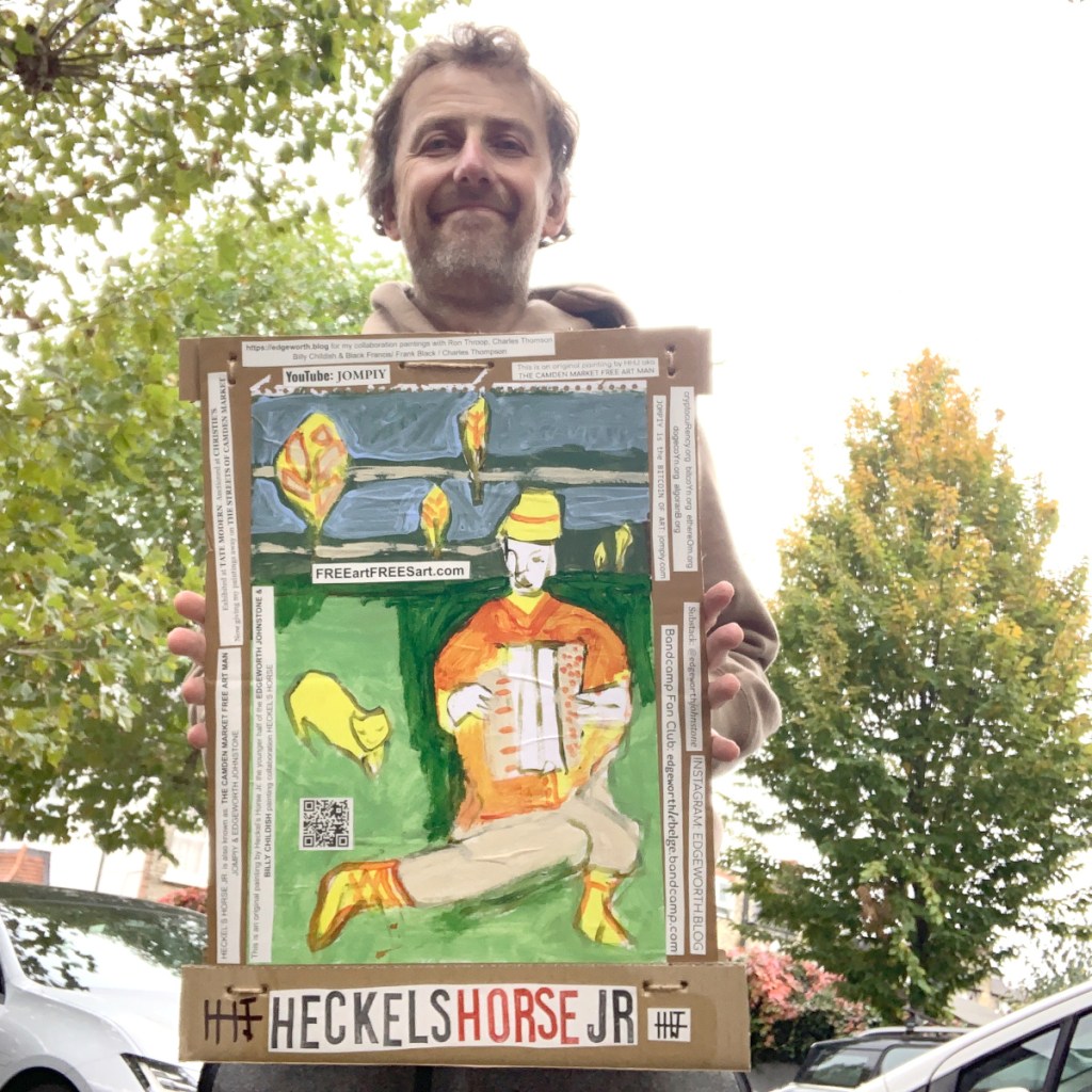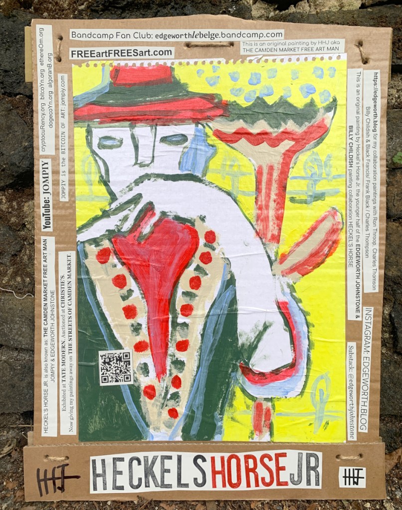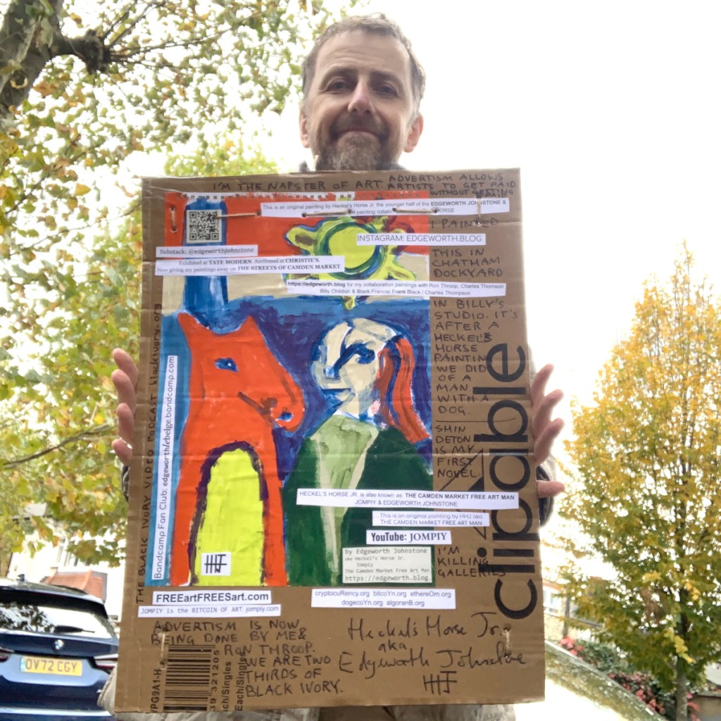 I make these 12 inch Nirvana LPs from second hand vinyl I buy in charity shops. Hand made monoprints on the album cover and face of the vinyl. They come in a clear crystal album sleeve, are signed and numbered and can be bought on my Etsy and Ebay shops. I also give them away at my Camden Market Free Art Man Political Protest Against Expensive Art. If you go to Camden and I’m not there, Moonlight Sculpture sell them on Maker’s Alley, near the Amy Winehouse statue and Cyberdog. See this Instagram post for a clearer picture of where that is: