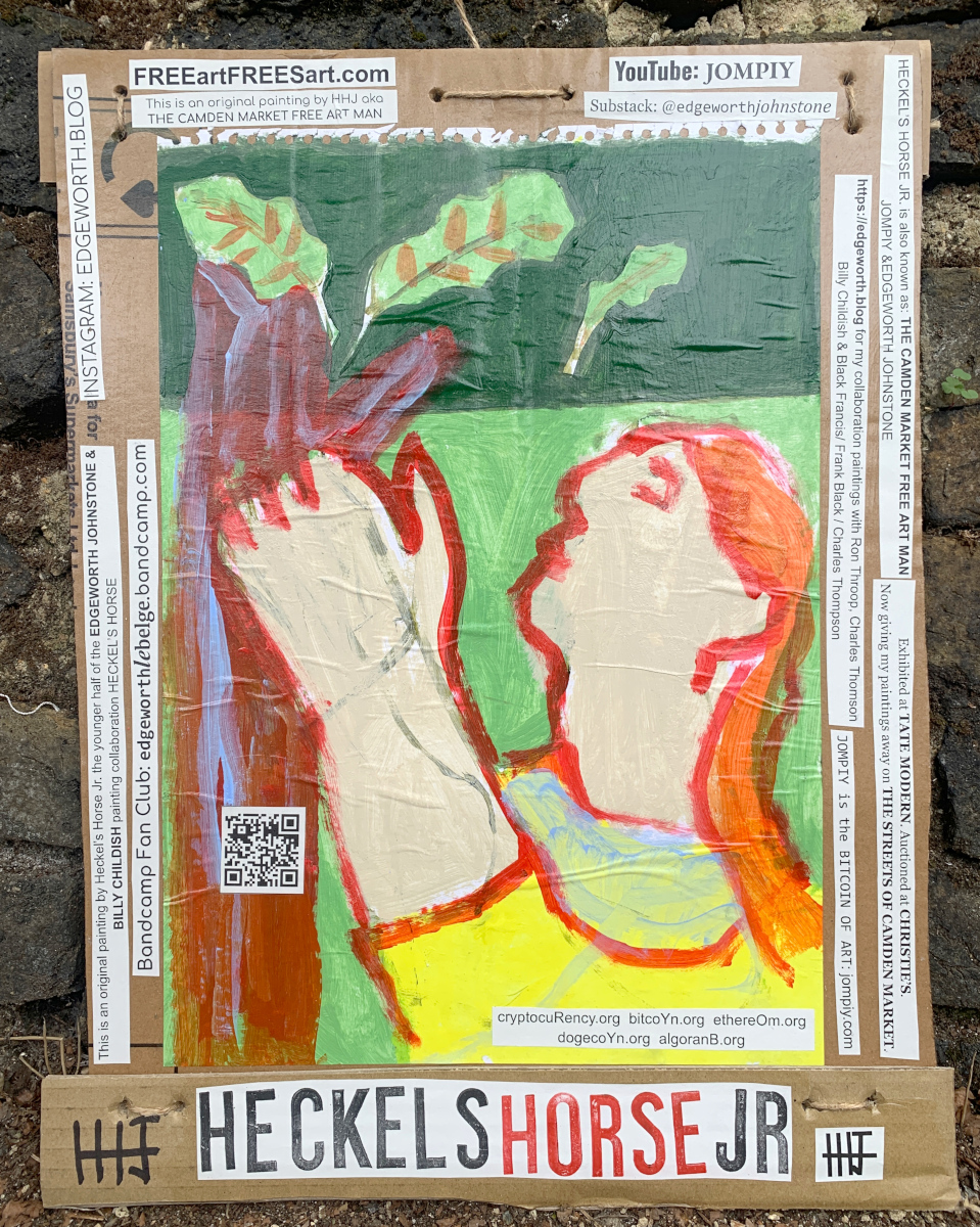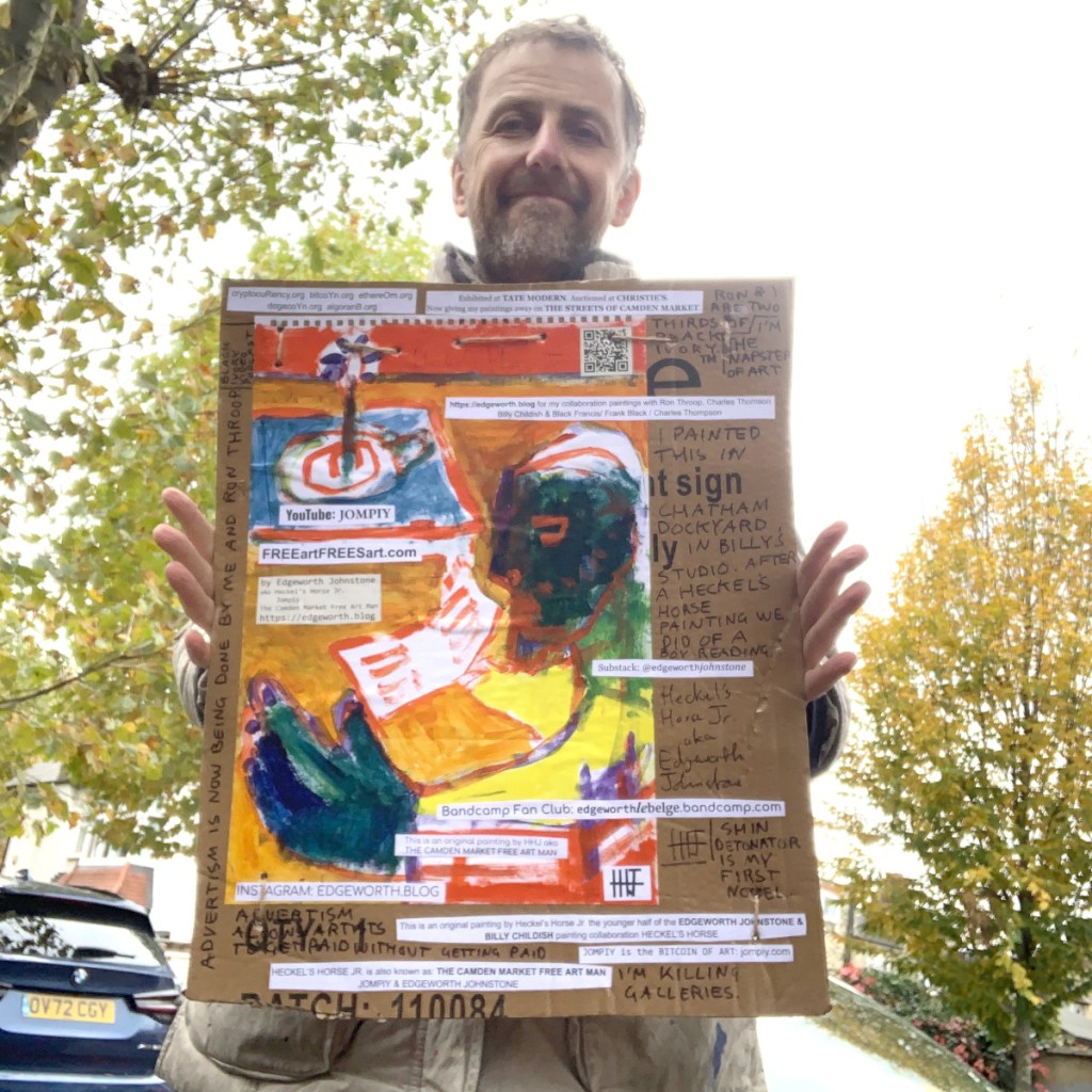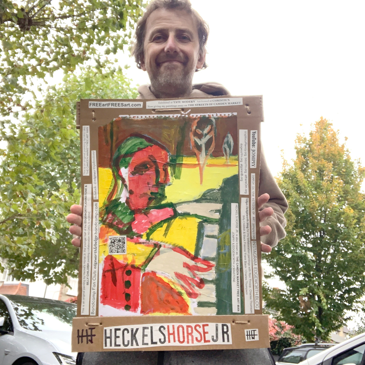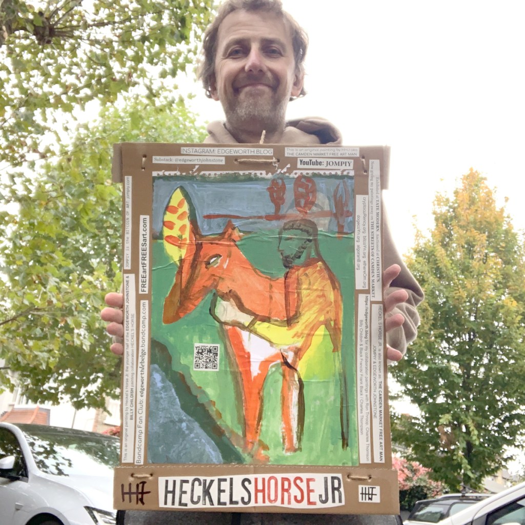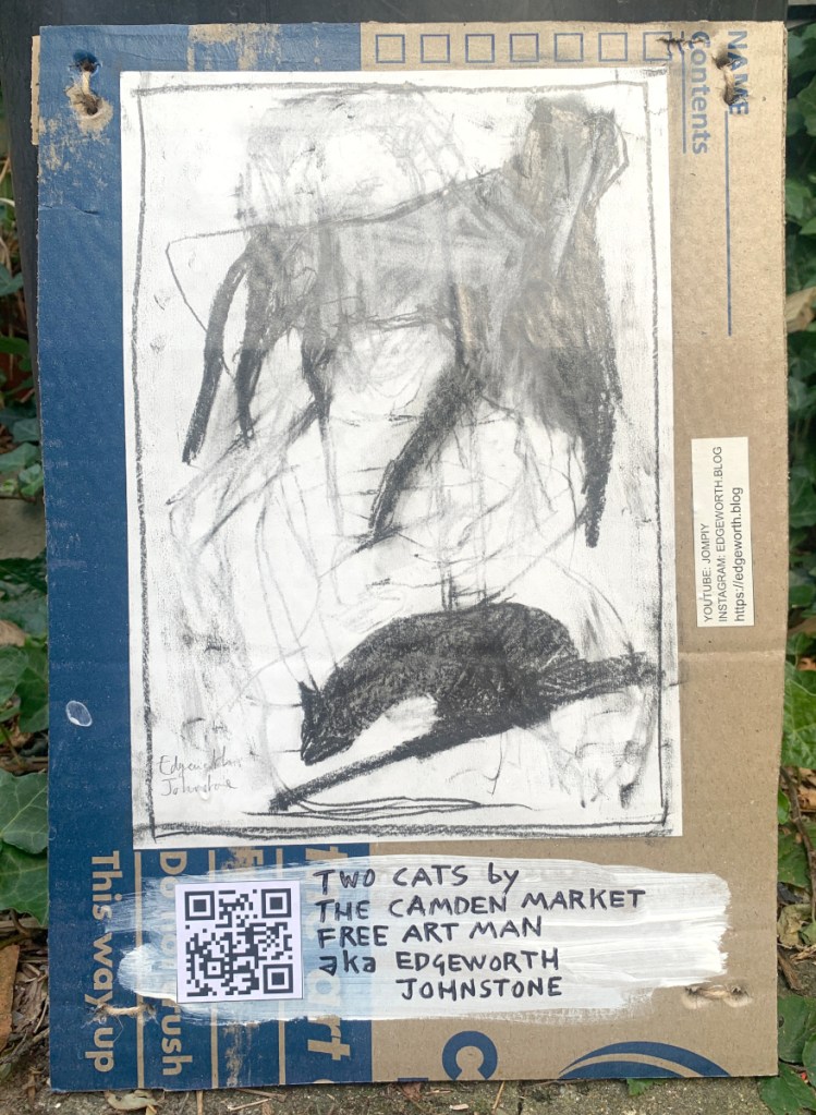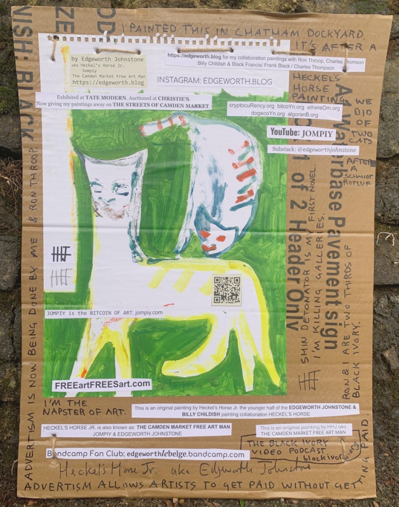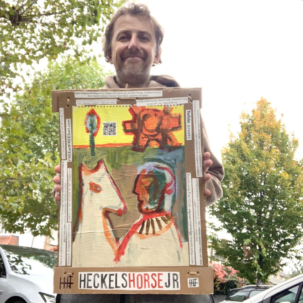 I make these 12 inch Nirvana LPs from second hand vinyl I buy in charity shops. Hand made monoprints on the album cover and face of the vinyl. They come in a clear crystal album sleeve, are signed and numbered and can be bought on my Etsy and Ebay shops. I also give them away at my Camden Market Free Art Man Political Protest Against Expensive Art. If you go to Camden and I’m not there, Moonlight Sculpture sell them on Maker’s Alley, near the Amy Winehouse statue and Cyberdog. See this Instagram post for a clearer picture of where that is: