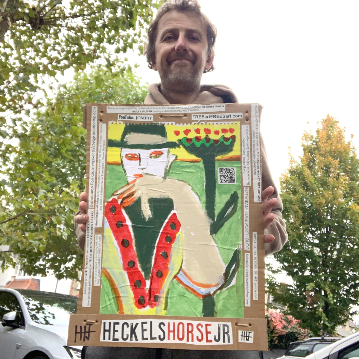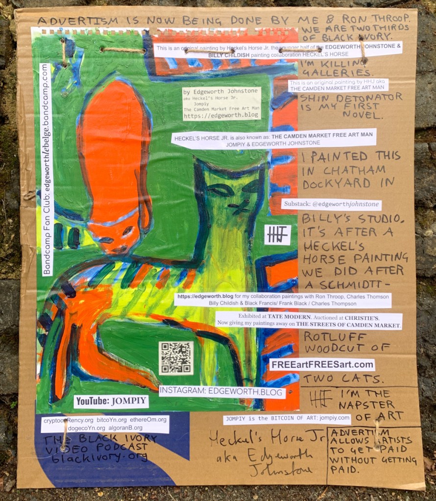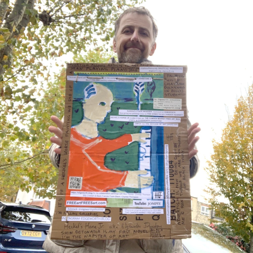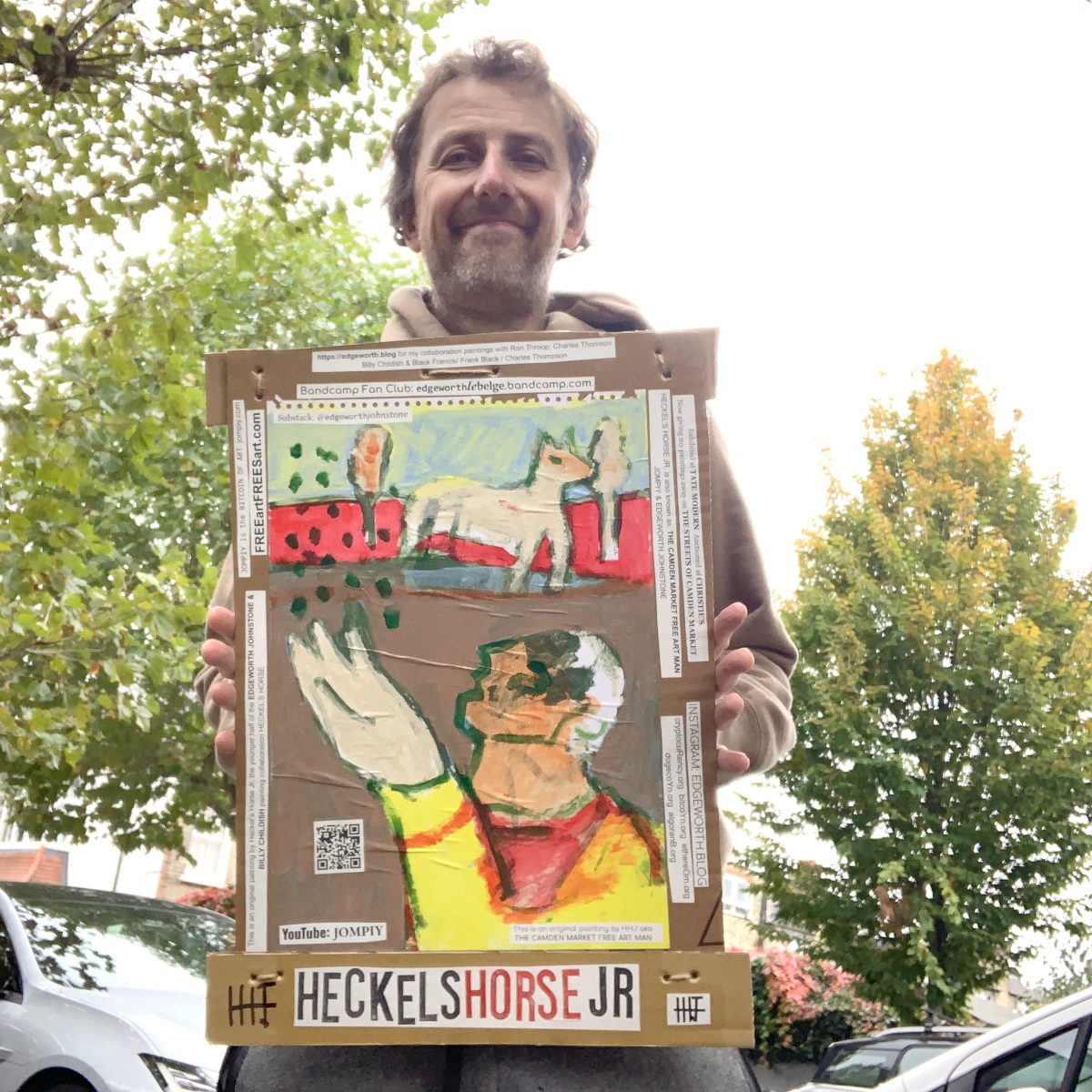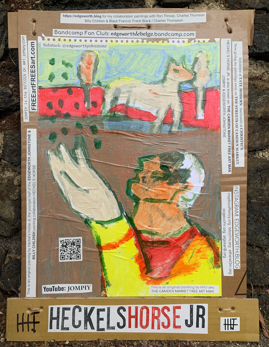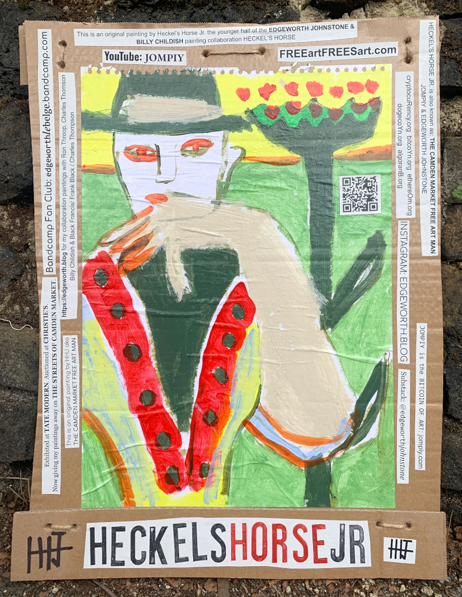 I make these 12 inch Nirvana LPs from second hand vinyl I buy in charity shops. Hand made monoprints on the album cover and face of the vinyl. They come in a clear crystal album sleeve, are signed and numbered and can be bought on my Etsy and Ebay shops. I also give them away at my Camden Market Free Art Man Political Protest Against Expensive Art. If you go to Camden and I’m not there, Moonlight Sculpture sell them on Maker’s Alley, near the Amy Winehouse statue and Cyberdog. See this Instagram post for a clearer picture of where that is: