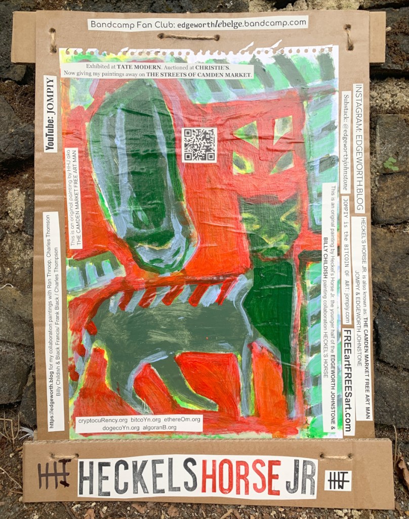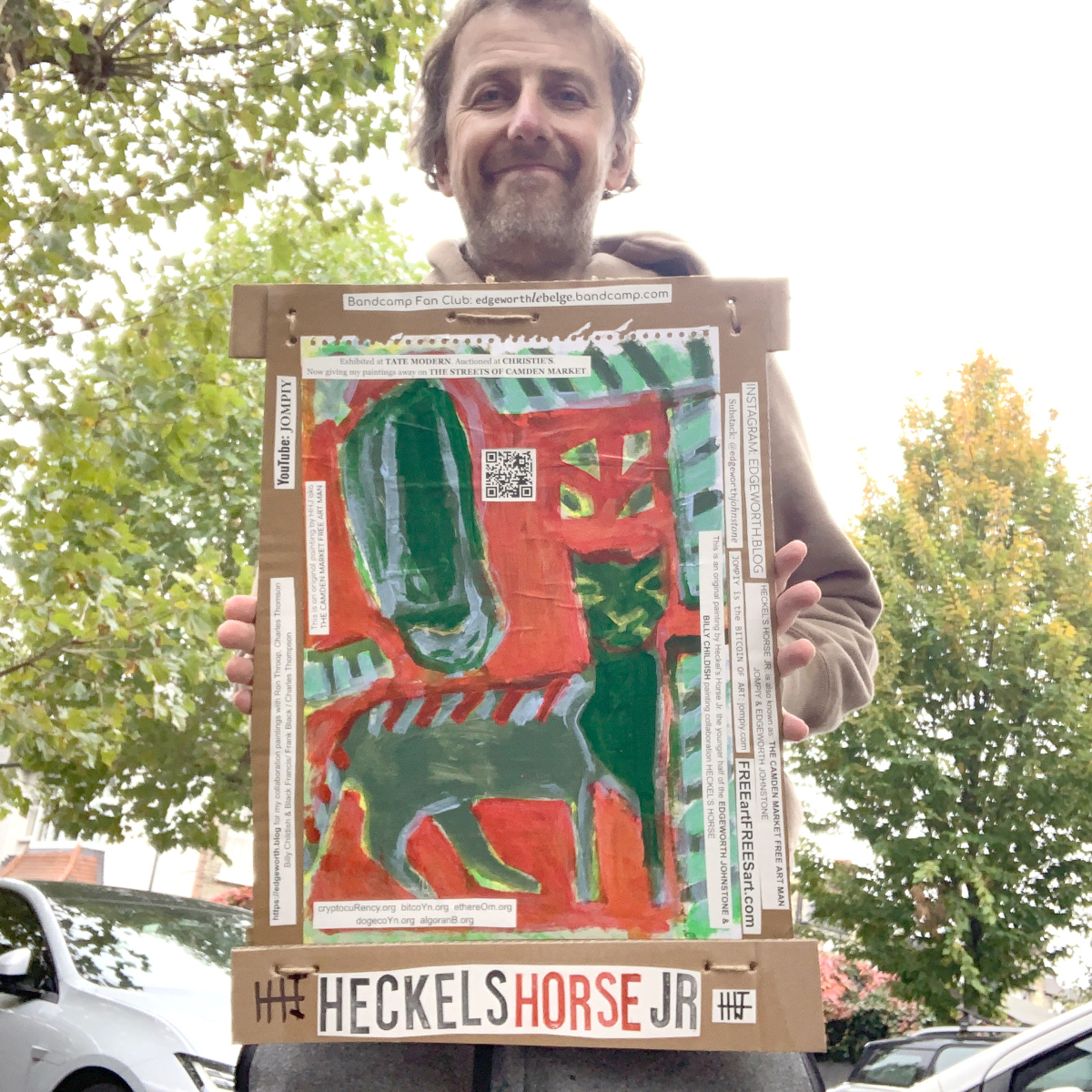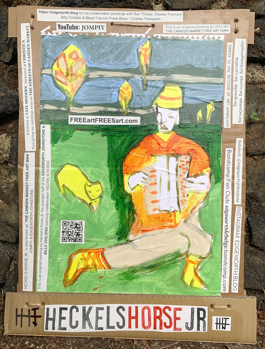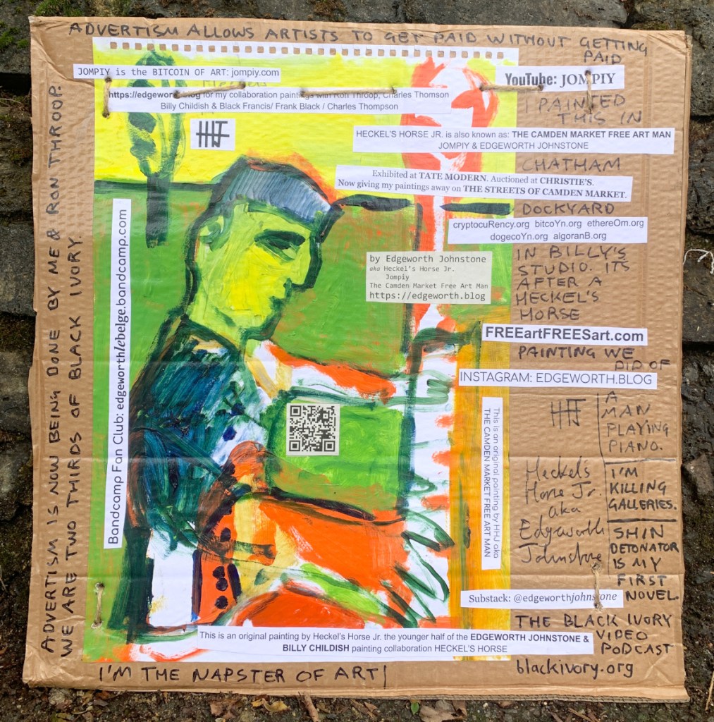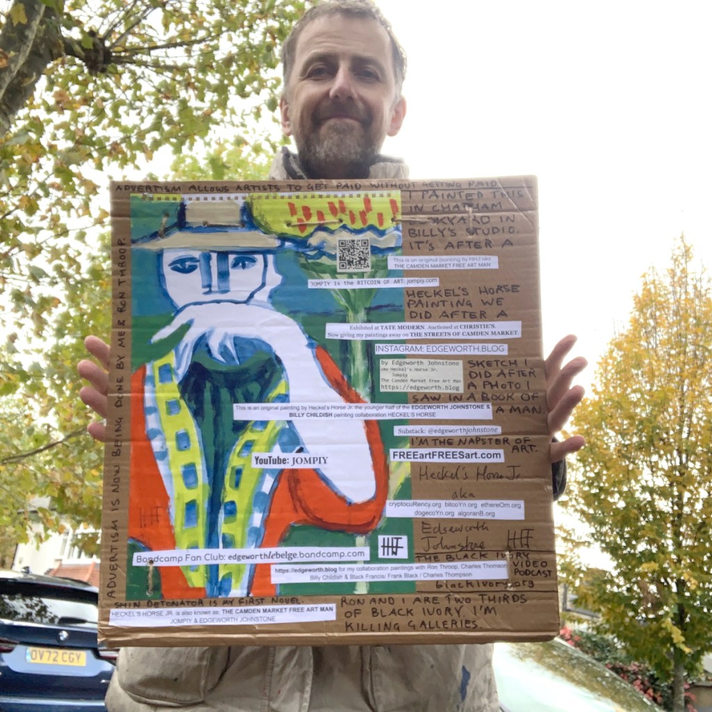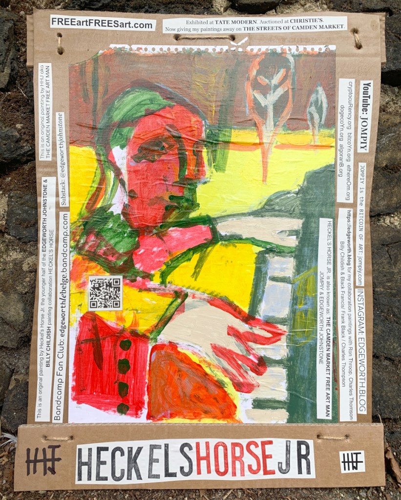 I make these 12 inch Nirvana LPs from second hand vinyl I buy in charity shops. Hand made monoprints on the album cover and face of the vinyl. They come in a clear crystal album sleeve, are signed and numbered and can be bought on my Etsy and Ebay shops. I also give them away at my Camden Market Free Art Man Political Protest Against Expensive Art. If you go to Camden and I’m not there, Moonlight Sculpture sell them on Maker’s Alley, near the Amy Winehouse statue and Cyberdog. See this Instagram post for a clearer picture of where that is: