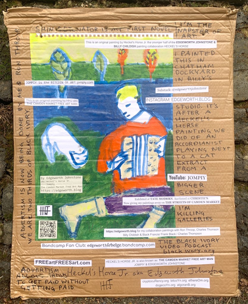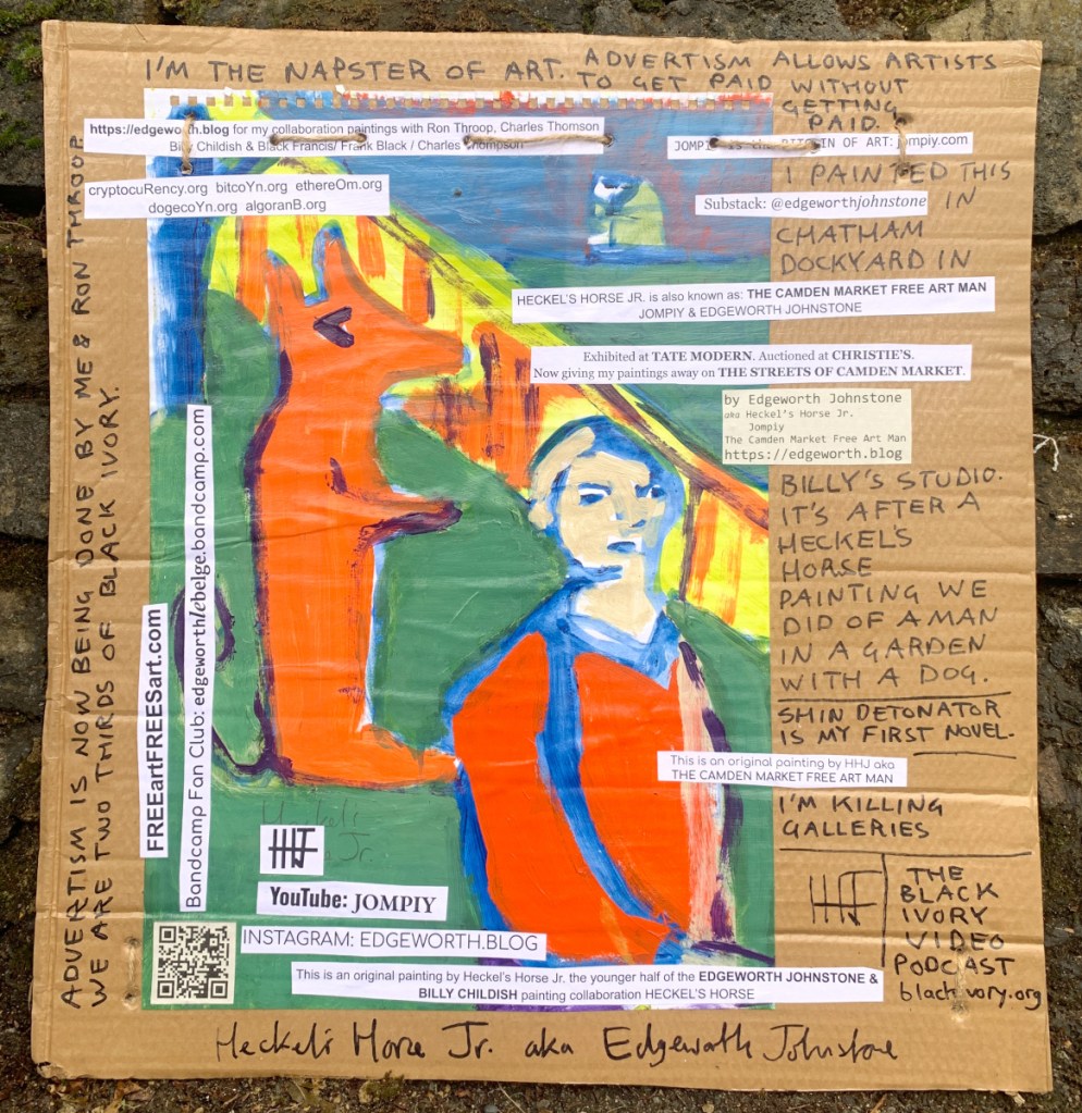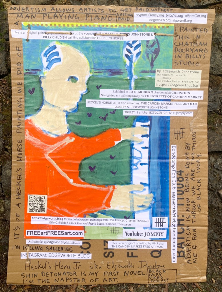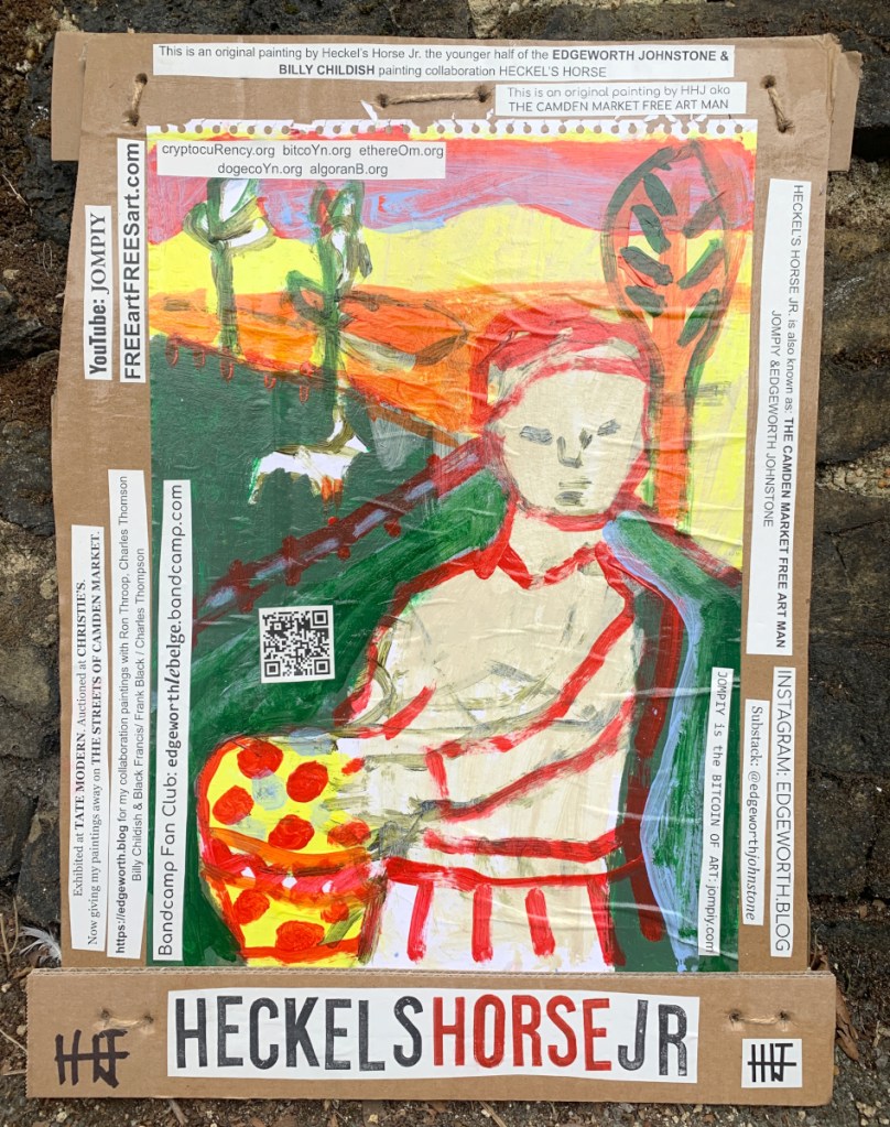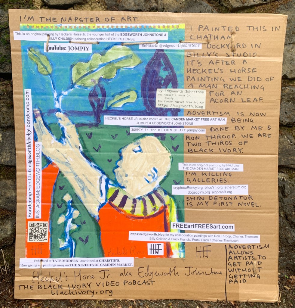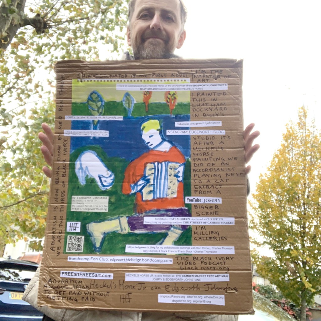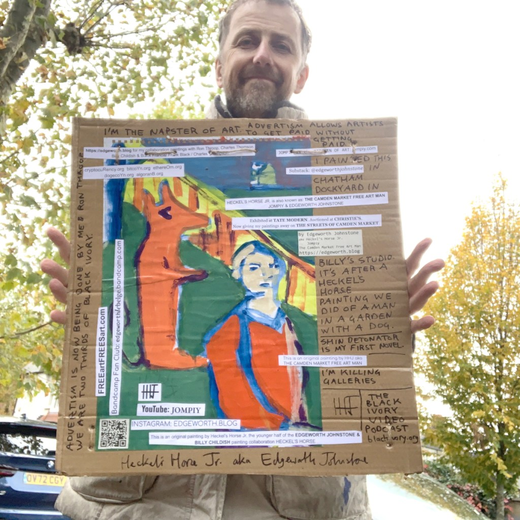 I make these 12 inch Nirvana LPs from second hand vinyl I buy in charity shops. Hand made monoprints on the album cover and face of the vinyl. They come in a clear crystal album sleeve, are signed and numbered and can be bought on my Etsy and Ebay shops. I also give them away at my Camden Market Free Art Man Political Protest Against Expensive Art. If you go to Camden and I’m not there, Moonlight Sculpture sell them on Maker’s Alley, near the Amy Winehouse statue and Cyberdog. See this Instagram post for a clearer picture of where that is: