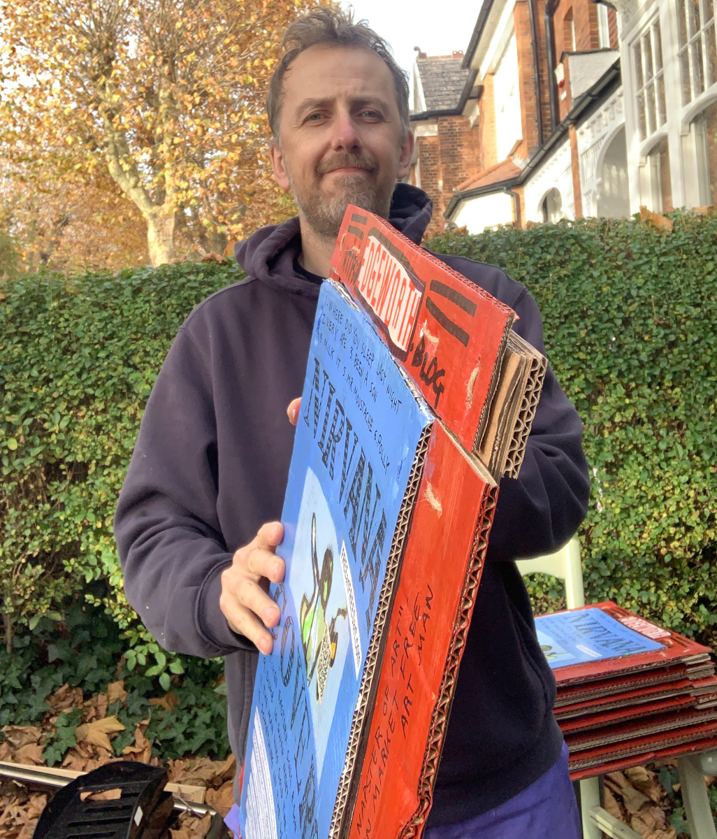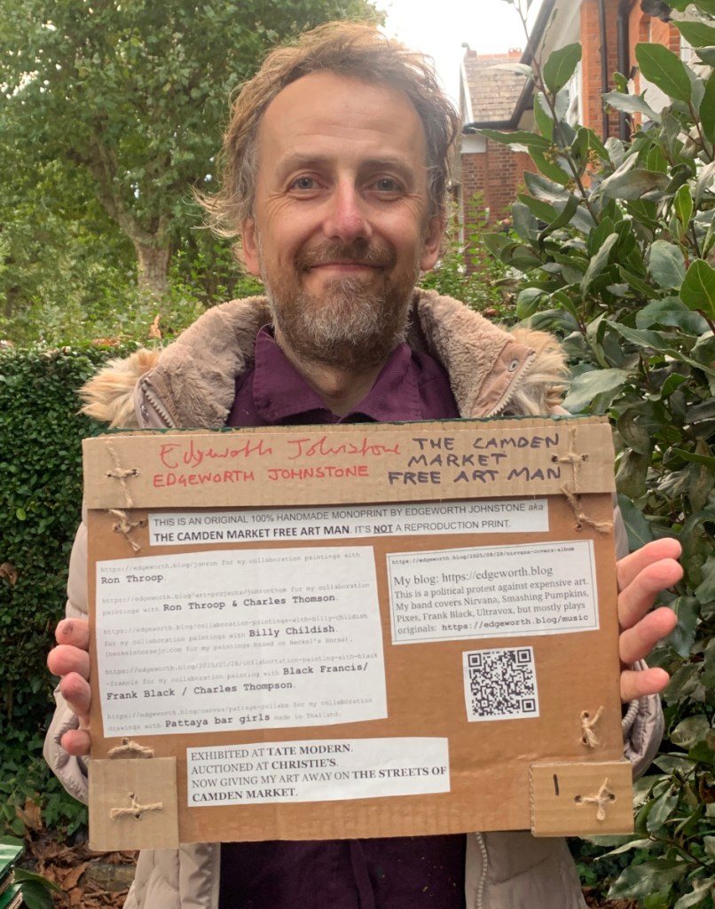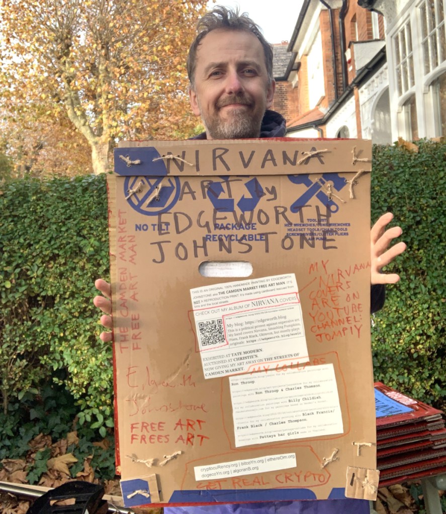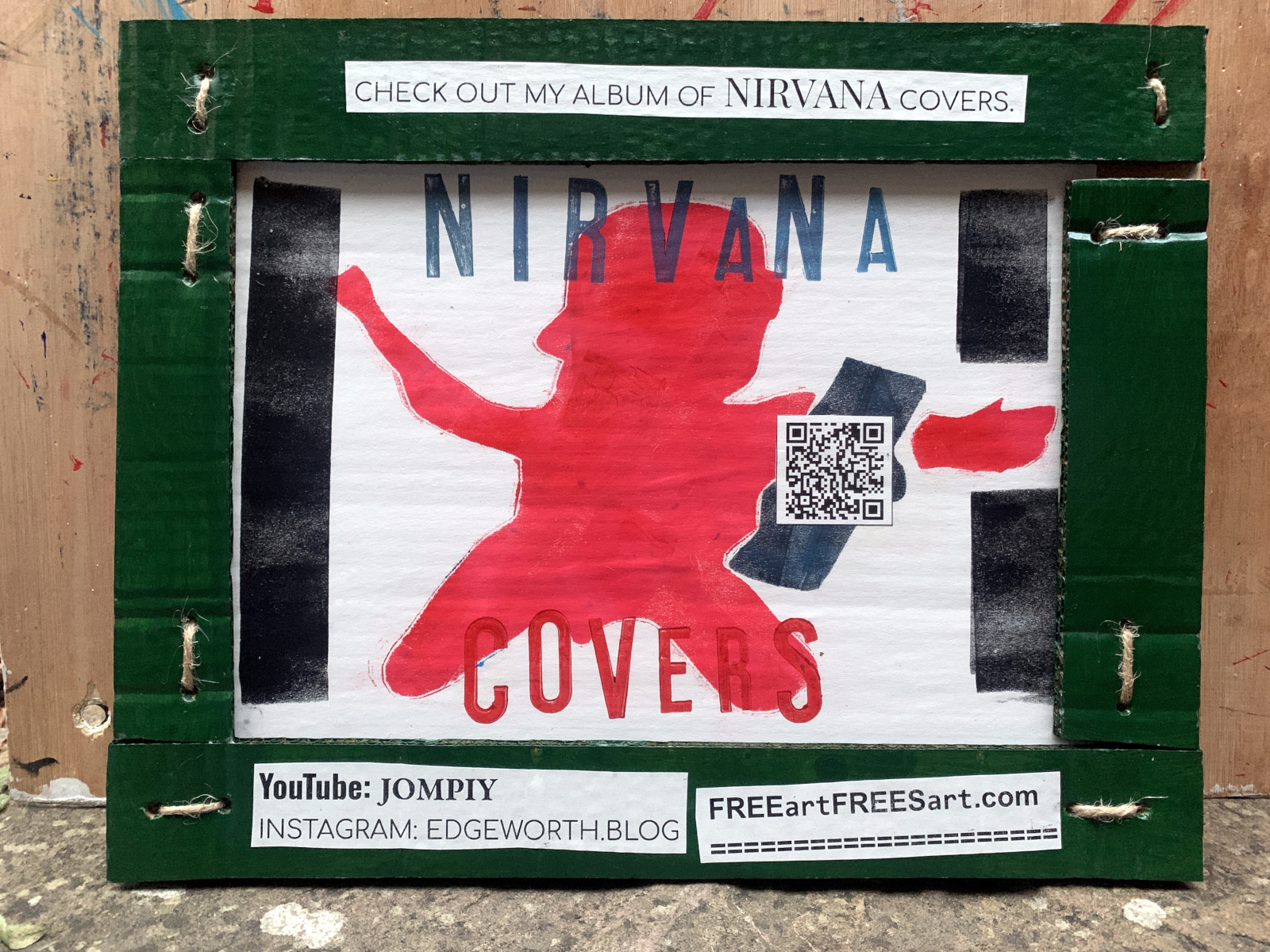 Original, signed acrylic paintings by me Edgeworth Johnstone. I wrote and PVA glued the text and QR code. I then PVA glued over the top to give the painting and text protection and a gloss finish. I individually hand stamped the lettering on the front where it says “EDGEWORTH” and “JOHNSTONE” using high quality Caligo printing inks. I then punched holes in the front with an awl and threaded garden twine string for the cardboard attachments, allowing the painting to be hung on the wall without needing any further attachments. Ready to hang. The cardboard is good quality, thick, double corrugated cardboard.