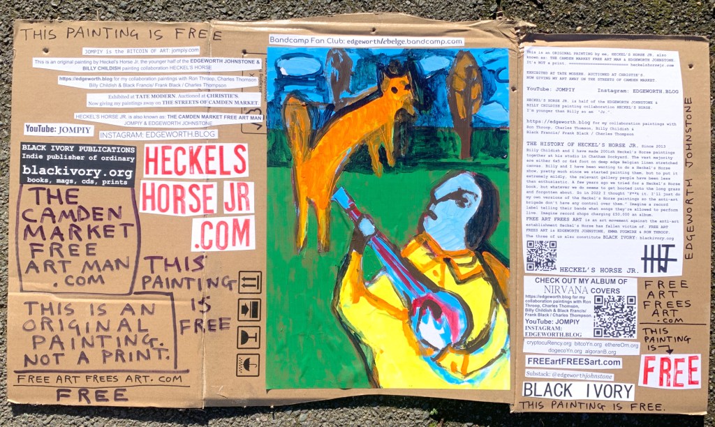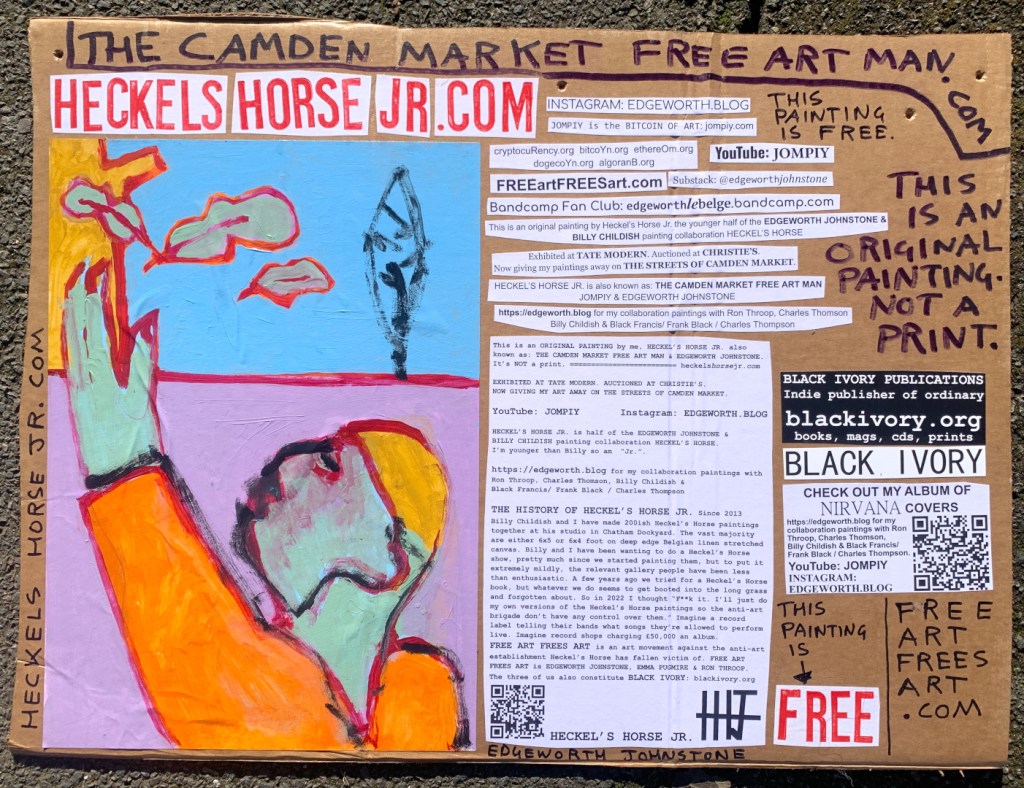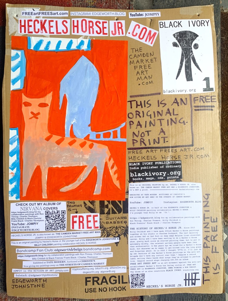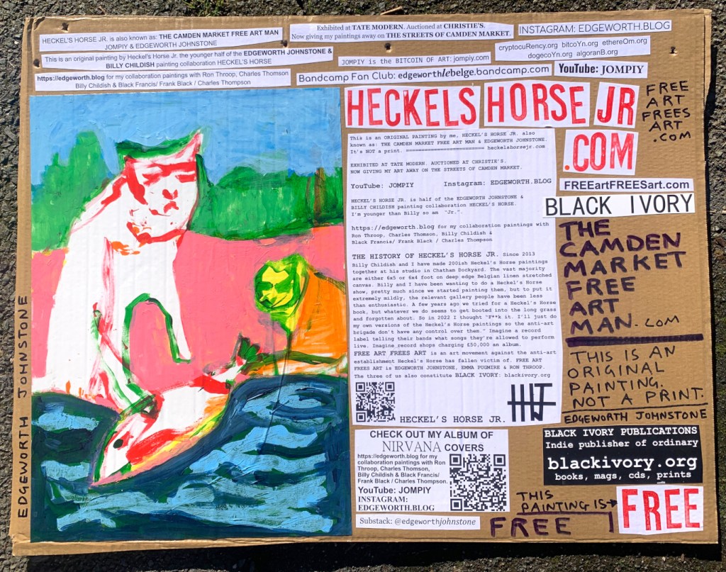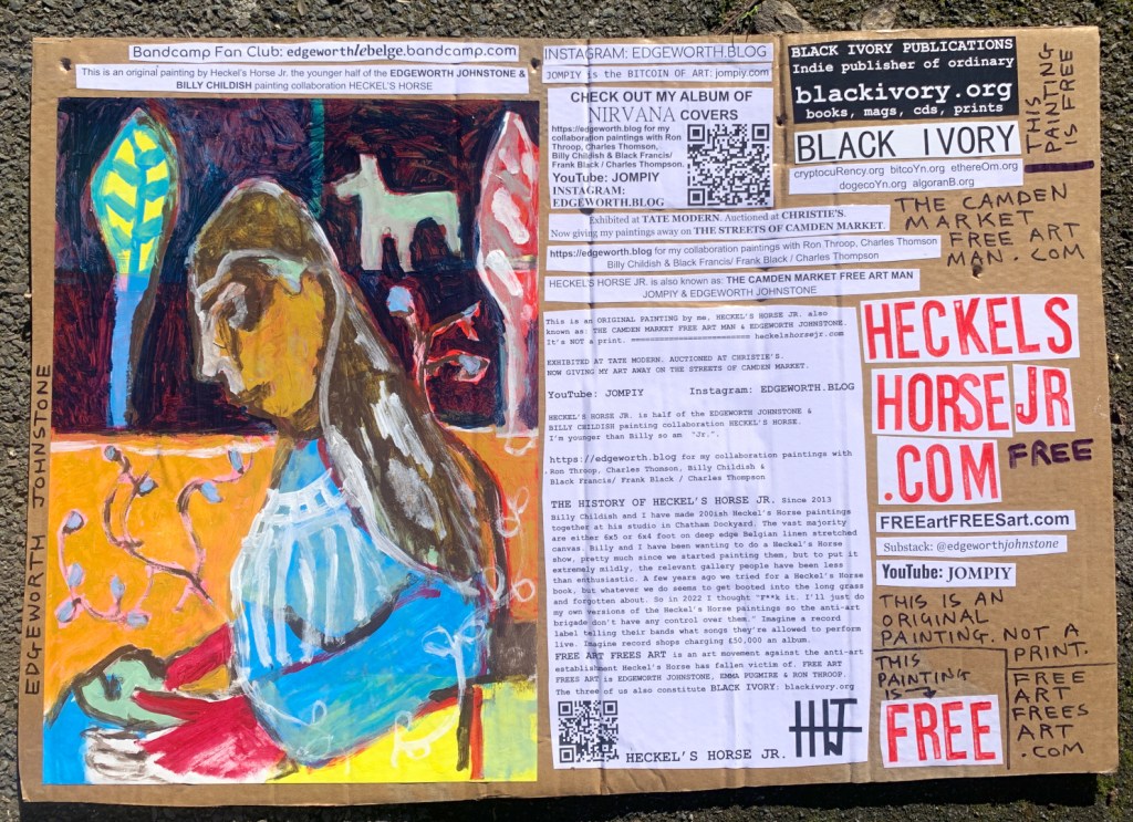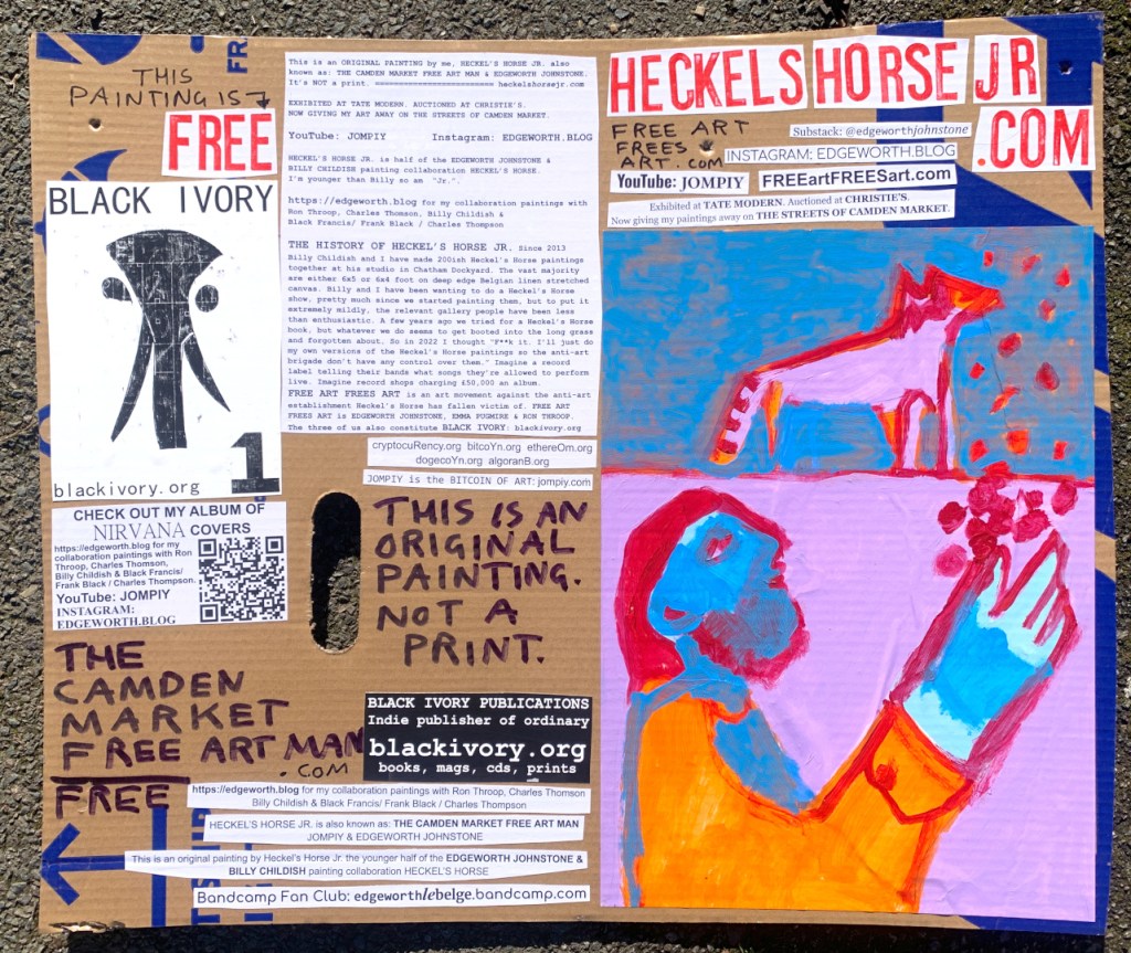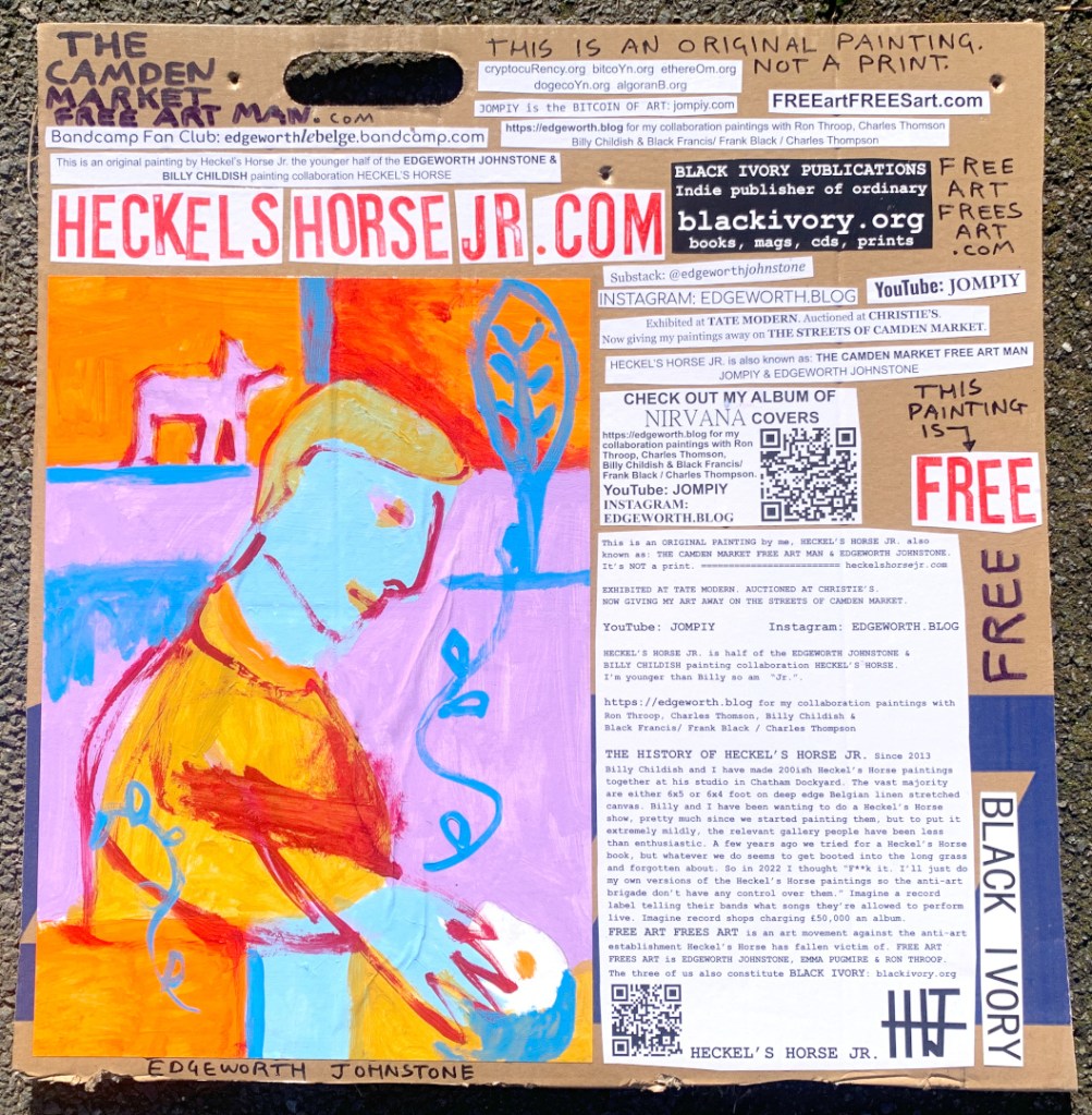 I make these 12 inch Nirvana LPs from second hand vinyl I buy in charity shops. Hand made monoprints on the album cover and face of the vinyl. They come in a clear crystal album sleeve, are signed and numbered and can be bought on my Etsy and Ebay shops. I also give them away at my Camden Market Free Art Man Political Protest Against Expensive Art. If you go to Camden and I’m not there, Moonlight Sculpture sell them on Maker’s Alley, near the Amy Winehouse statue and Cyberdog. See this Instagram post for a clearer picture of where that is: