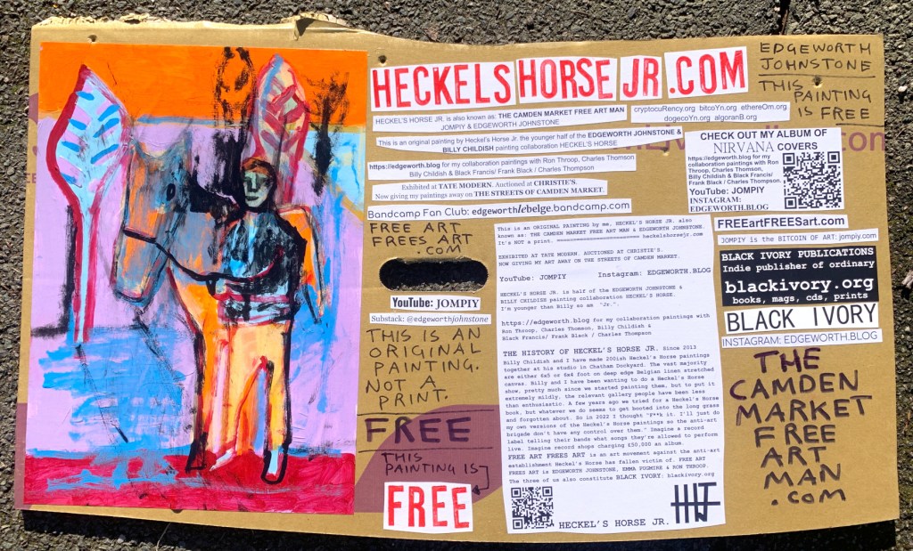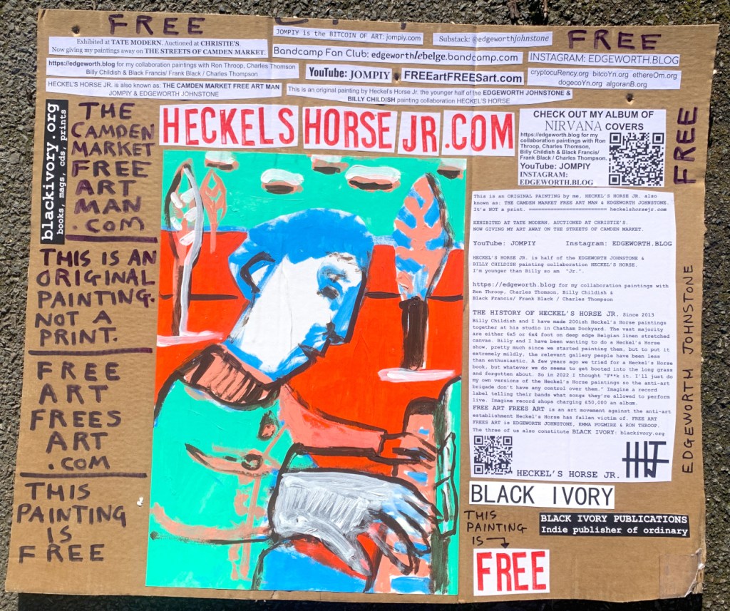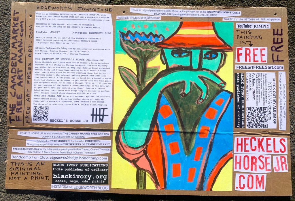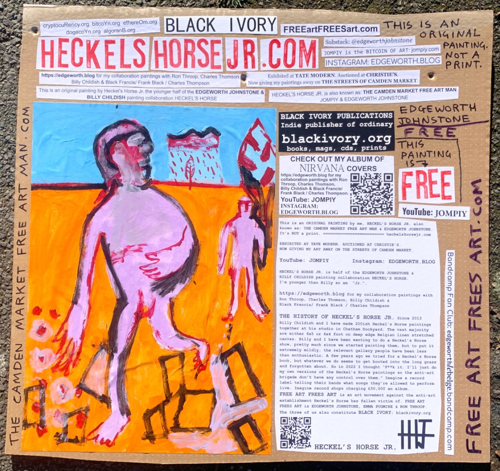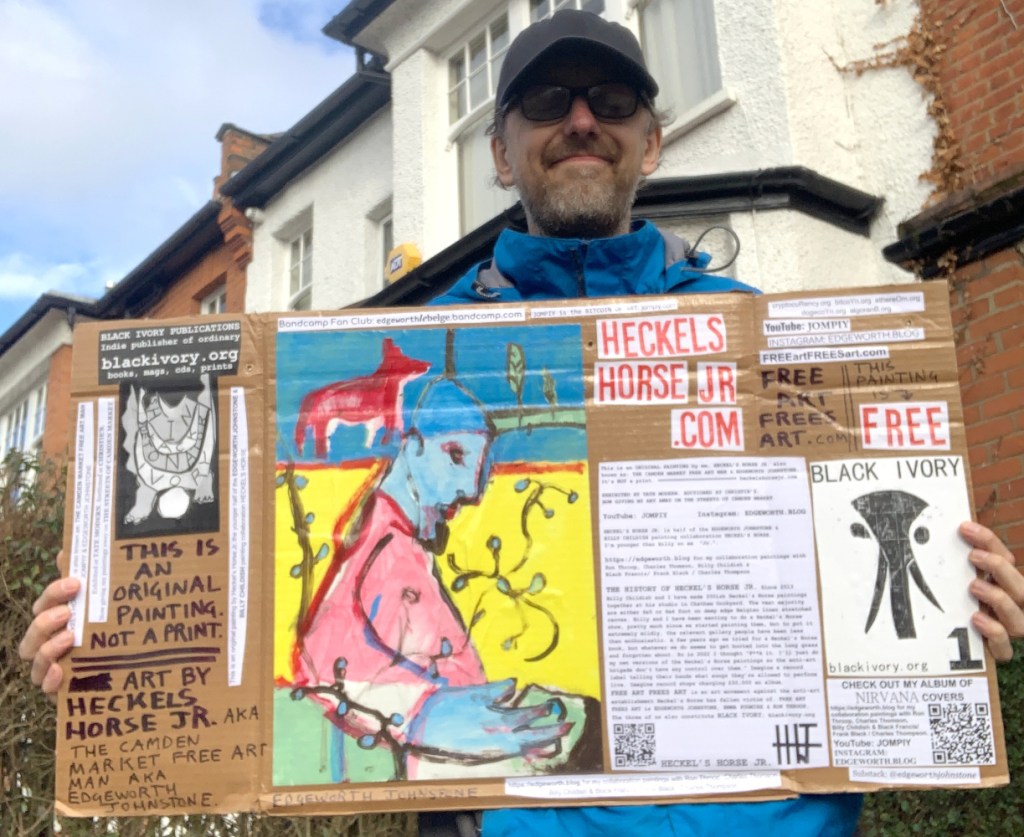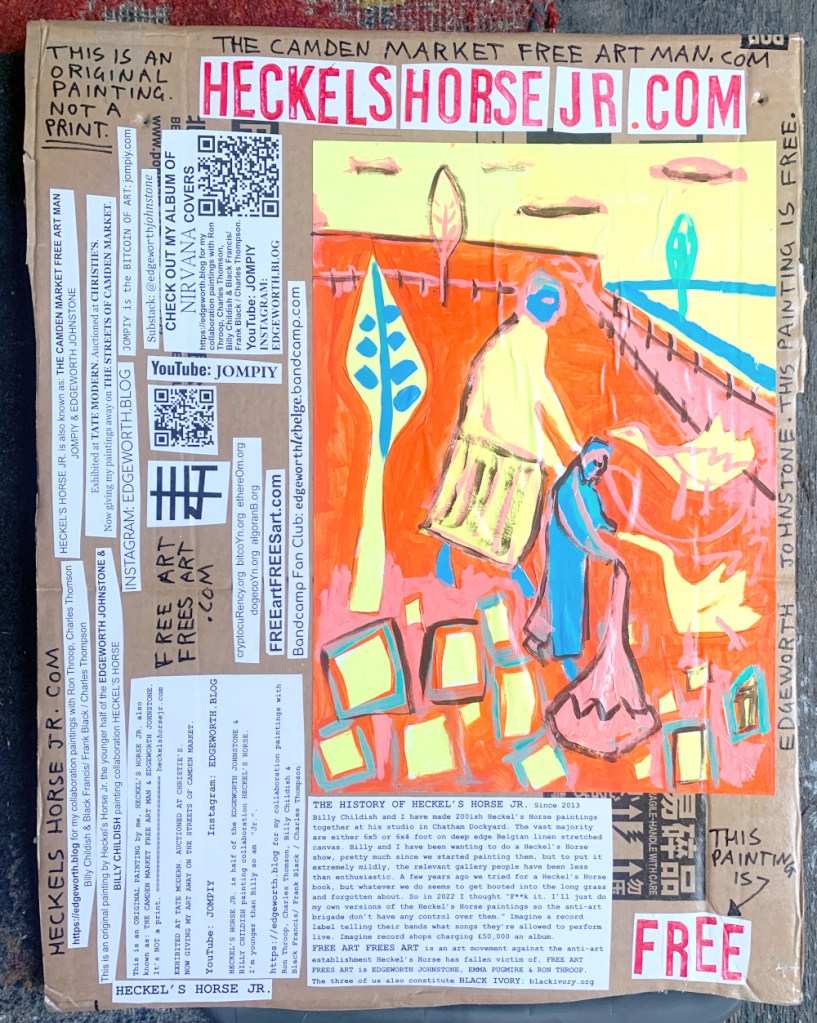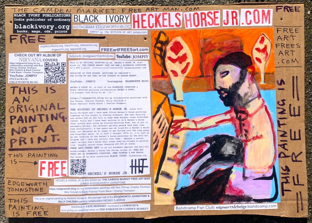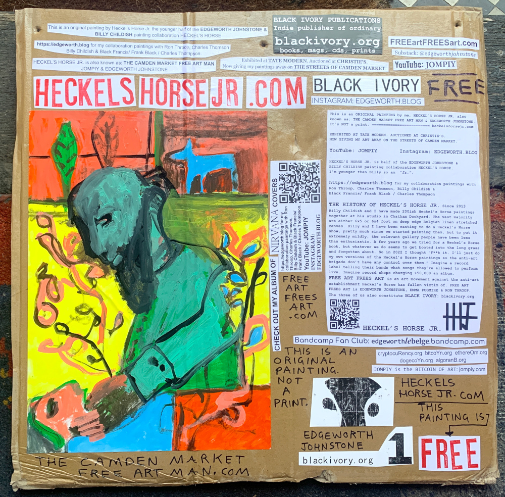 I make these 12 inch Nirvana LPs from second hand vinyl I buy in charity shops. Hand made monoprints on the album cover and face of the vinyl. They come in a clear crystal album sleeve, are signed and numbered and can be bought on my Etsy and Ebay shops. I also give them away at my Camden Market Free Art Man Political Protest Against Expensive Art. If you go to Camden and I’m not there, Moonlight Sculpture sell them on Maker’s Alley, near the Amy Winehouse statue and Cyberdog. See this Instagram post for a clearer picture of where that is: