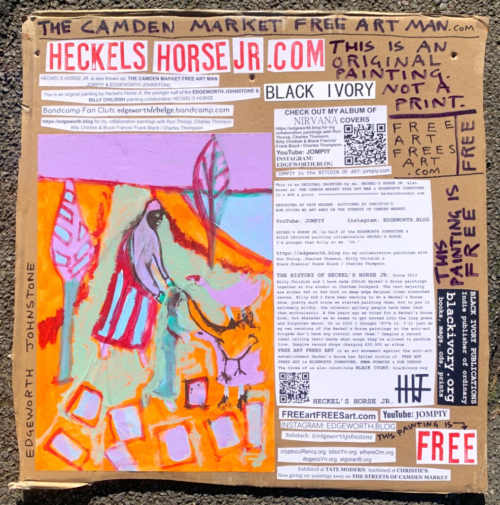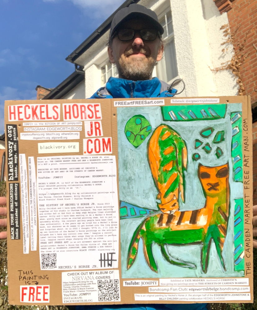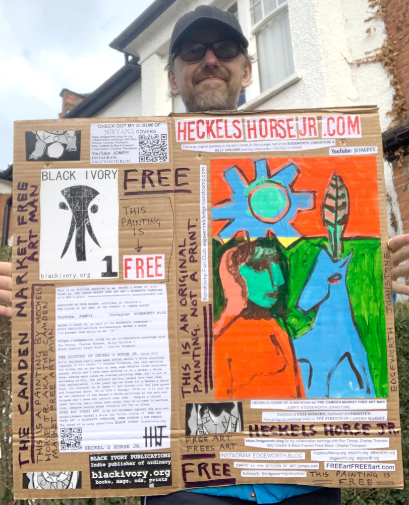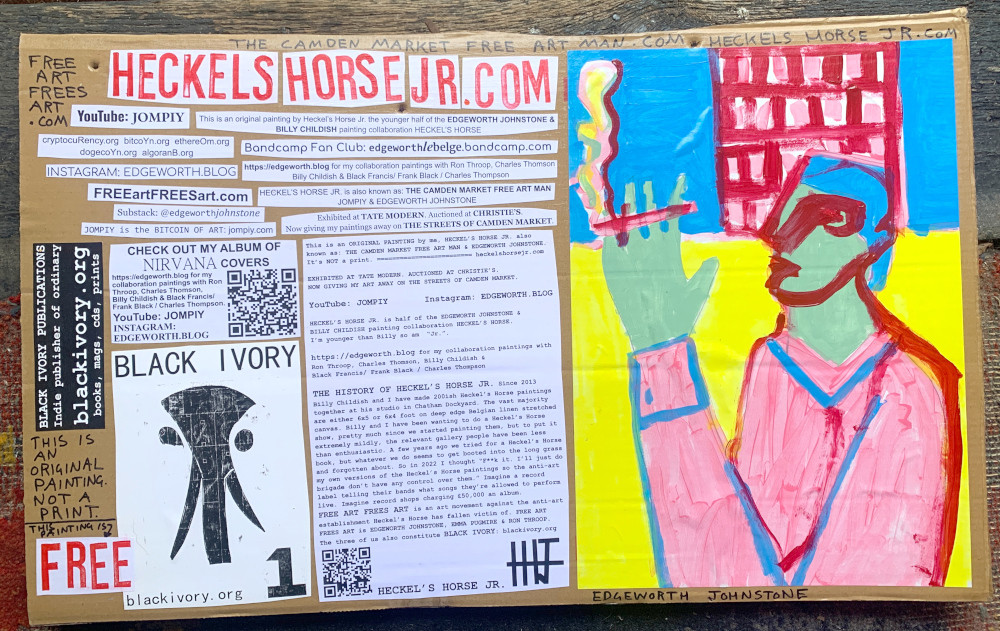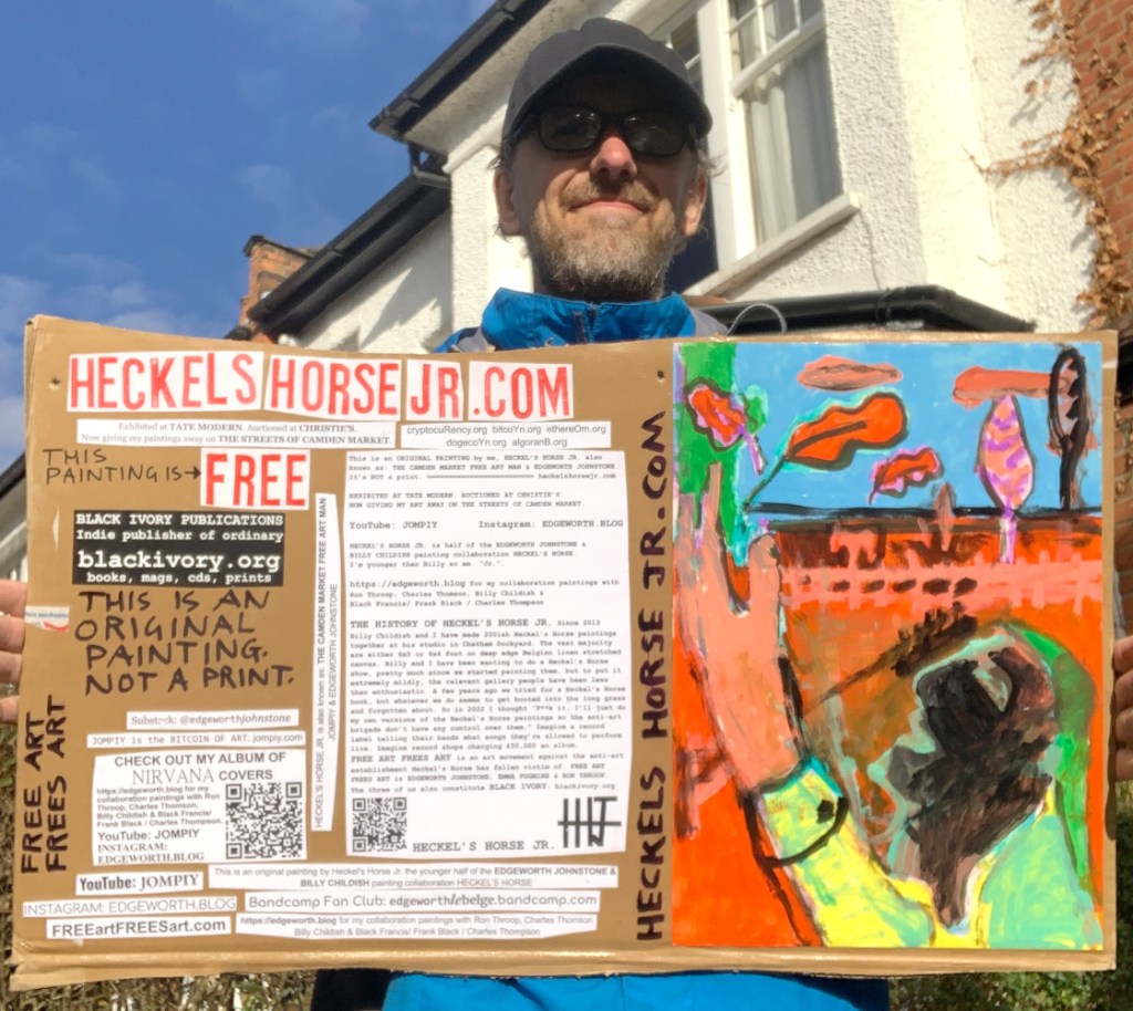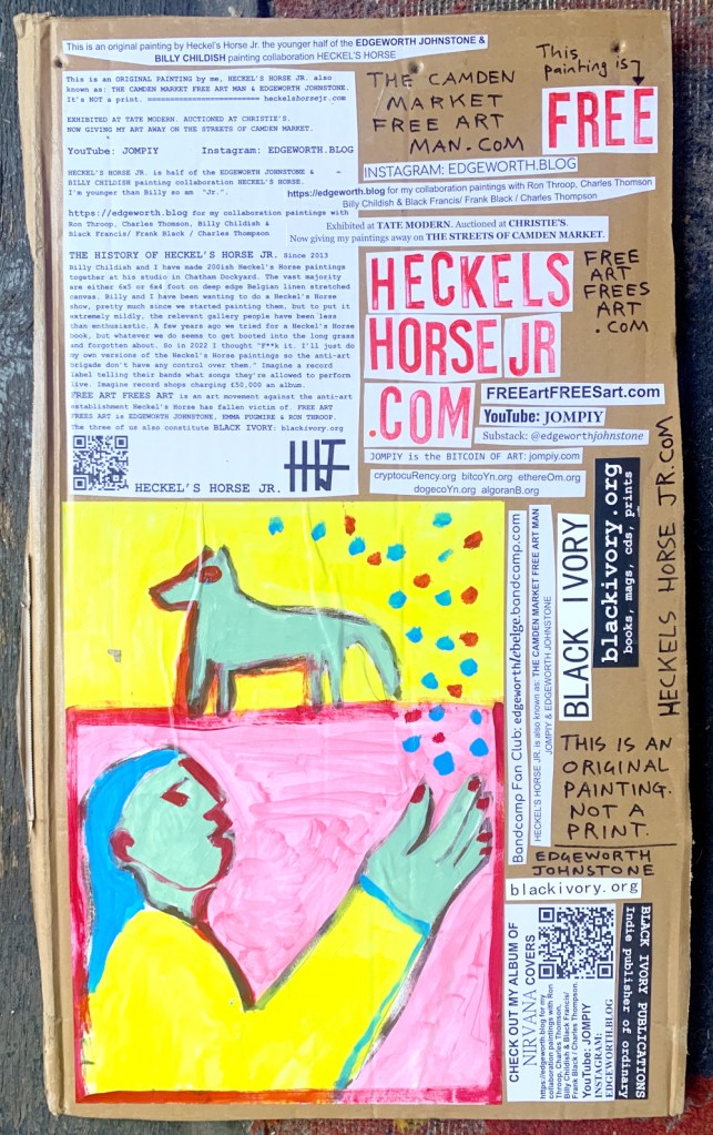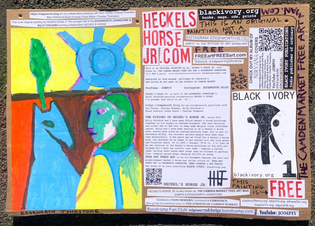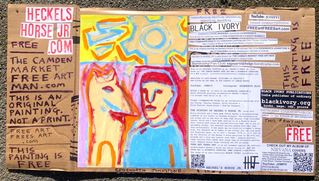 I make these 12 inch Nirvana LPs from second hand vinyl I buy in charity shops. Hand made monoprints on the album cover and face of the vinyl. They come in a clear crystal album sleeve, are signed and numbered and can be bought on my Etsy and Ebay shops. I also give them away at my Camden Market Free Art Man Political Protest Against Expensive Art. If you go to Camden and I’m not there, Moonlight Sculpture sell them on Maker’s Alley, near the Amy Winehouse statue and Cyberdog. See this Instagram post for a clearer picture of where that is: