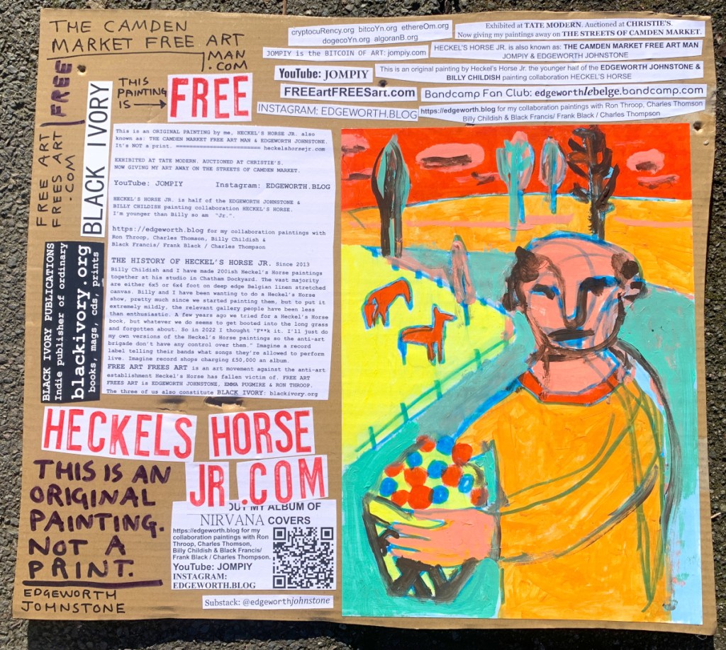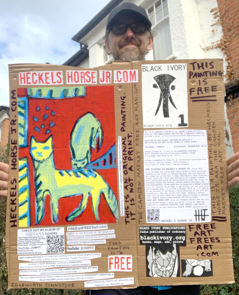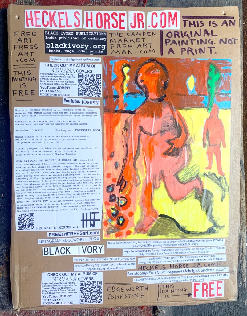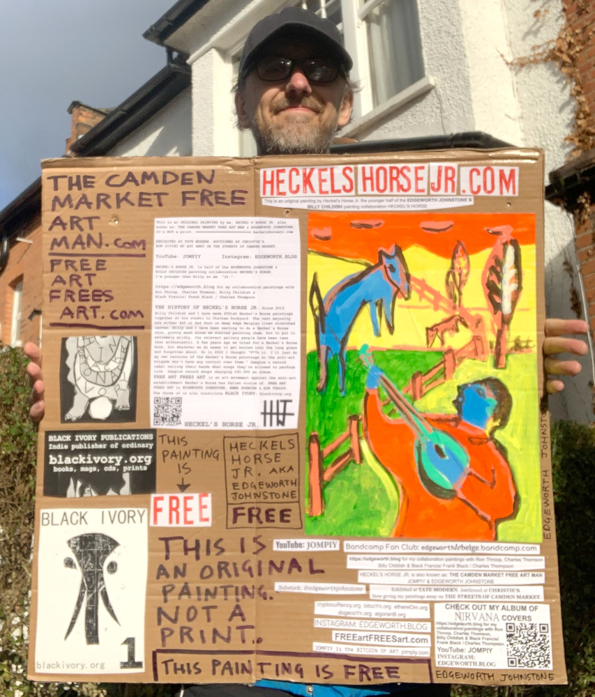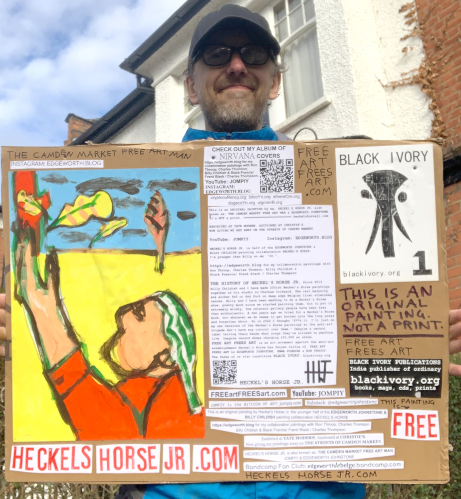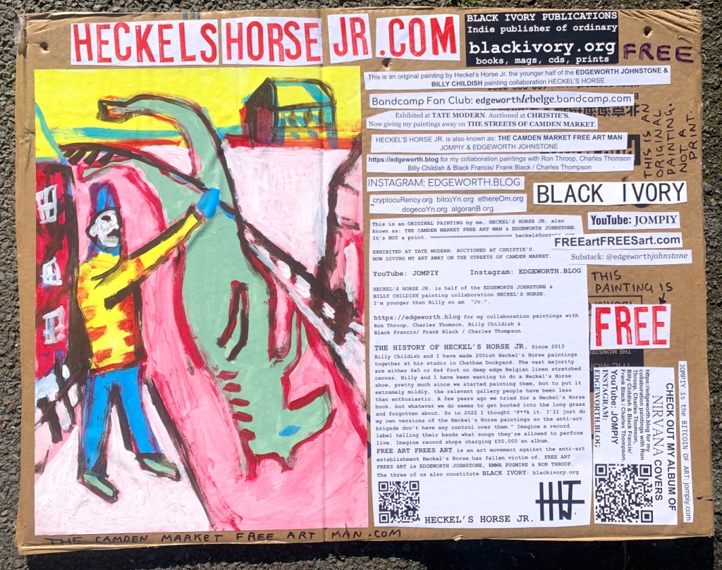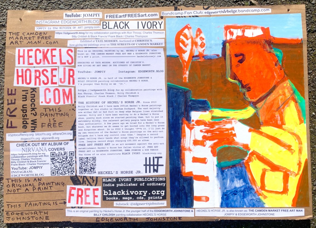 I make these 12 inch Nirvana LPs from second hand vinyl I buy in charity shops. Hand made monoprints on the album cover and face of the vinyl. They come in a clear crystal album sleeve, are signed and numbered and can be bought on my Etsy and Ebay shops. I also give them away at my Camden Market Free Art Man Political Protest Against Expensive Art. If you go to Camden and I’m not there, Moonlight Sculpture sell them on Maker’s Alley, near the Amy Winehouse statue and Cyberdog. See this Instagram post for a clearer picture of where that is: