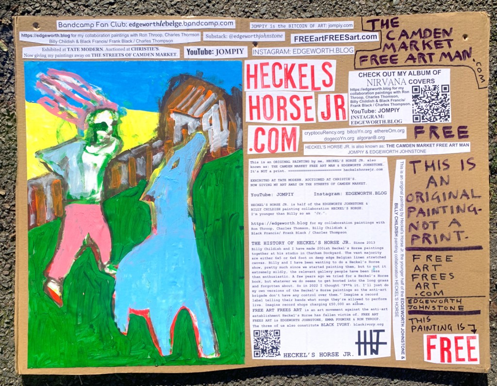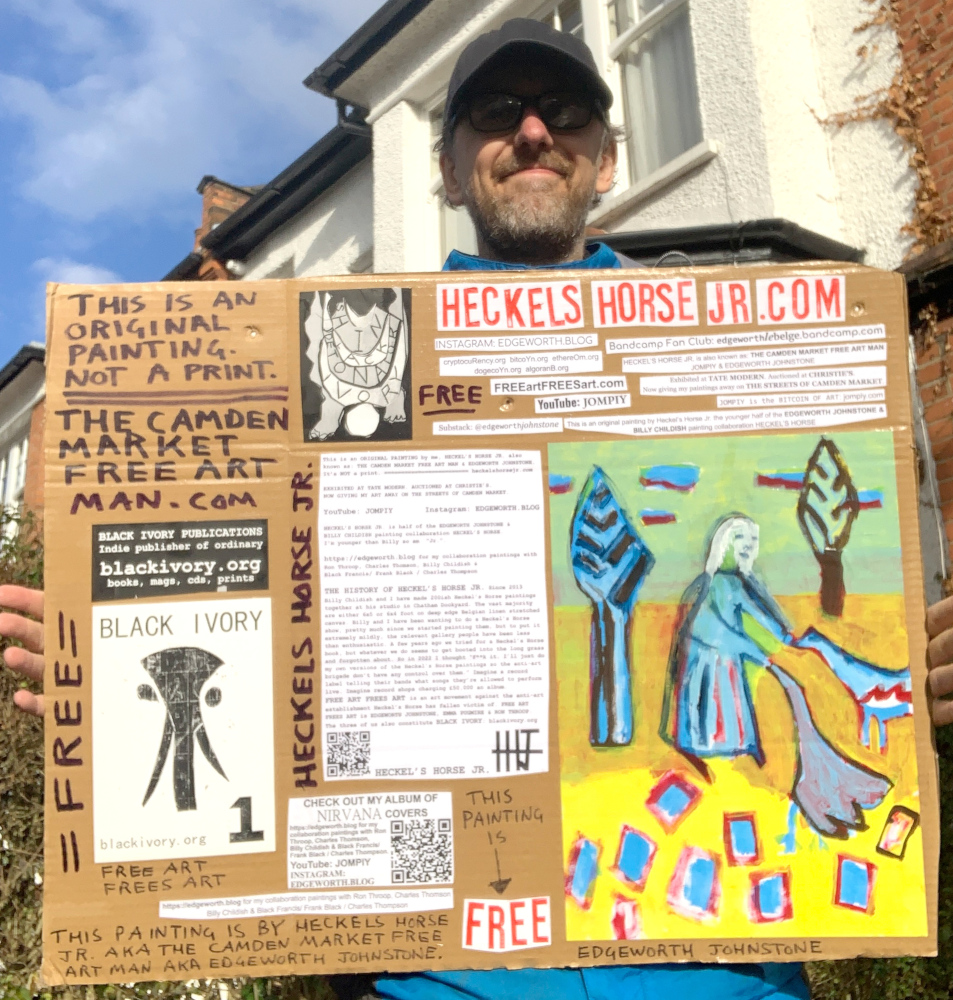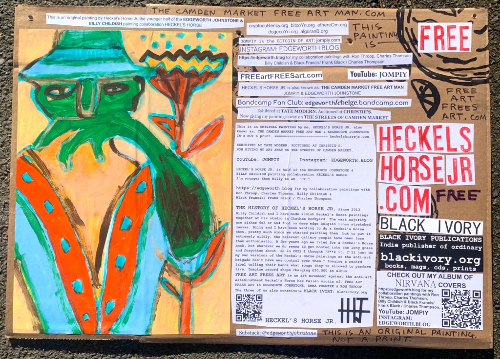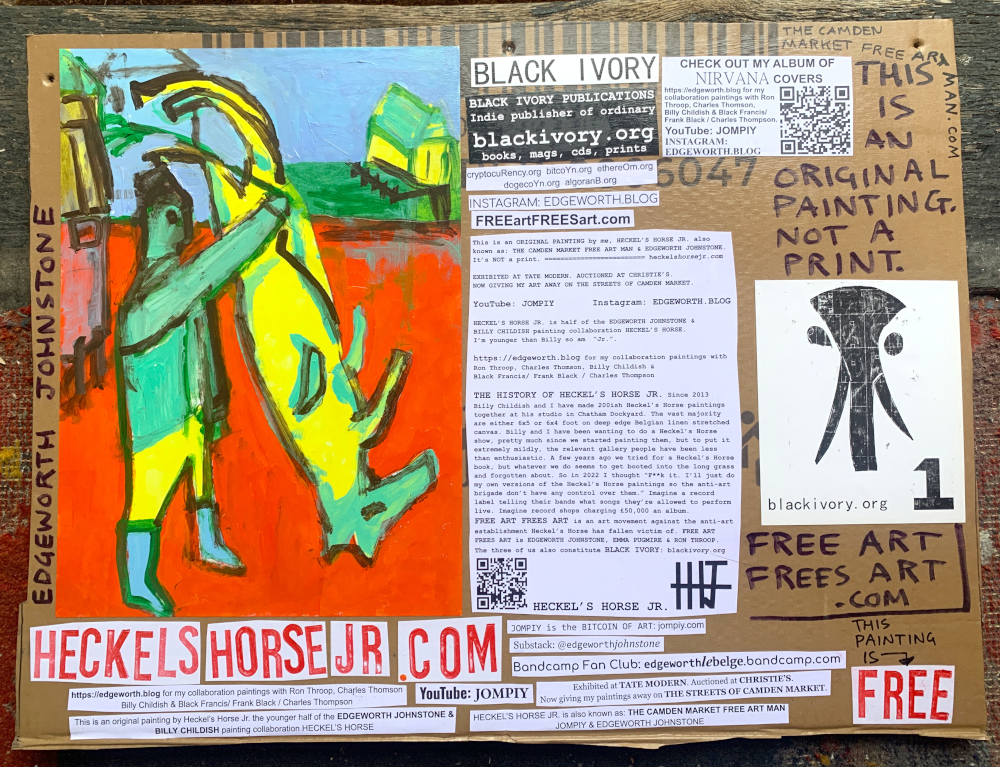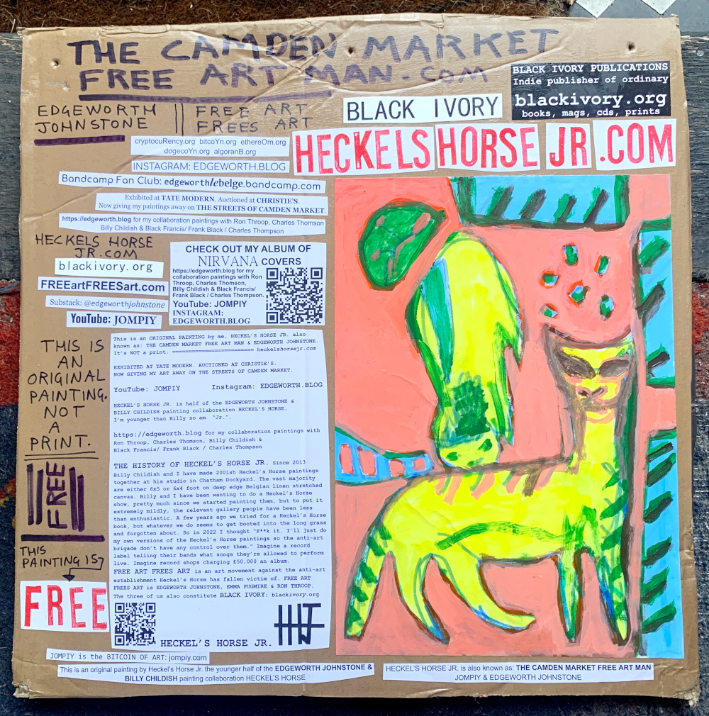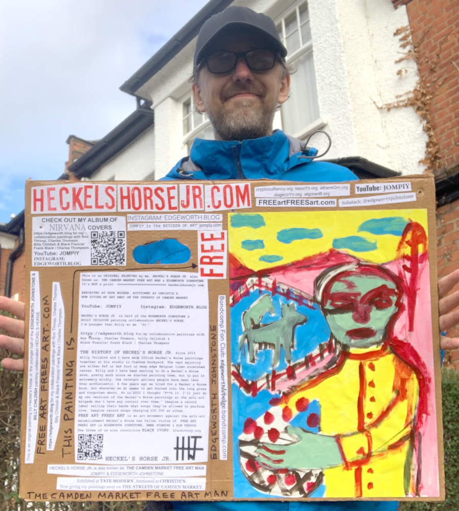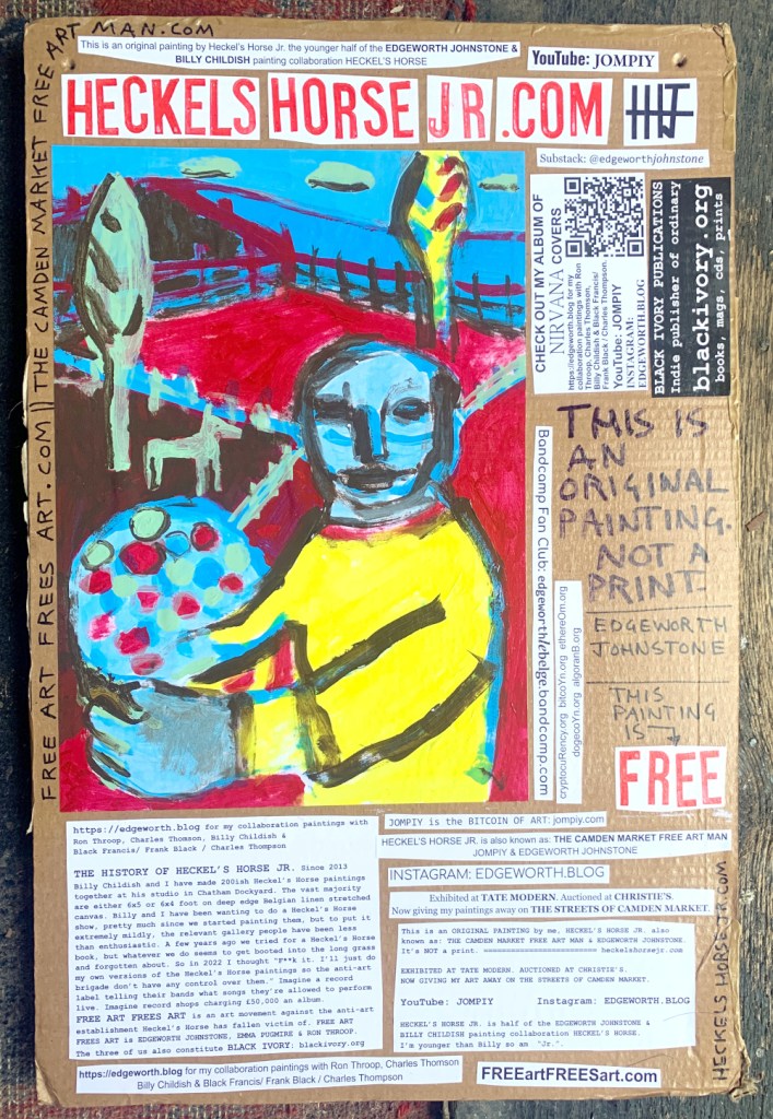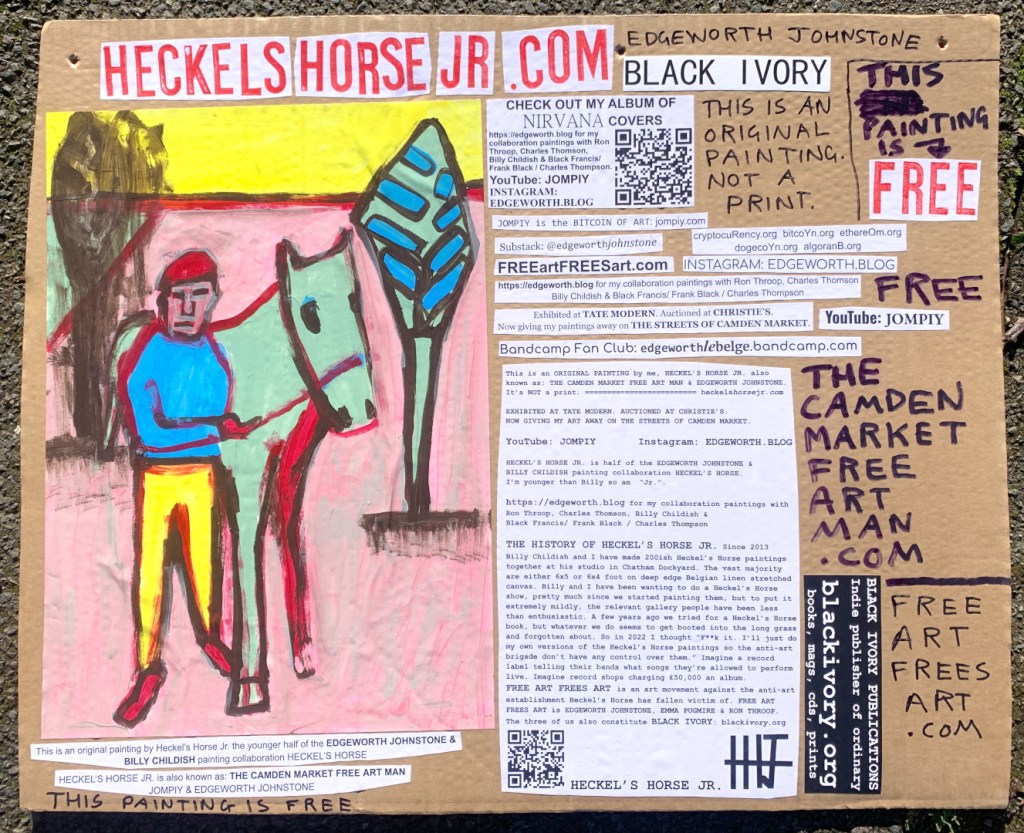 I make these 12 inch Nirvana LPs from second hand vinyl I buy in charity shops. Hand made monoprints on the album cover and face of the vinyl. They come in a clear crystal album sleeve, are signed and numbered and can be bought on my Etsy and Ebay shops. I also give them away at my Camden Market Free Art Man Political Protest Against Expensive Art. If you go to Camden and I’m not there, Moonlight Sculpture sell them on Maker’s Alley, near the Amy Winehouse statue and Cyberdog. See this Instagram post for a clearer picture of where that is: