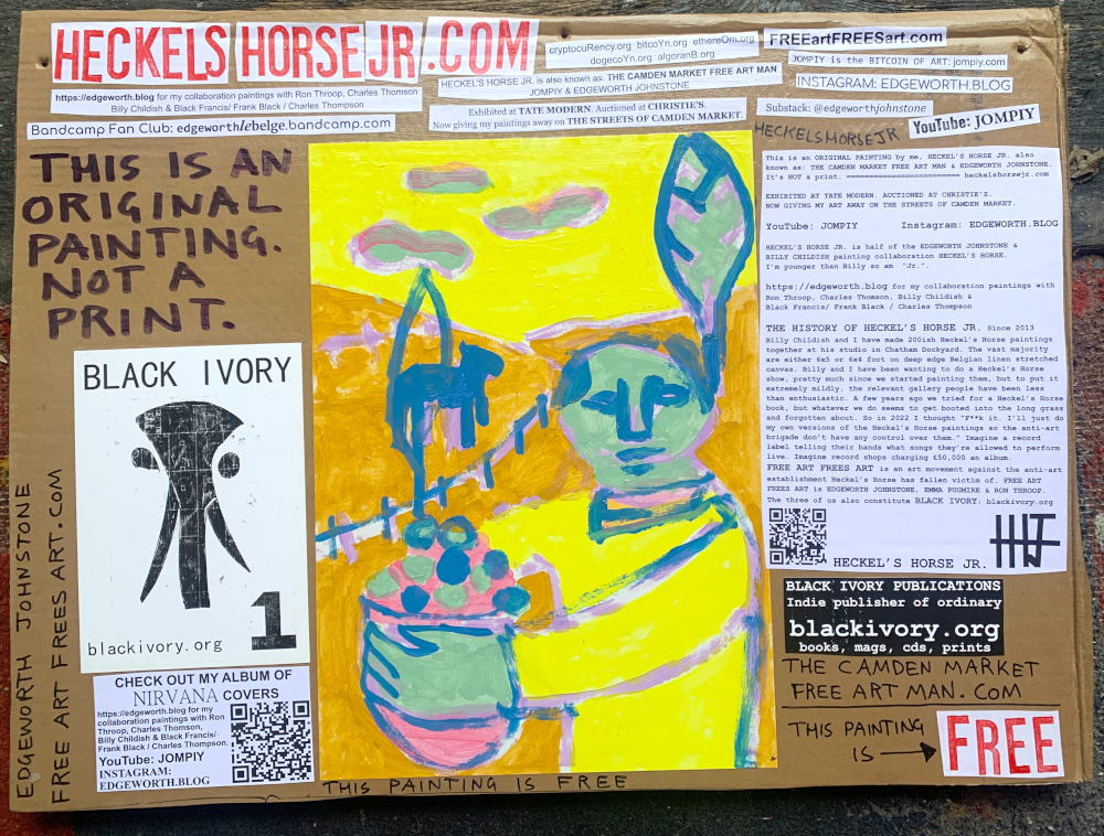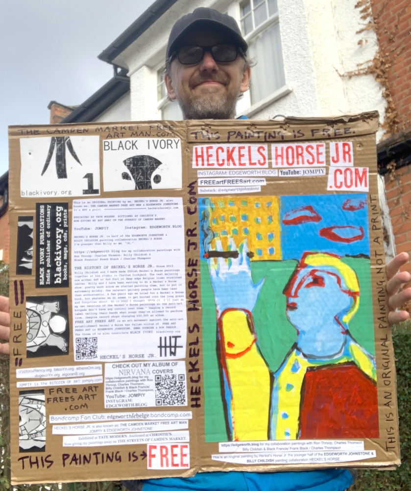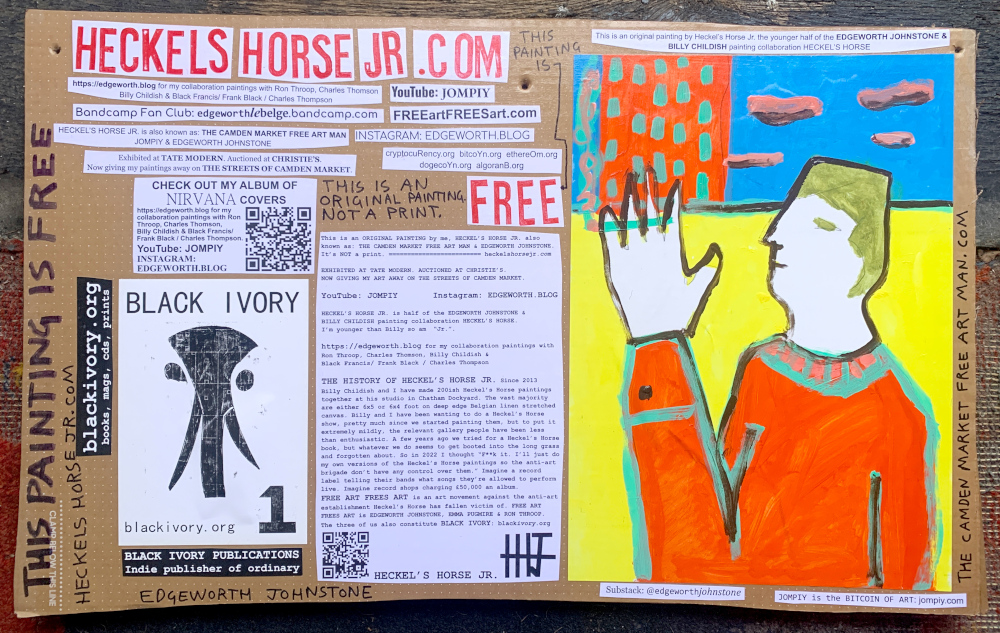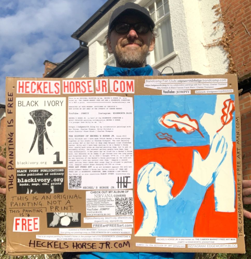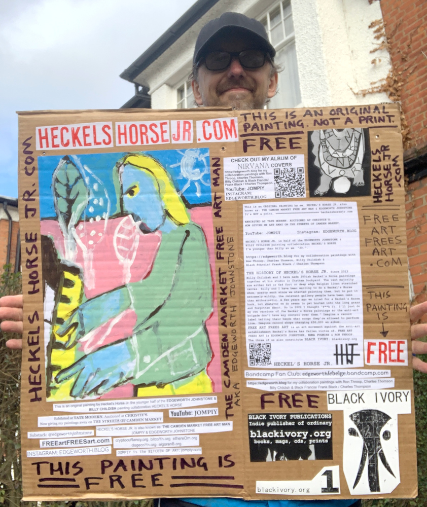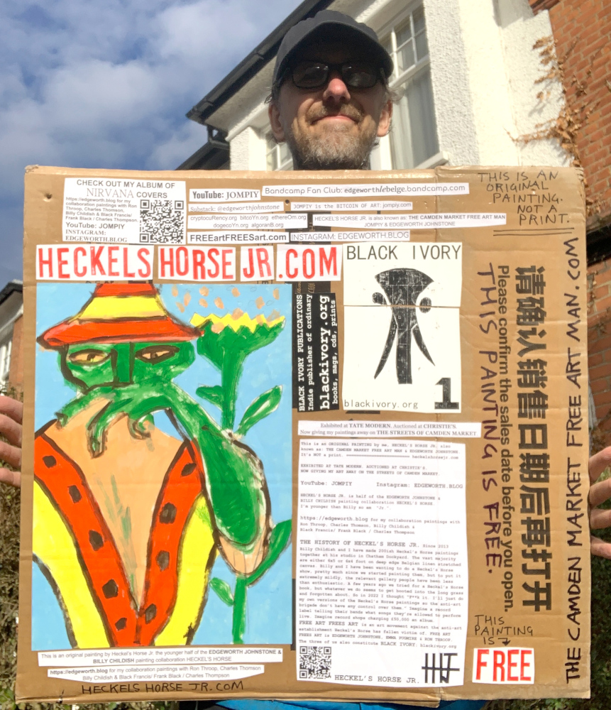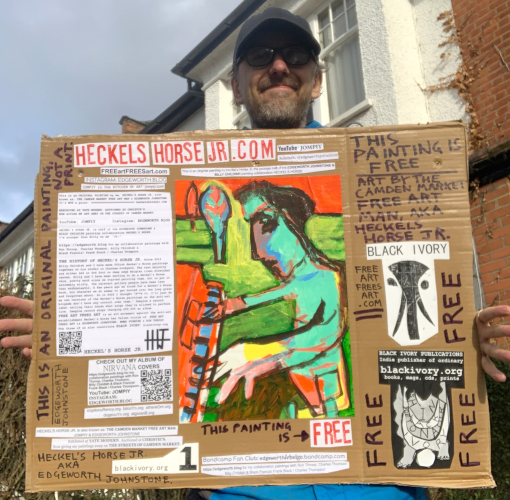 I make these 12 inch Nirvana LPs from second hand vinyl I buy in charity shops. Hand made monoprints on the album cover and face of the vinyl. They come in a clear crystal album sleeve, are signed and numbered and can be bought on my Etsy and Ebay shops. I also give them away at my Camden Market Free Art Man Political Protest Against Expensive Art. If you go to Camden and I’m not there, Moonlight Sculpture sell them on Maker’s Alley, near the Amy Winehouse statue and Cyberdog. See this Instagram post for a clearer picture of where that is: